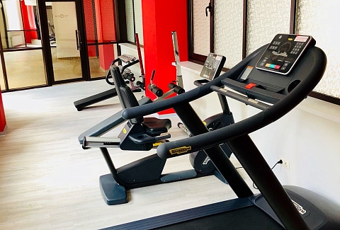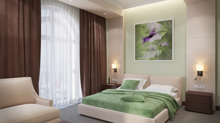 В номере: вешалка, диван, зеркало, кровать двуспальная, прикроватные тумбочки, стол, стулья, шкаф, кондиционер, набор посуды, сейф, телевизор, телефон, холодильник, чайный набор посуды, электрочайник