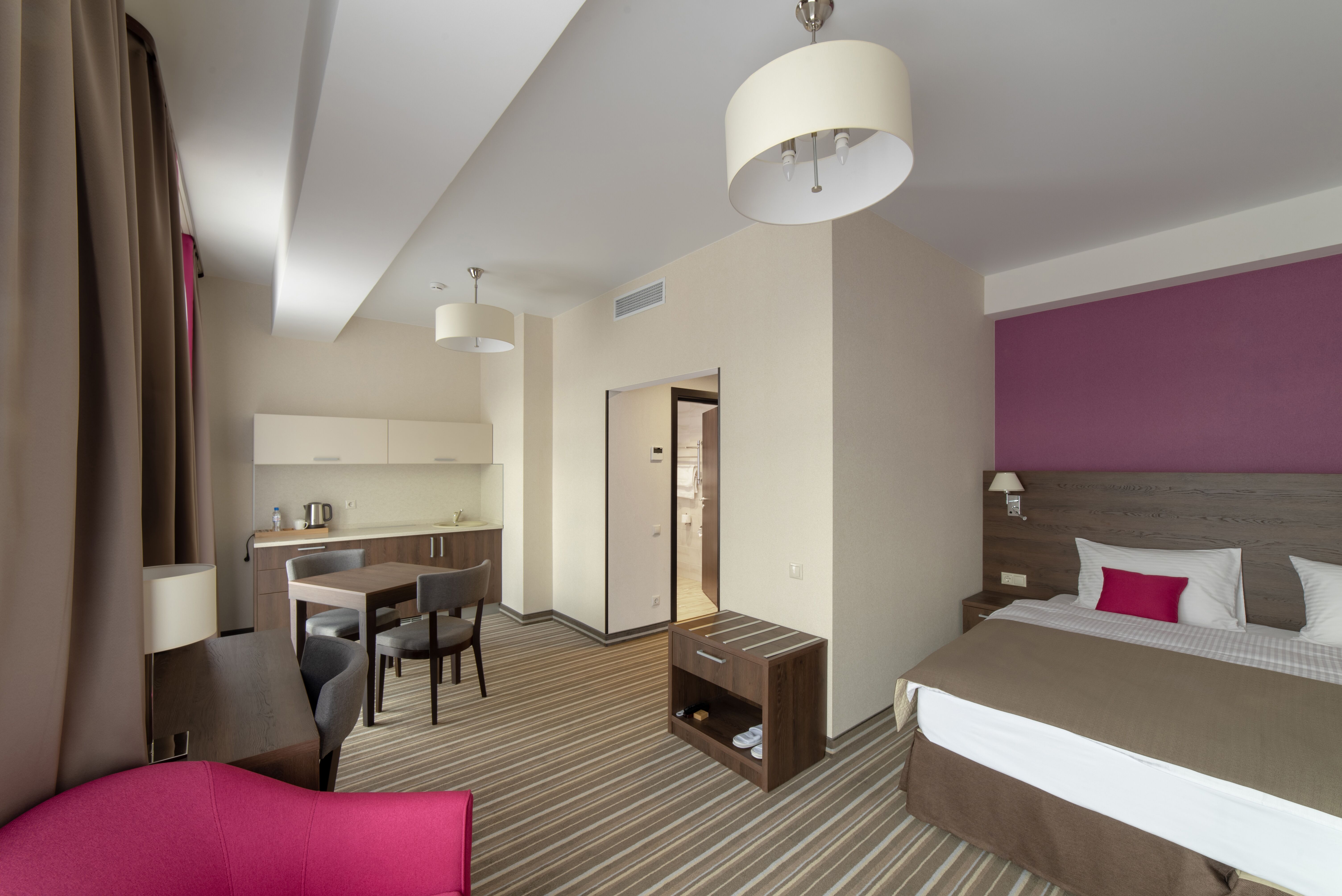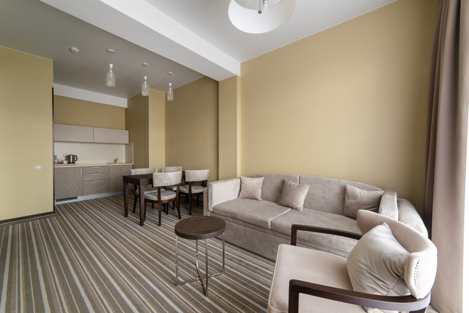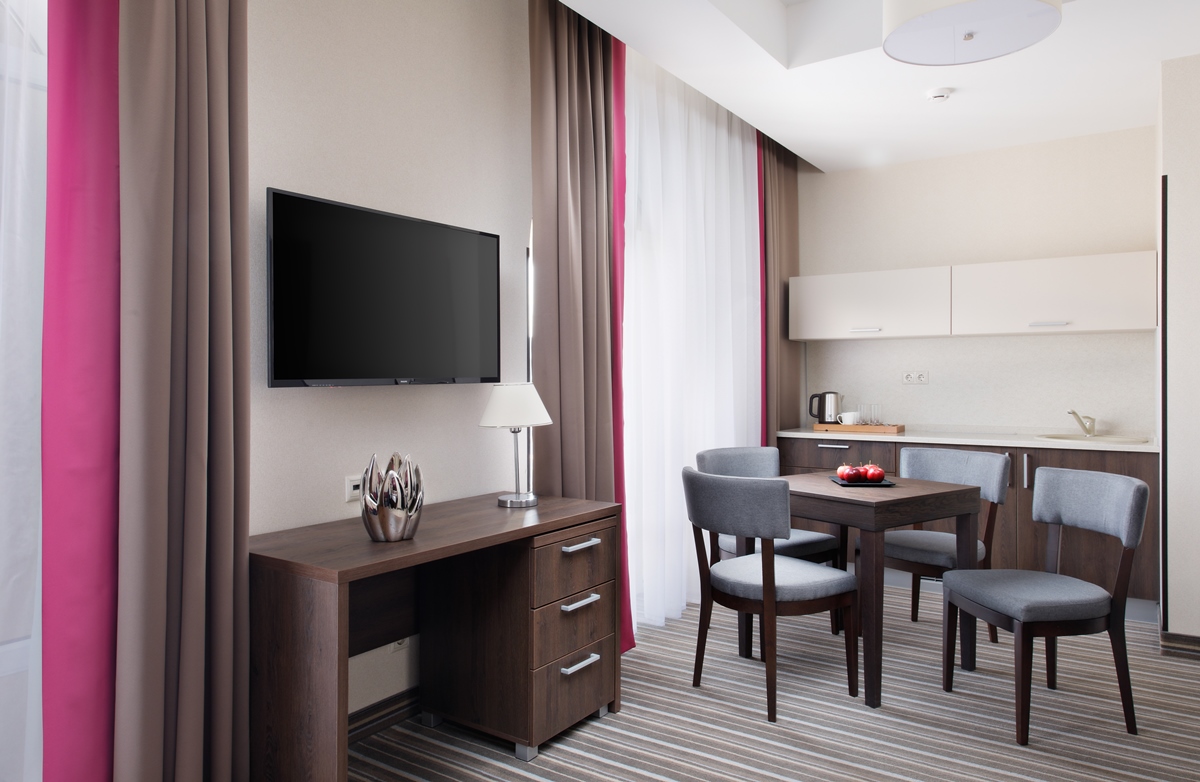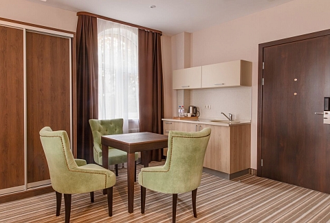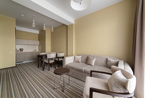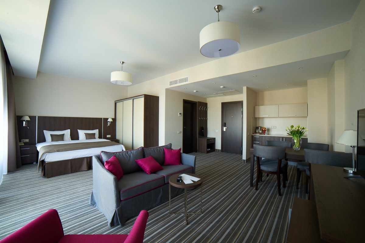 В номере: вешалка, диван, зеркало, кресло, кровать двуспальная, кухонная мебель, прикроватные тумбочки, стол, стулья, шкаф, кондиционер, сейф, телевизор, телефон, холодильник, чайный набор посуды, электрочайник