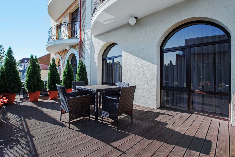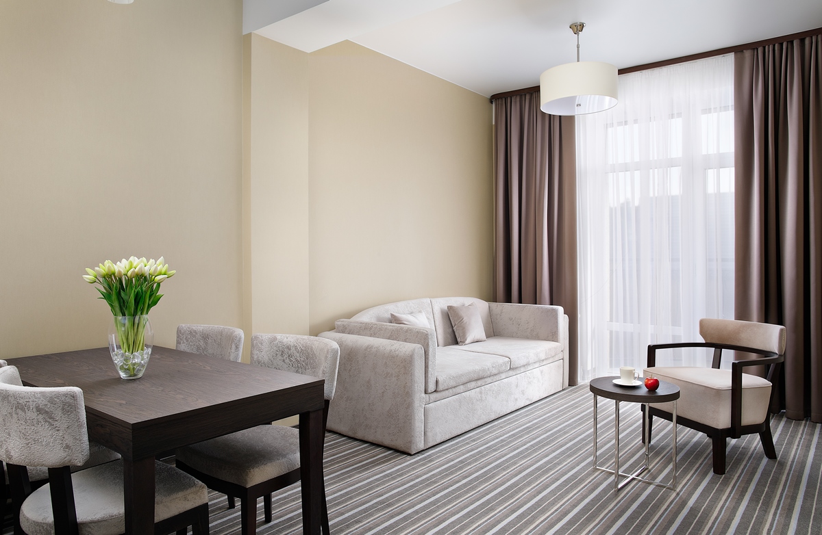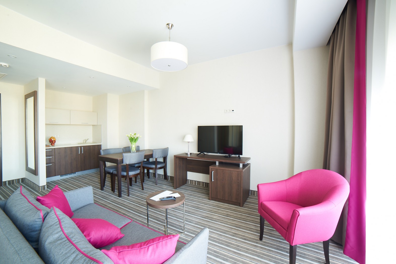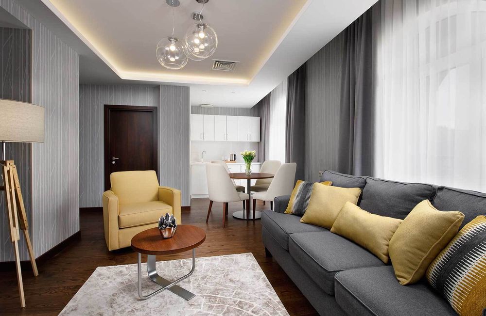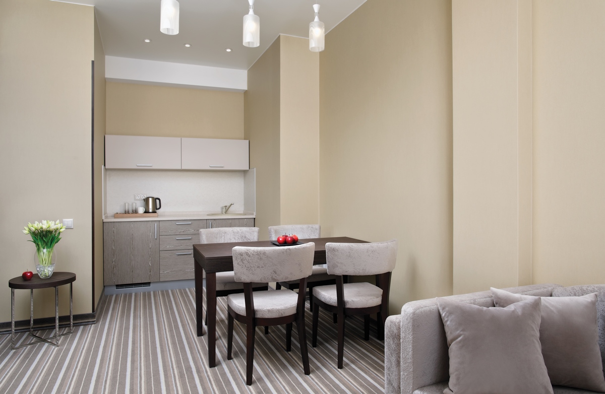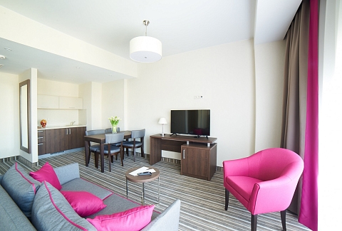 В номере: вешалка, диван, зеркало, кресло, кровать двуспальная, кухонная мебель, прикроватные тумбочки, стол, стулья, шкаф, кондиционер, сейф, телевизор, телефон, холодильник, чайный набор посуды, электрочайник