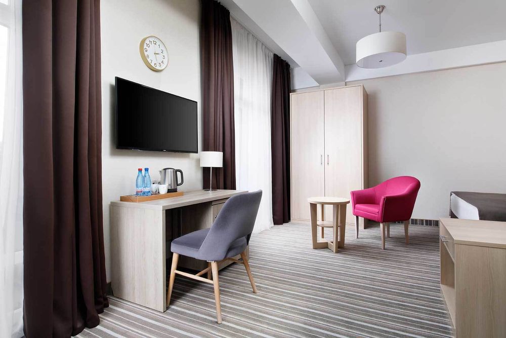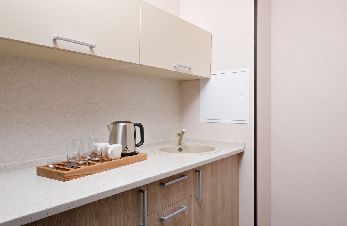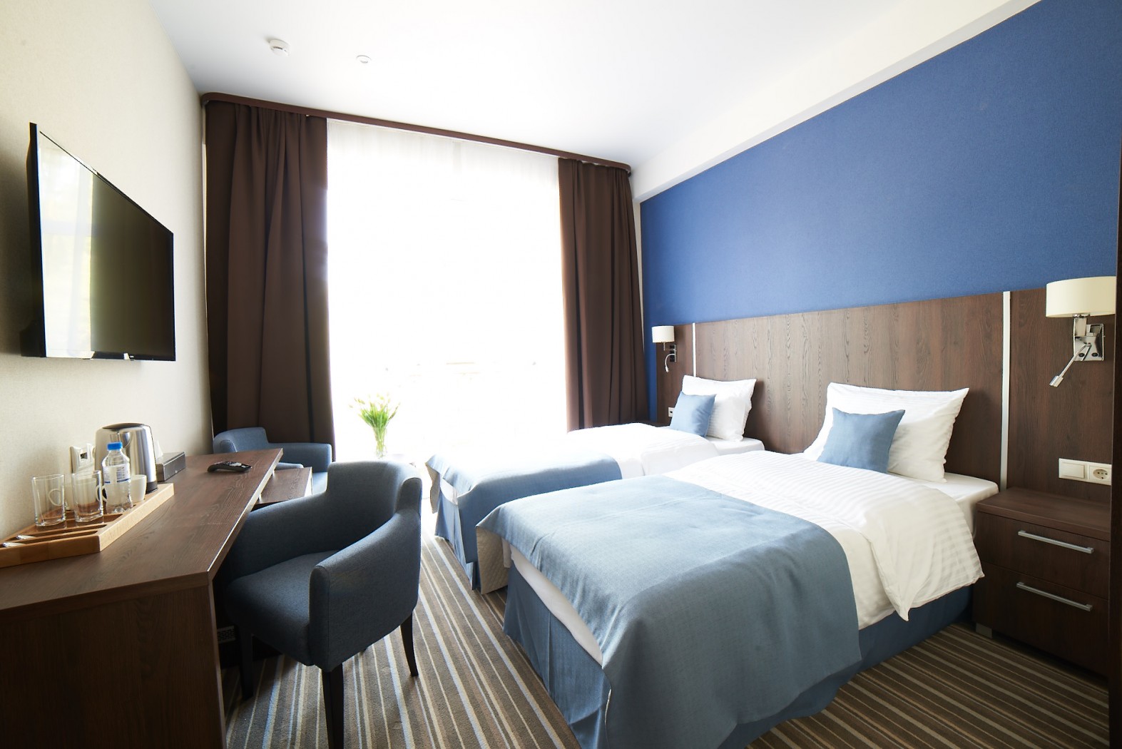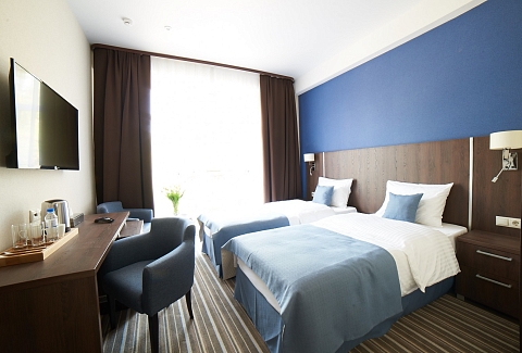 В номере: вешалка, зеркало, кресло, кровати односпальные, прикроватные тумбочки, стол, стул, шкаф, кондиционер, микроволновая печь, сейф, телевизор, телефон, холодильник, чайный набор посуды, электрочайник