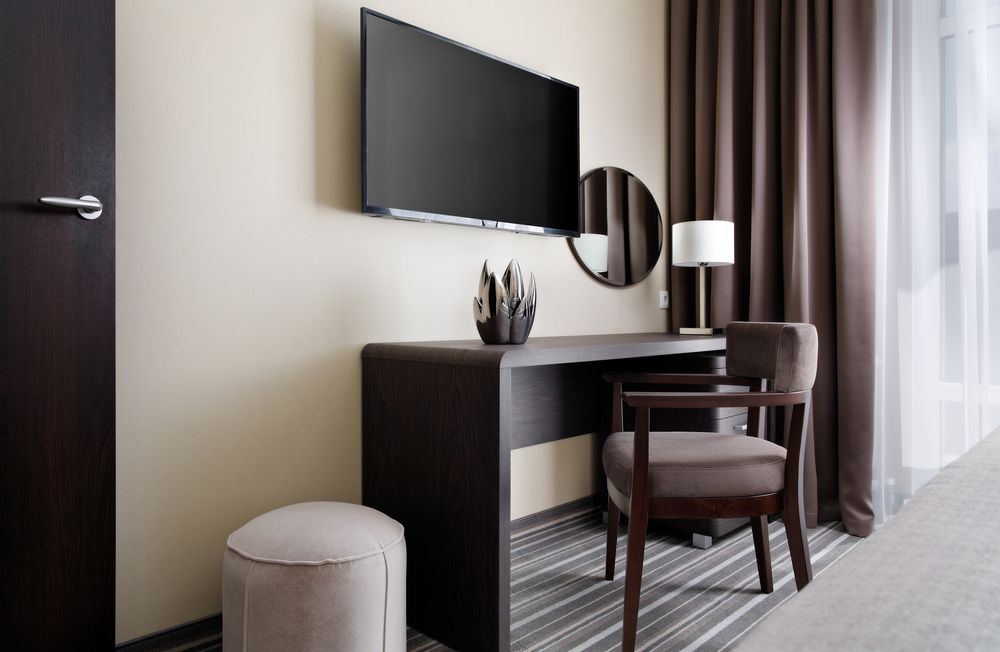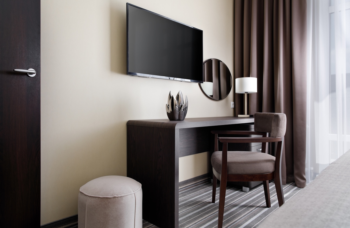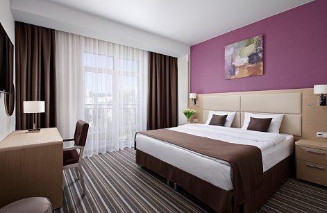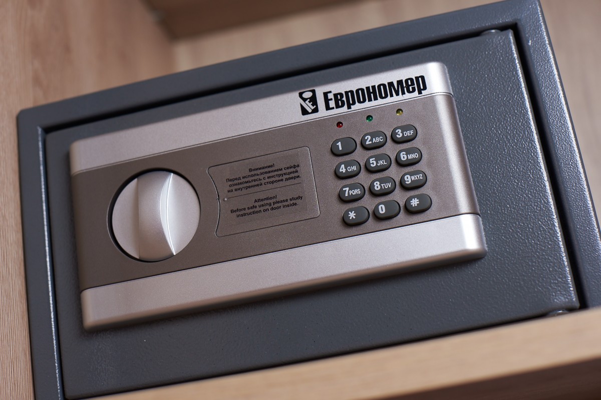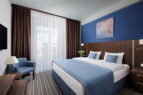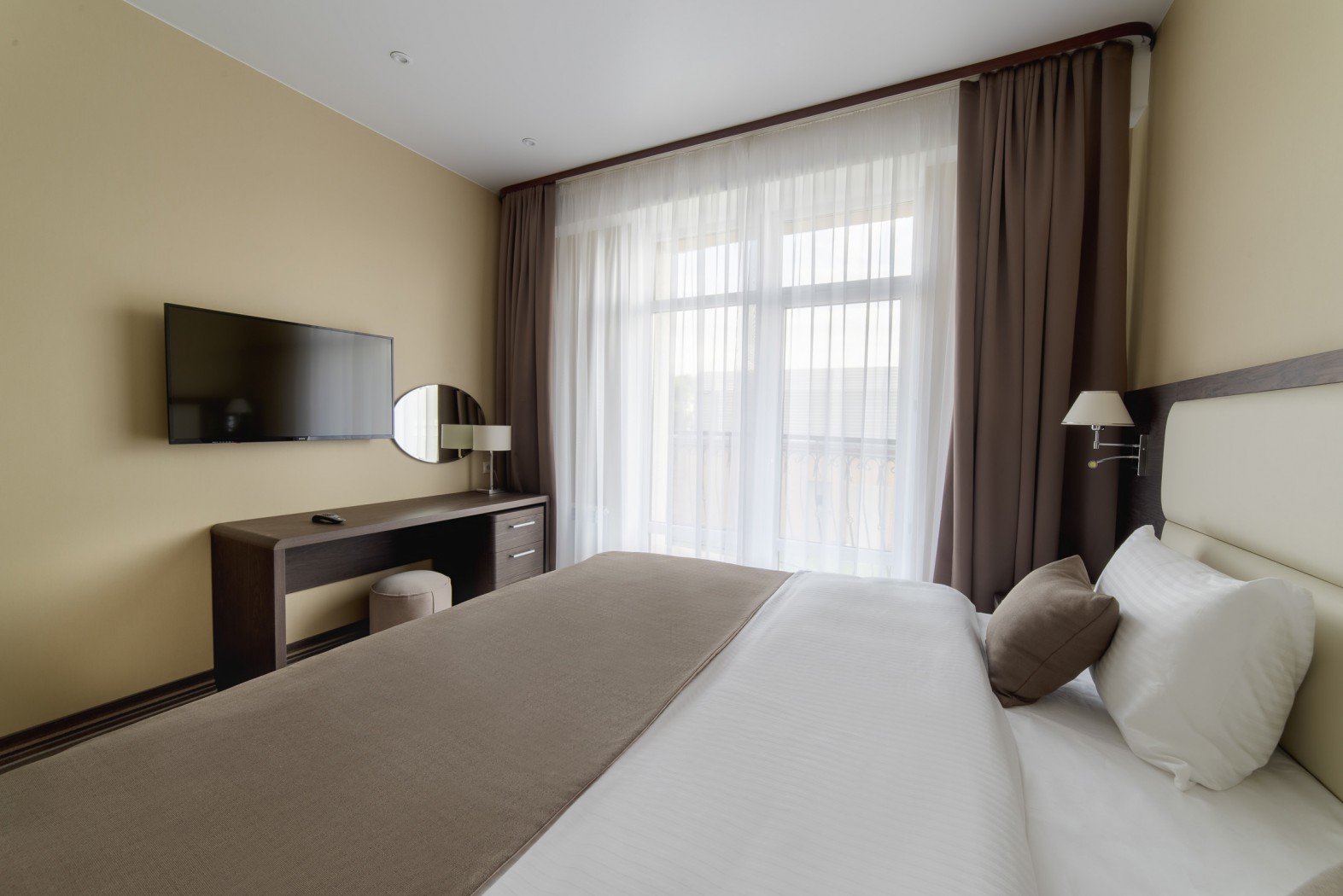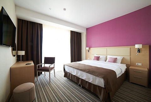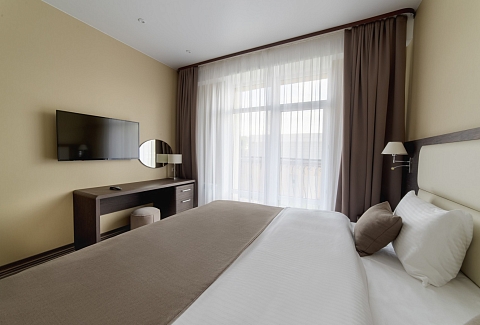 В номере: зеркало, кресла, кровать двуспальная, прикроватные тумбочки, стол, стулья, шкаф, кондиционер, сейф, телевизор, телефон, холодильник, чайный набор посуды, электрочайник