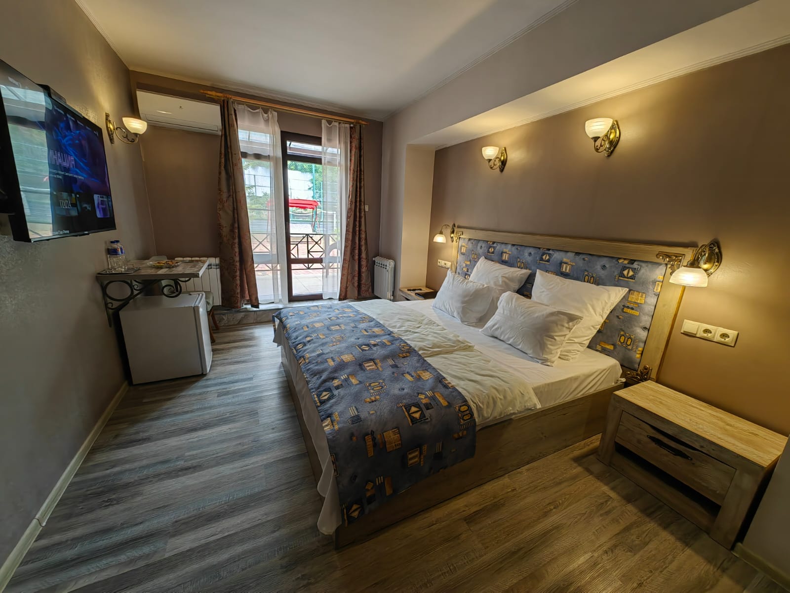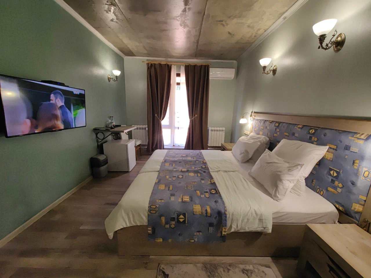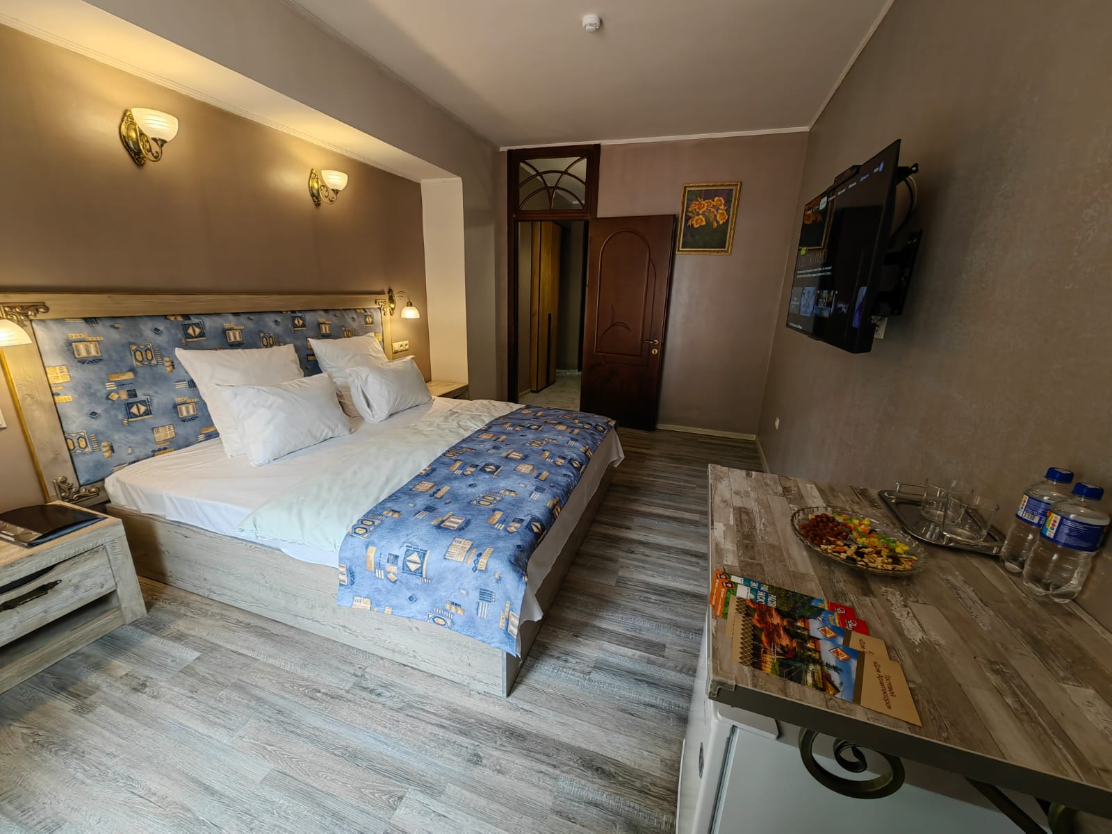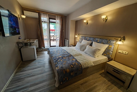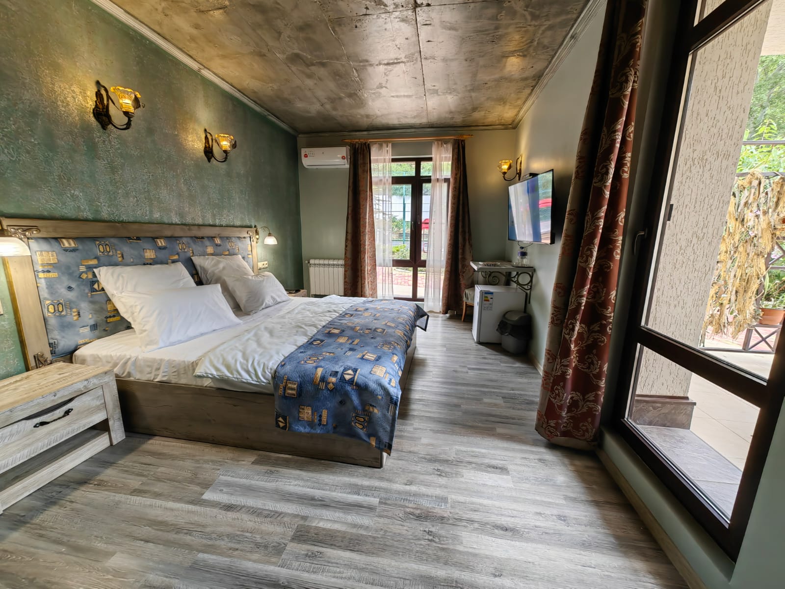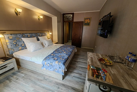 В номере: вешалка, кровать двуспальная, прикроватные тумбочки, стол, стулья, шкаф, кондиционер, телевизор, холодильник