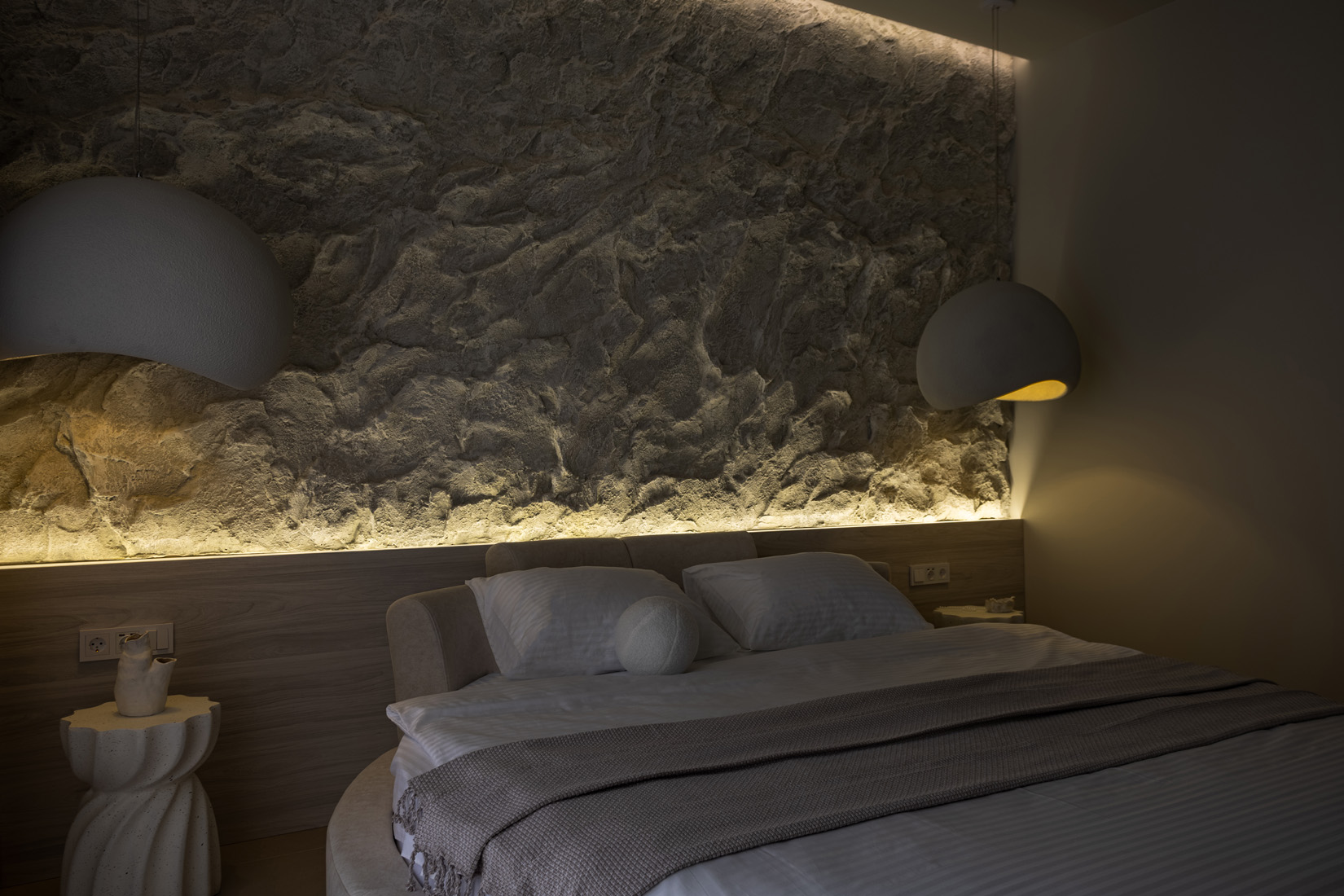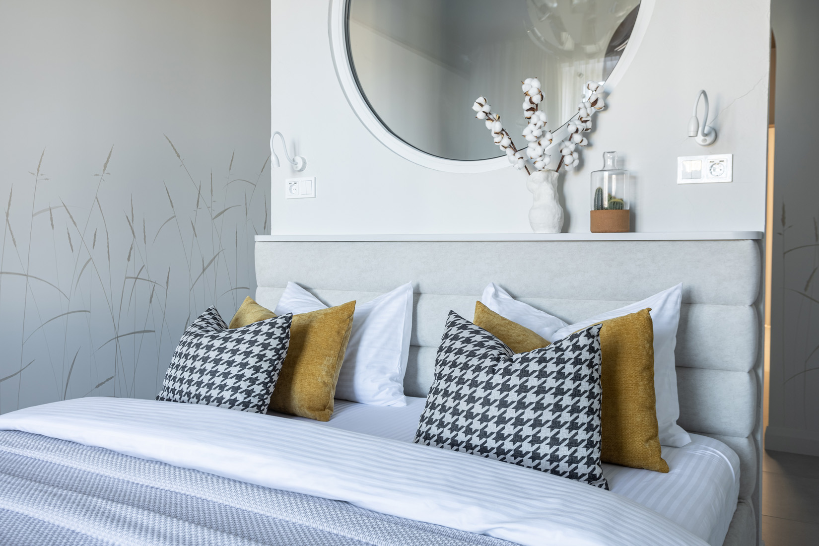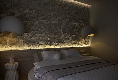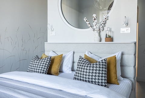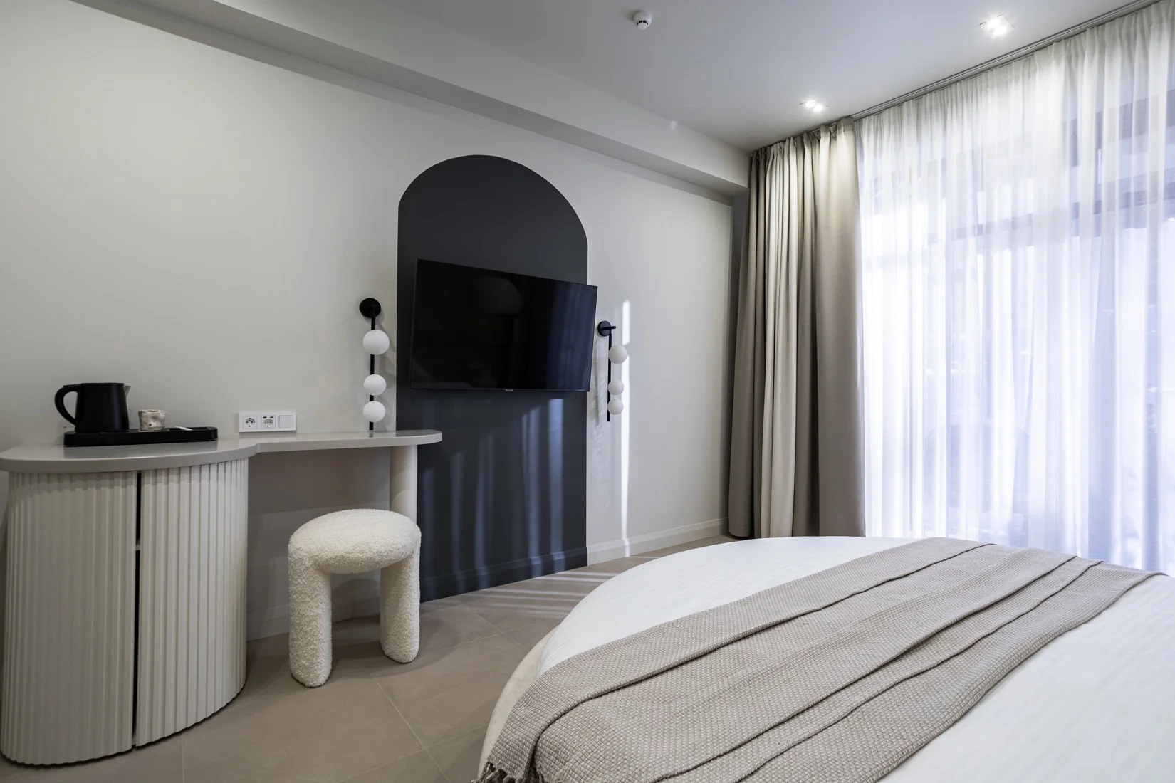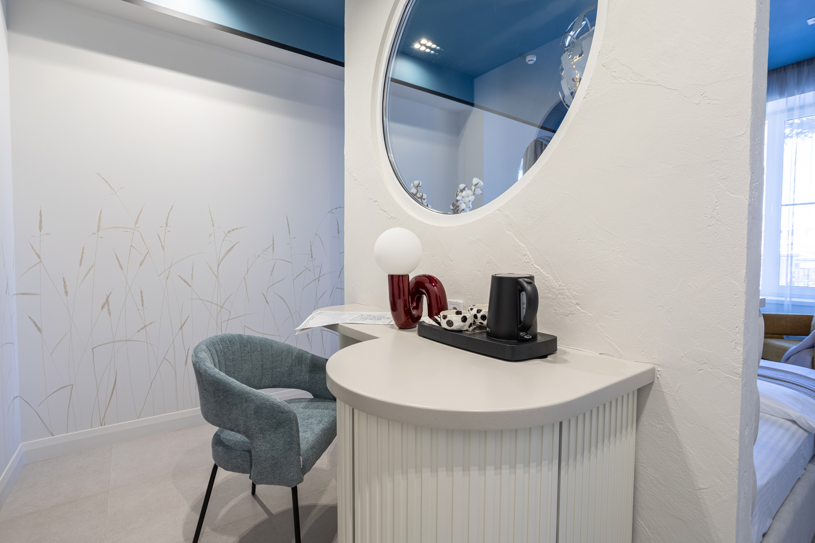 В номере: вешалка, зеркало, кровать двуспальная, прикроватные тумбочки, стол, стул, шкаф, кондиционер, телевизор