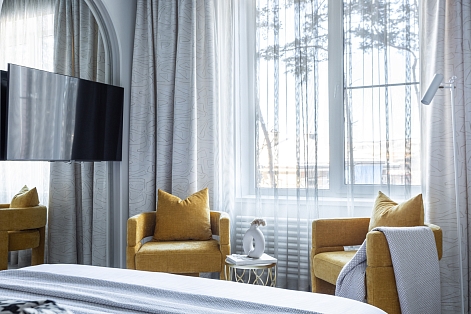 В номере: вешалка, зеркало, кровать двуспальная, прикроватные тумбочки, стол, стулья, шкаф, кондиционер, телевизор
