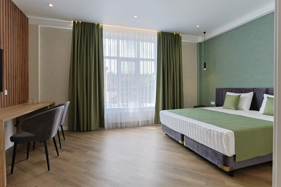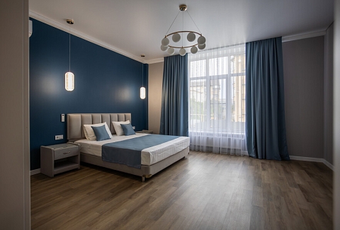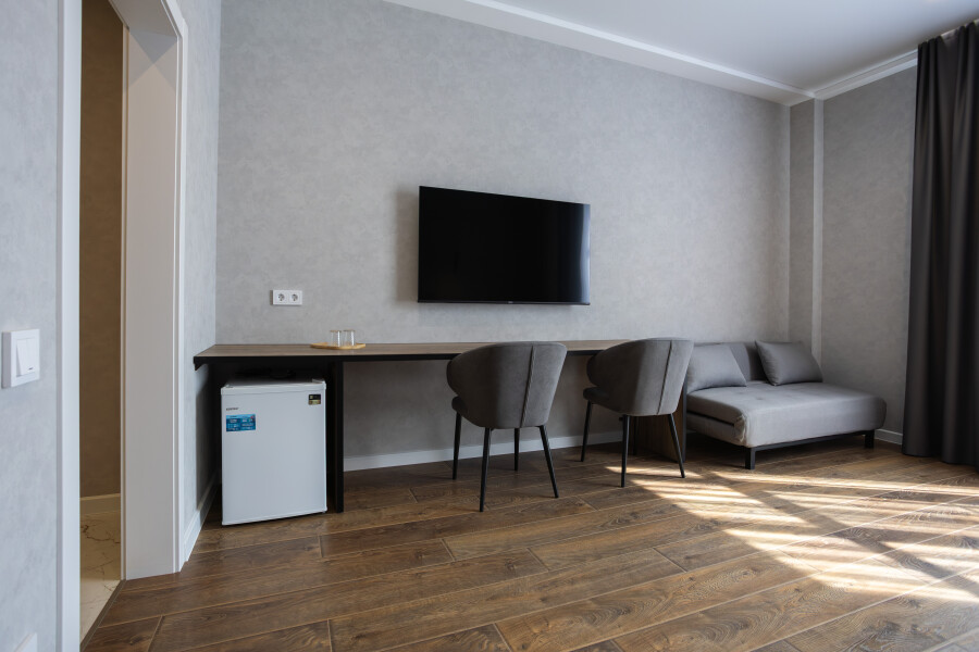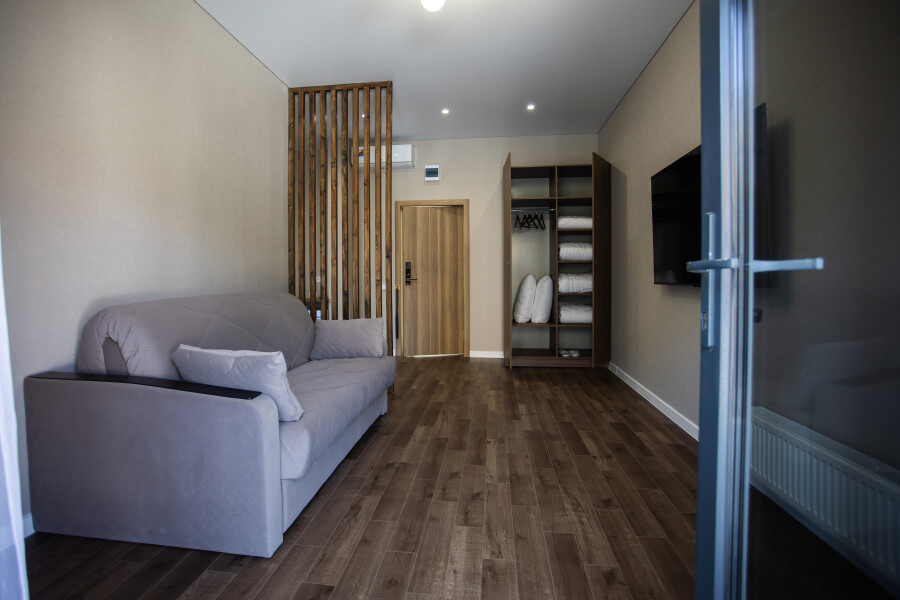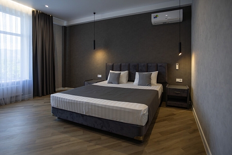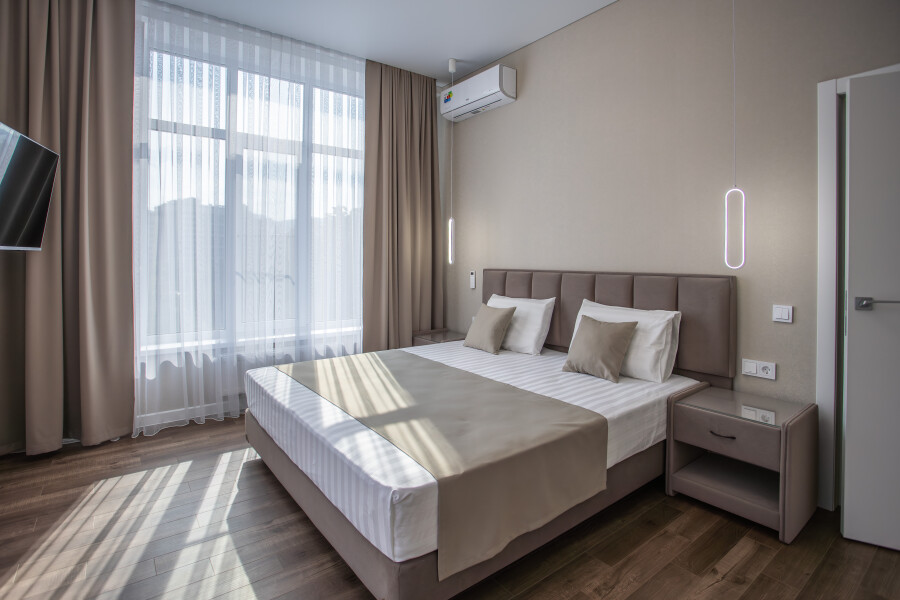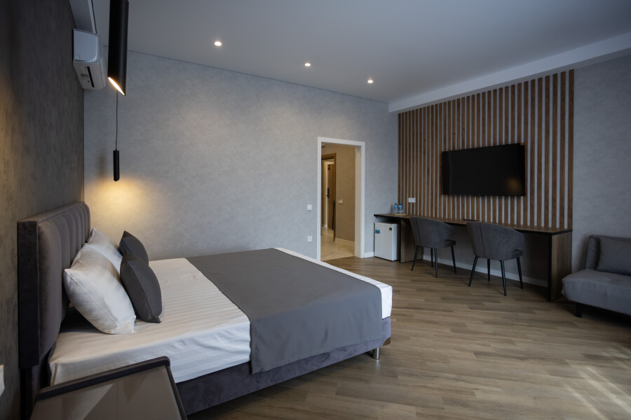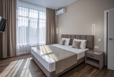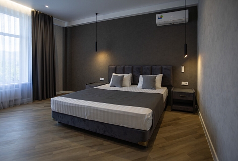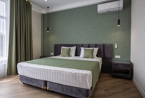 В номере: вешалка, диван, зеркало, кровать двуспальная, прикроватные тумбочки, стол, стул, шкаф, кондиционер, мини-холодильник, телевизор ЖК