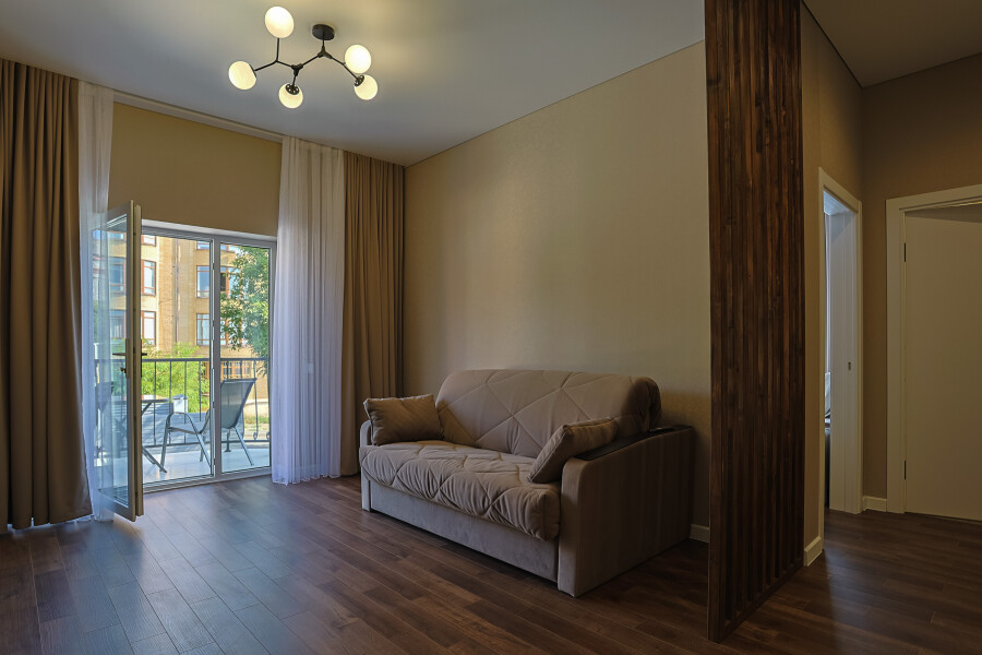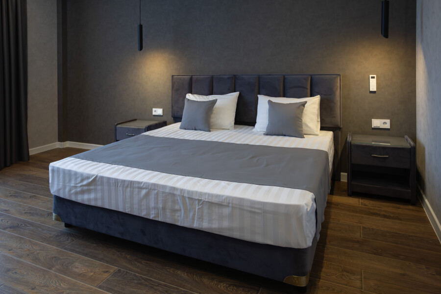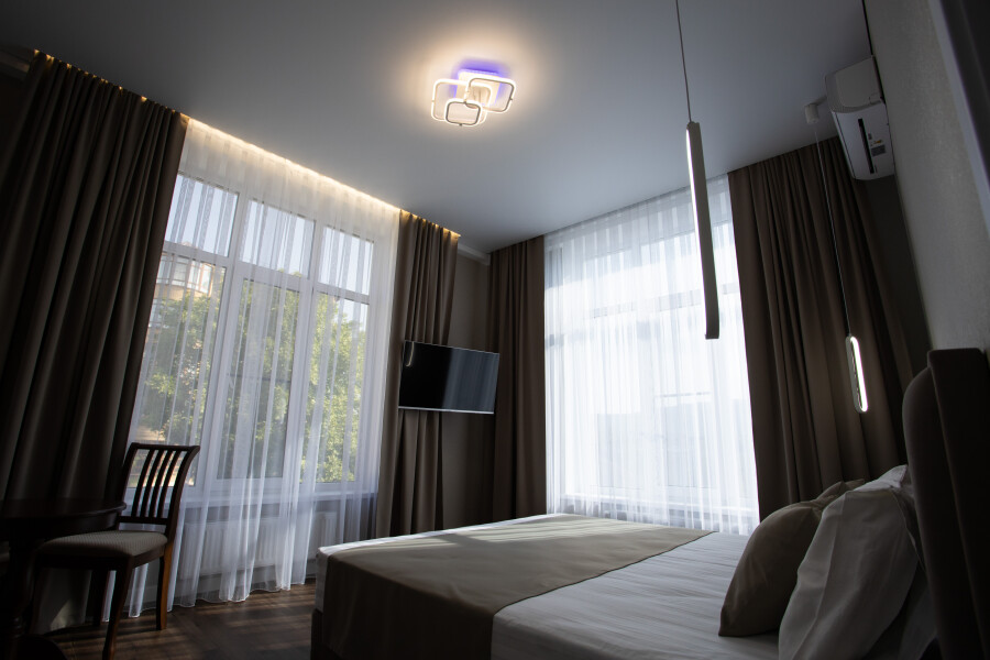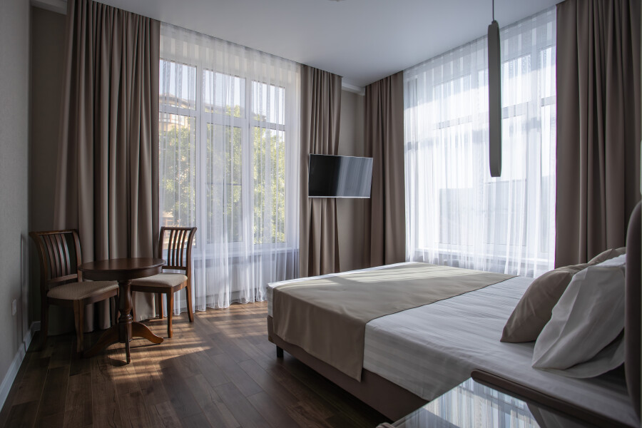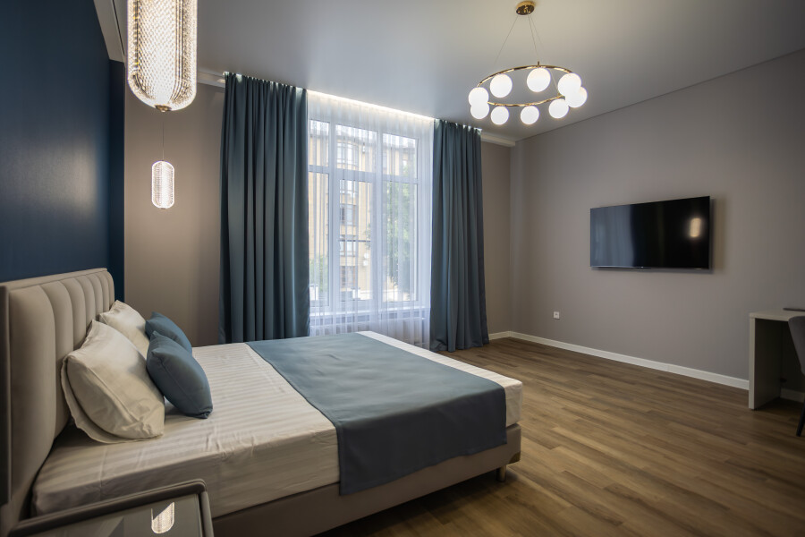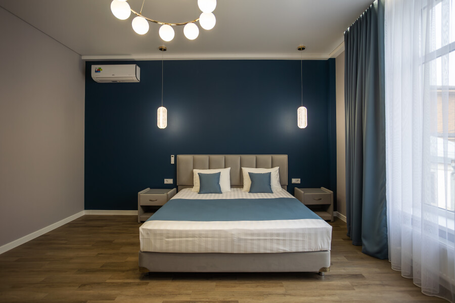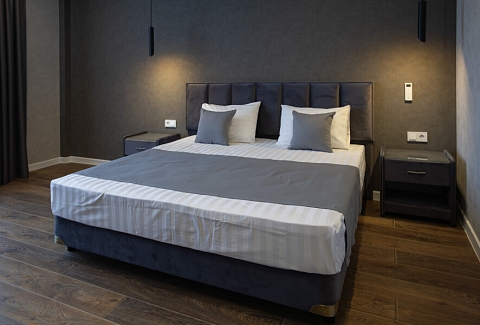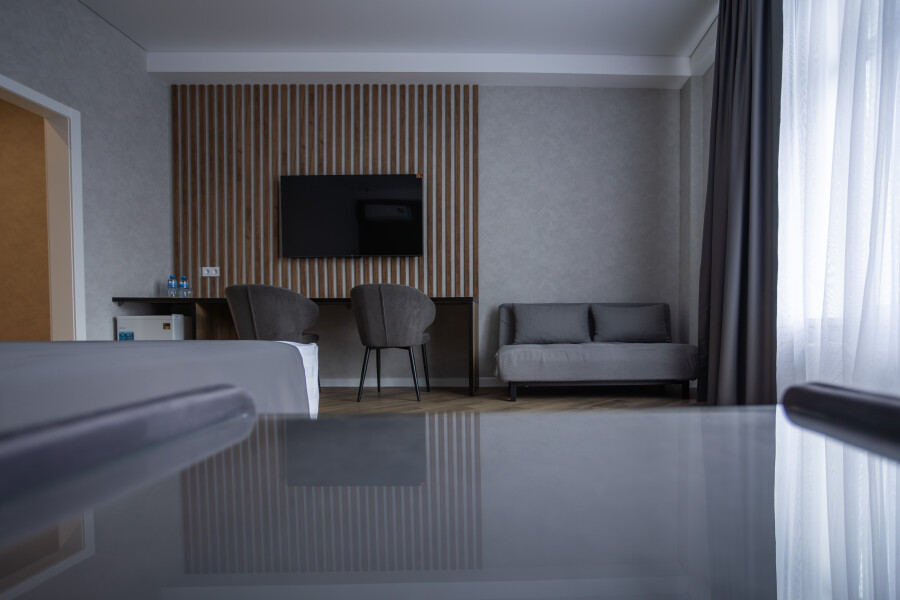 В номере: вешалка, диван, зеркало, кровать двуспальная, прикроватные тумбочки, стол, стул, шкаф, кондиционер, мини-холодильник, телевизор ЖК