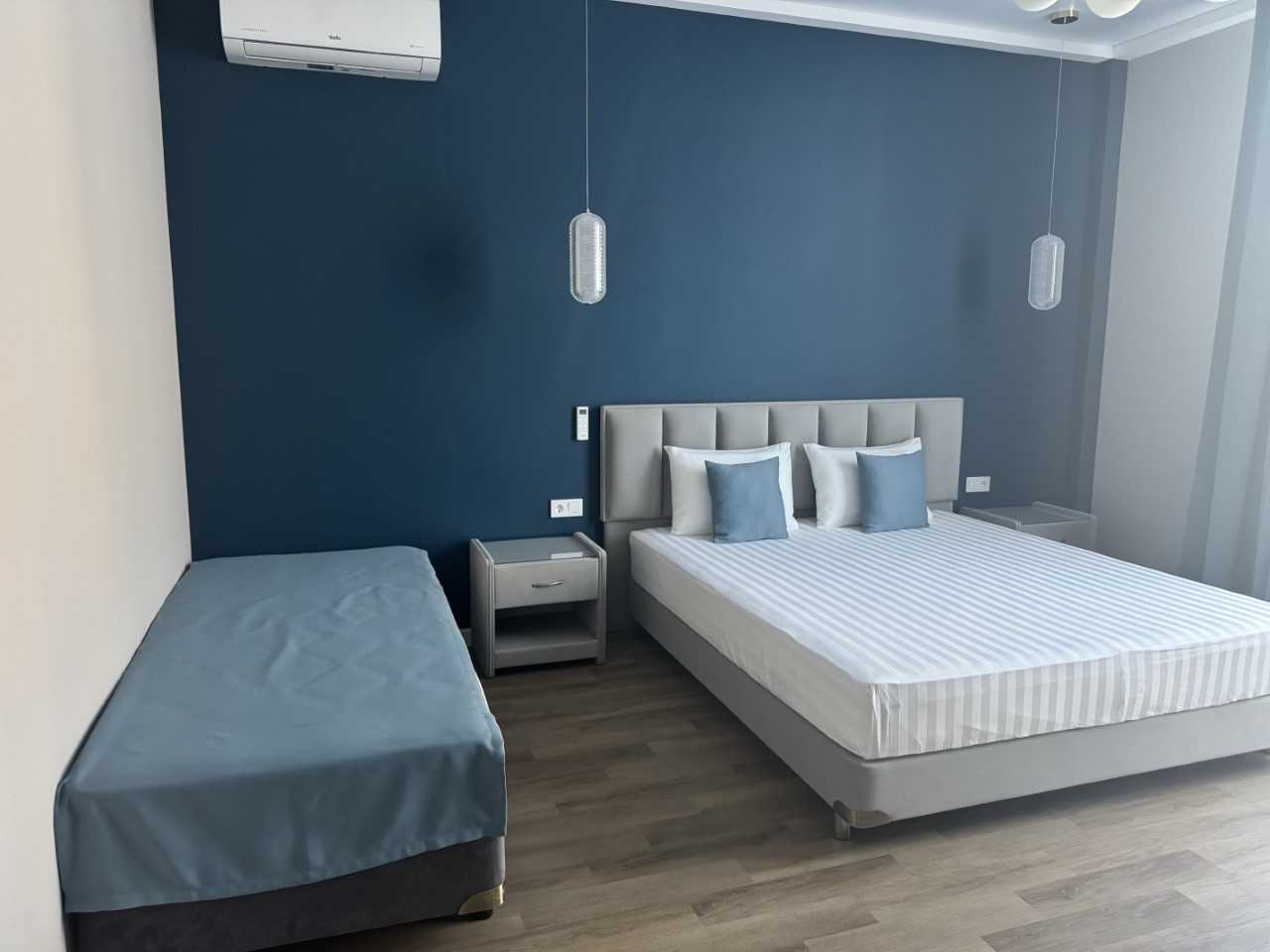 В номере: вешалка, зеркало, кровать двуспальная, кровать односпальная, прикроватные тумбочки, стол, стулья, шкаф, кондиционер, мини-холодильник, телевизор ЖК