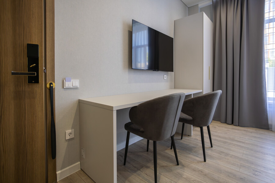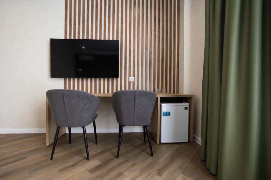 В номере: вешалка, зеркало, кровать двуспальная, прикроватные тумбочки, стол, стулья, шкаф, кондиционер, мини-холодильник, телевизор ЖК