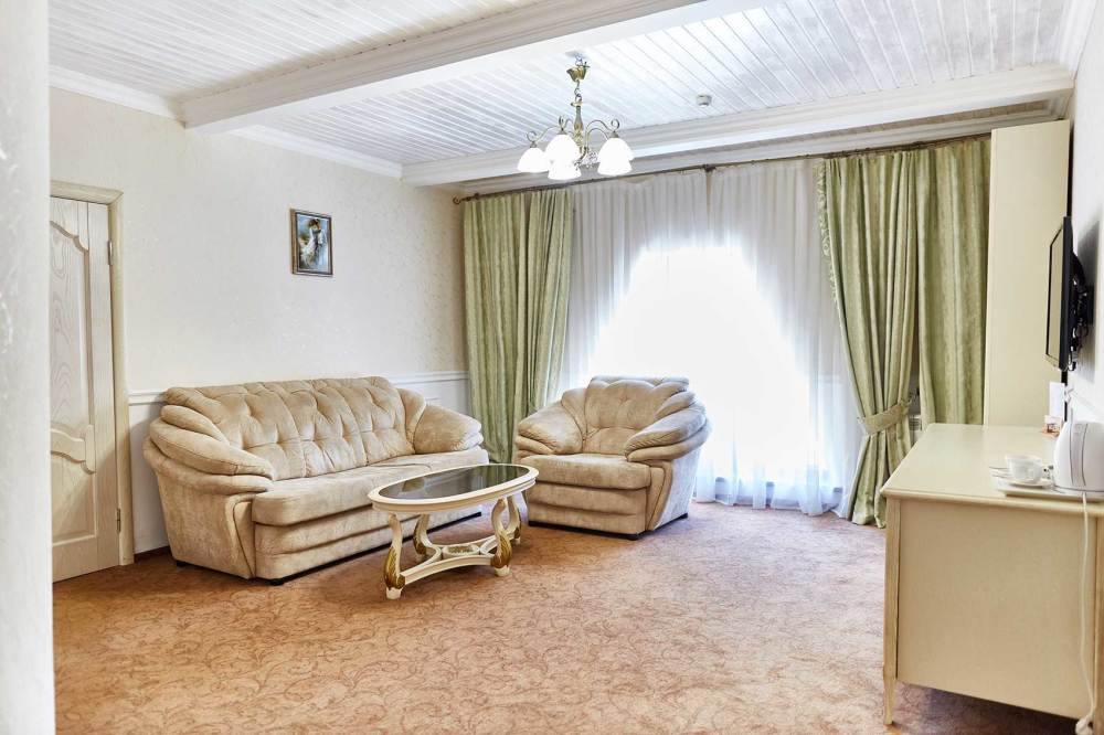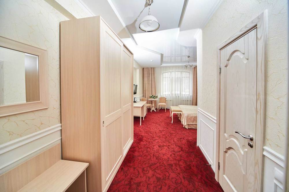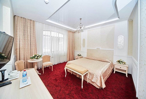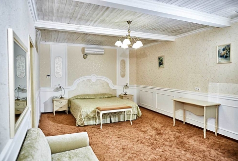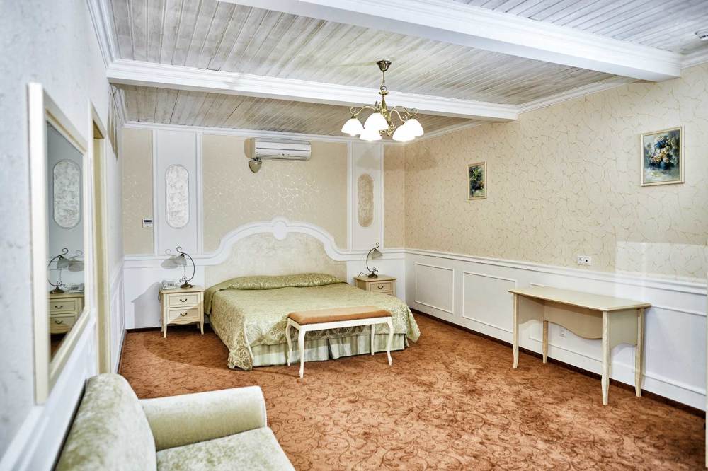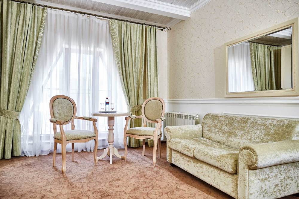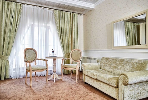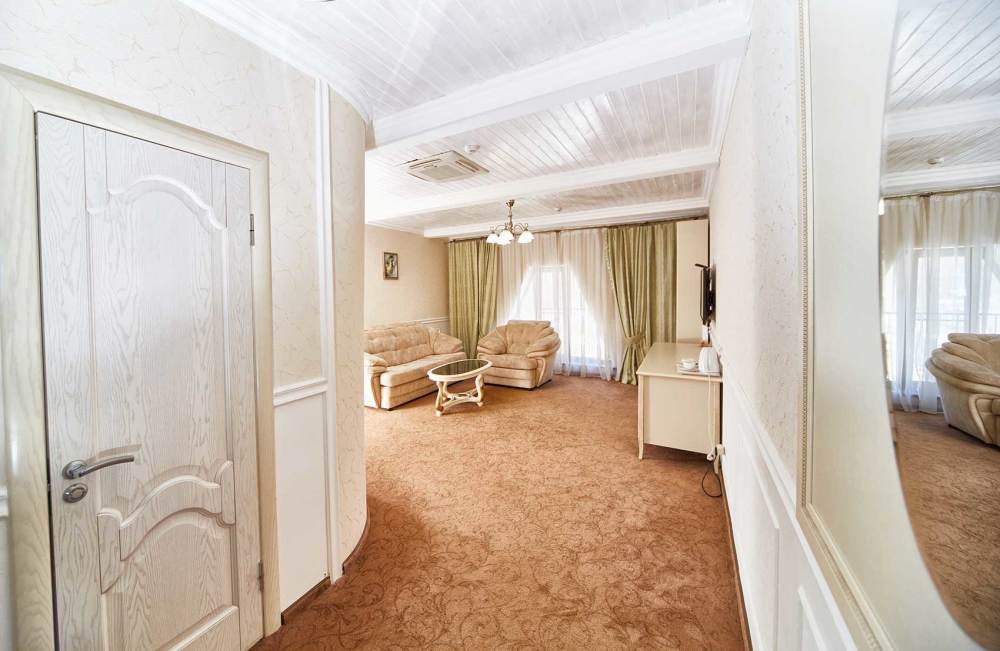 В номере: вешалка, диван, зеркало, кресла, кровать двуспальная, прикроватные тумбочки, стол, столик журнальный, стул, шкаф, кондиционер, мини-холодильник, набор посуды, сейф, телевизор, телефон, электрочайник