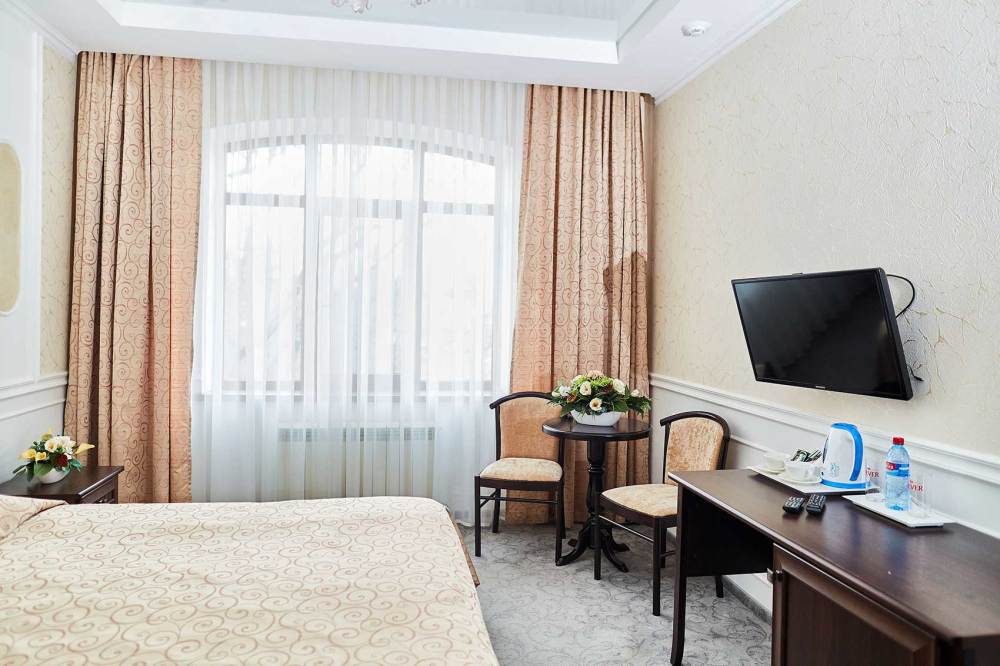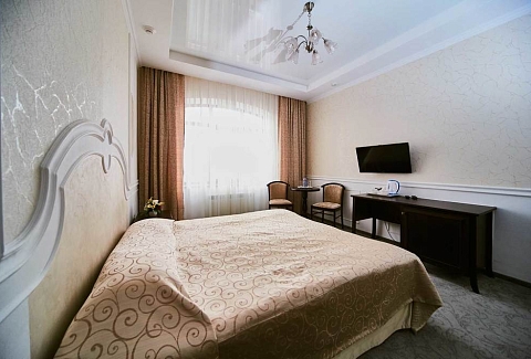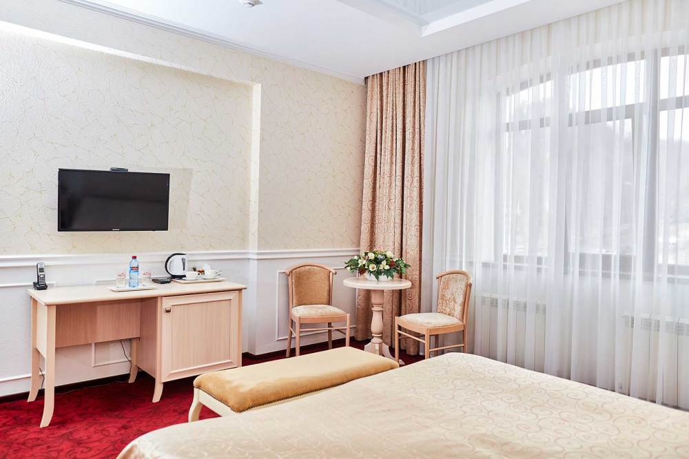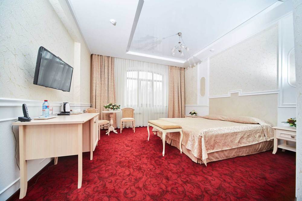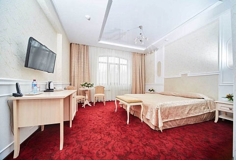 В номере: вешалка, зеркало, кресла, кровать двуспальная, прикроватные тумбочки, стол, стул, шкаф, кондиционер, мини-холодильник, набор посуды, сейф, телевизор, телефон, электрочайник