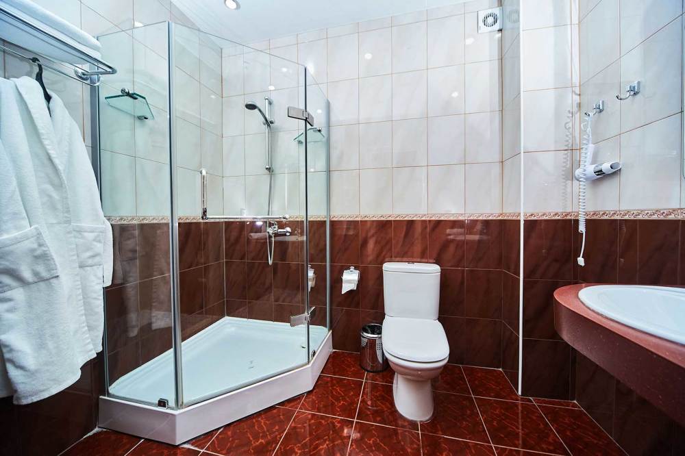 Санузел: с душевой кабиной, тапочки, туалетные принадлежности, фен, халат