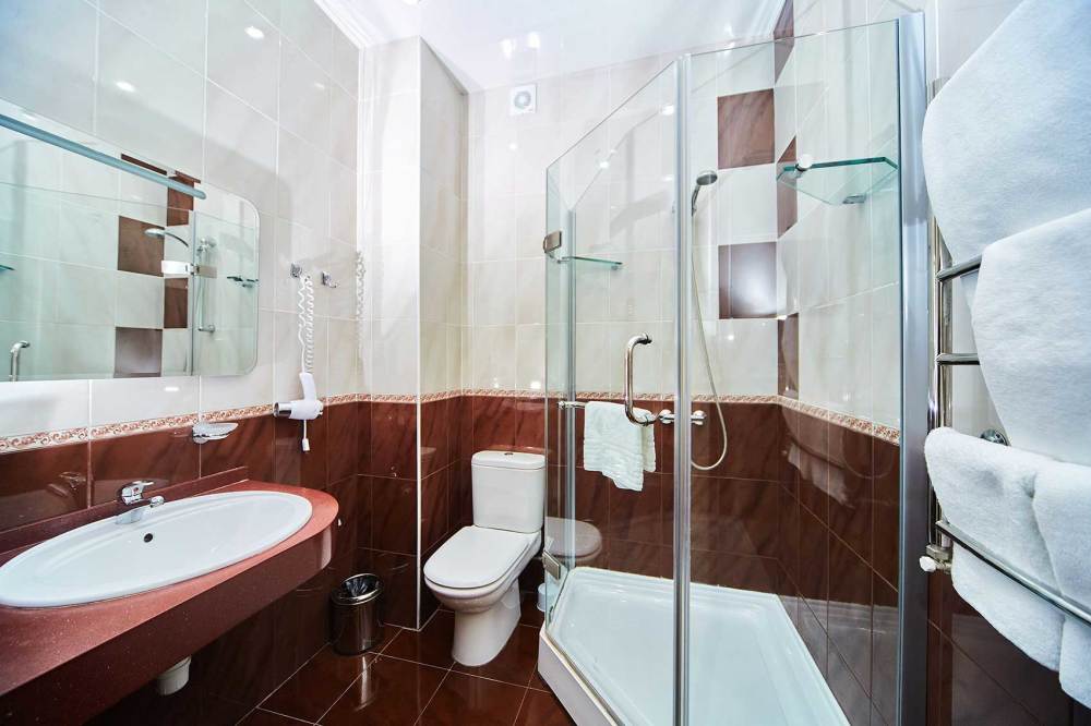 Санузел: с душевой кабиной, тапочки, туалетные принадлежности, фен