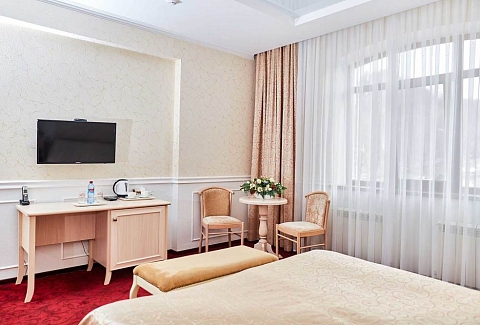 В номере: вешалка, зеркало, кресла, кровати односпальные /одна двуспальная кровать, прикроватные тумбочки, стол, стул, шкаф, кондиционер, мини-холодильник, набор посуды, сейф, телевизор, телефон, электрочайник