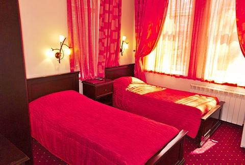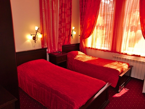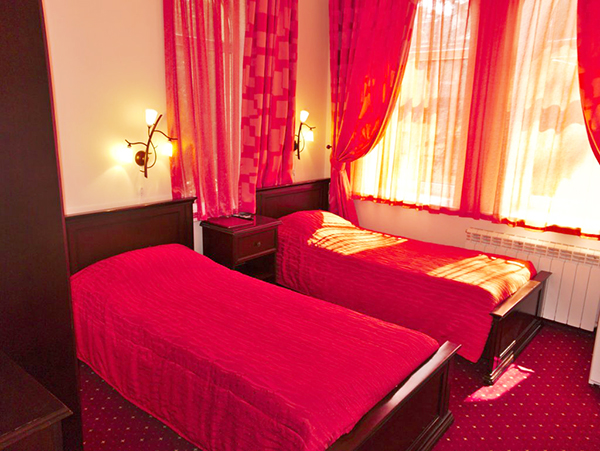 В номере: вешалка, зеркало, кровати односпальные, прикроватные тумбочки, стол, стулья, шкаф, телевизор, холодильник, чайный набор посуды, электрочайник