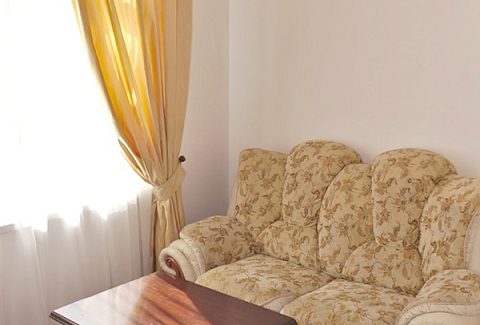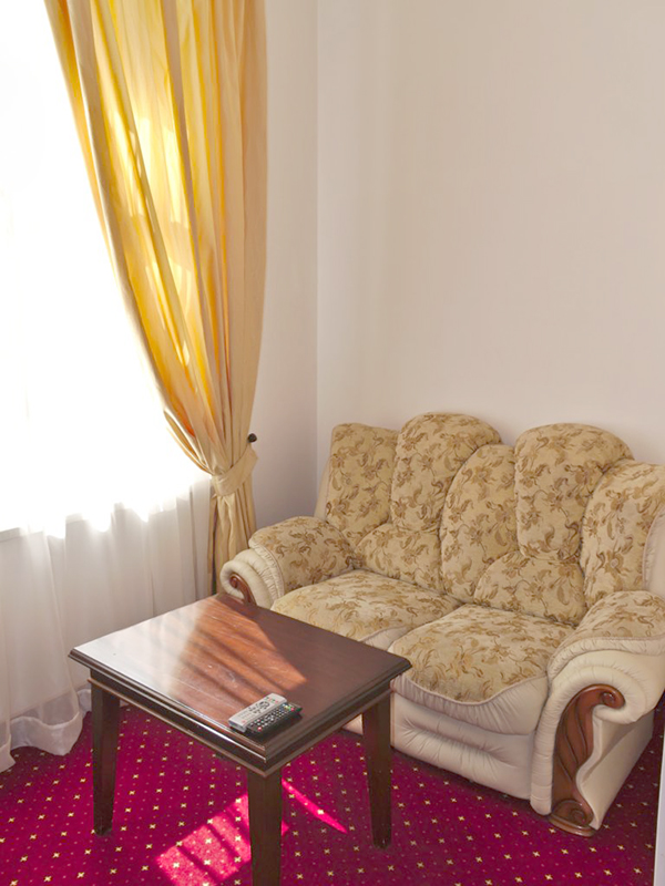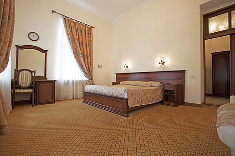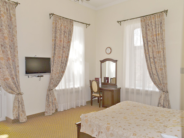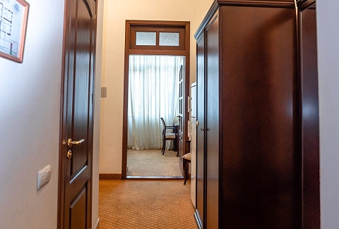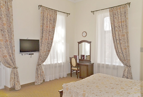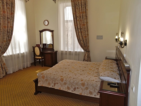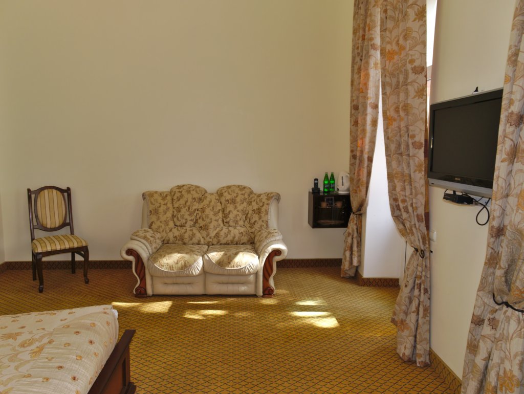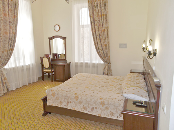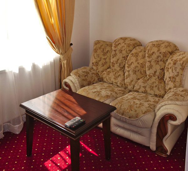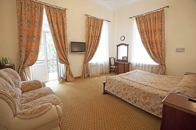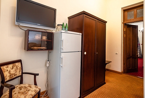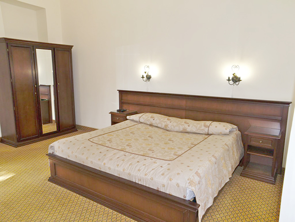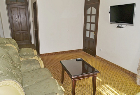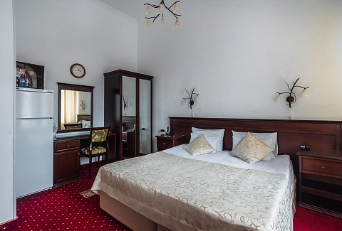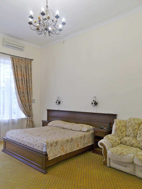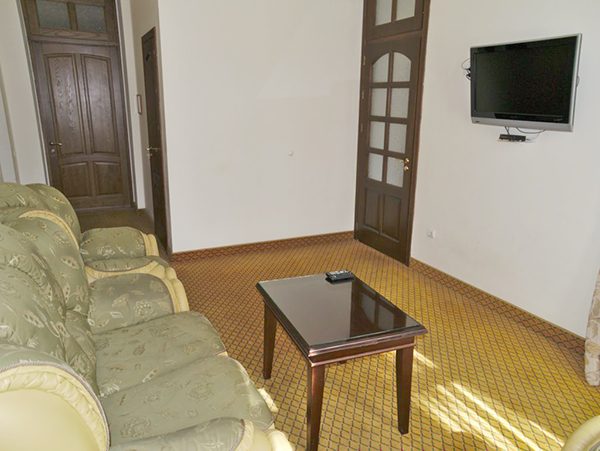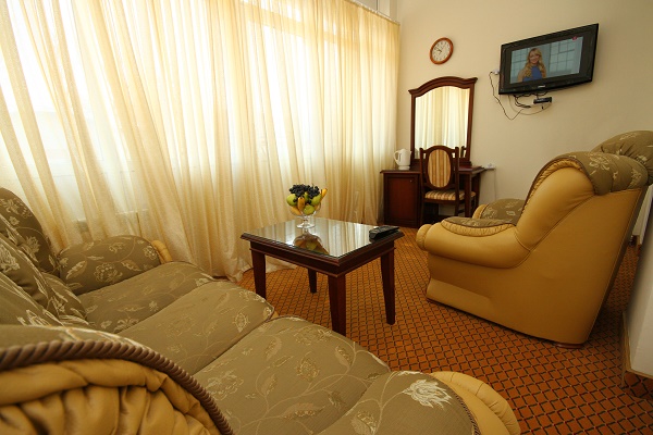 В номере: вешалка, диван, зеркало, кресло, кровать двуспальная, прикроватные тумбочки, стол, стулья, шкаф, сейф, телевизор, телефон, холодильник, чайный набор посуды, электрочайник