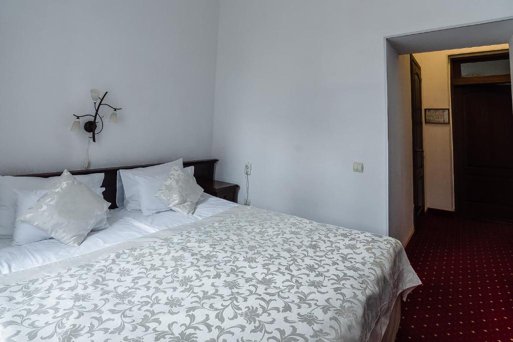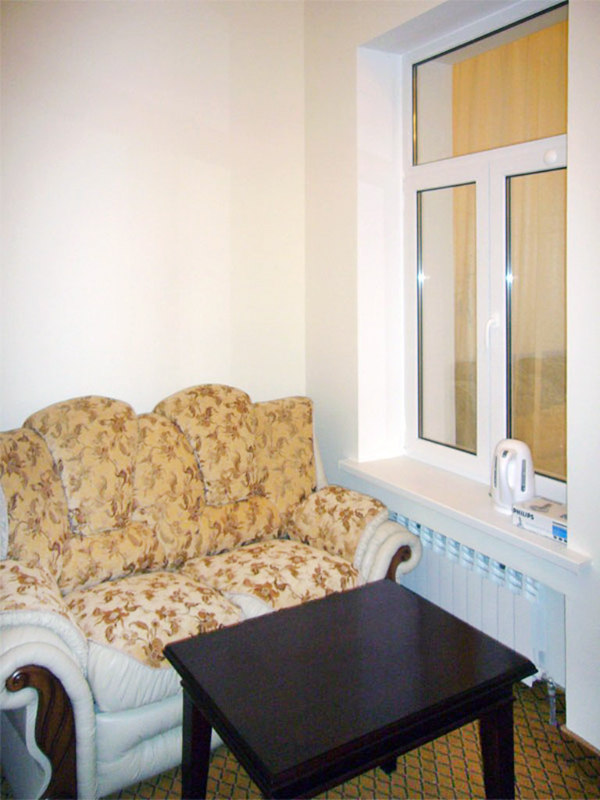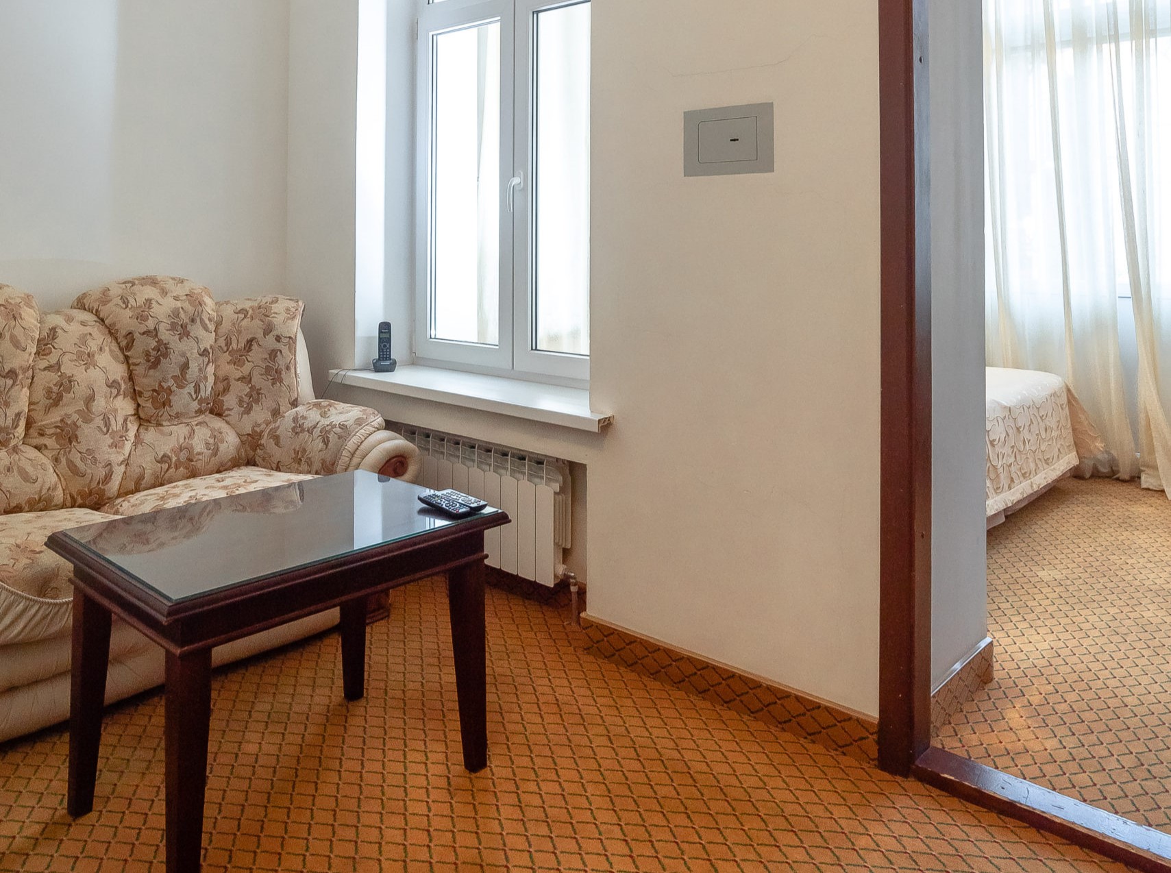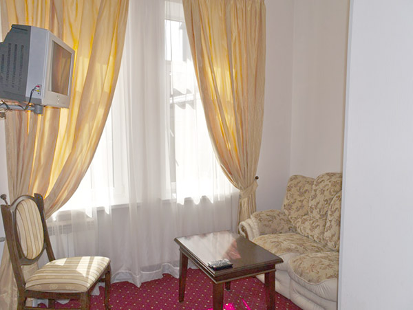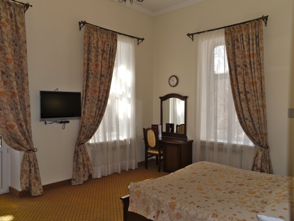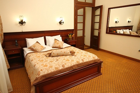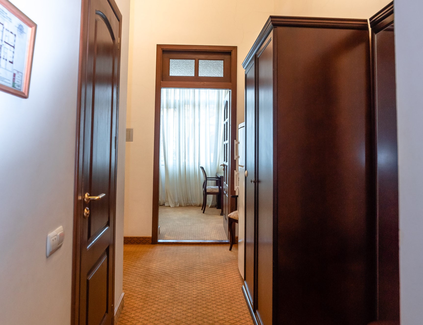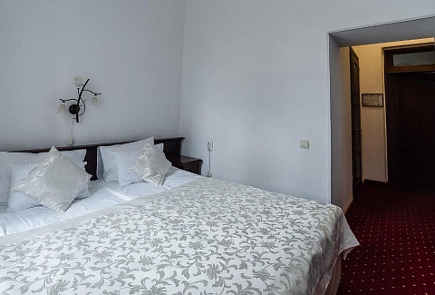 В номере: вешалка, диван, зеркало, кресло, кровать двуспальная, прикроватные тумбочки, стол, стулья, шкаф, сейф, телевизор, телефон, холодильник, чайный набор посуды, электрочайник