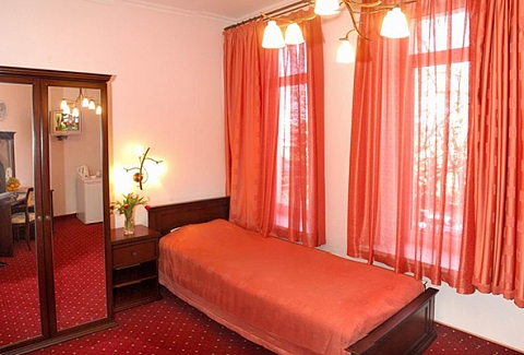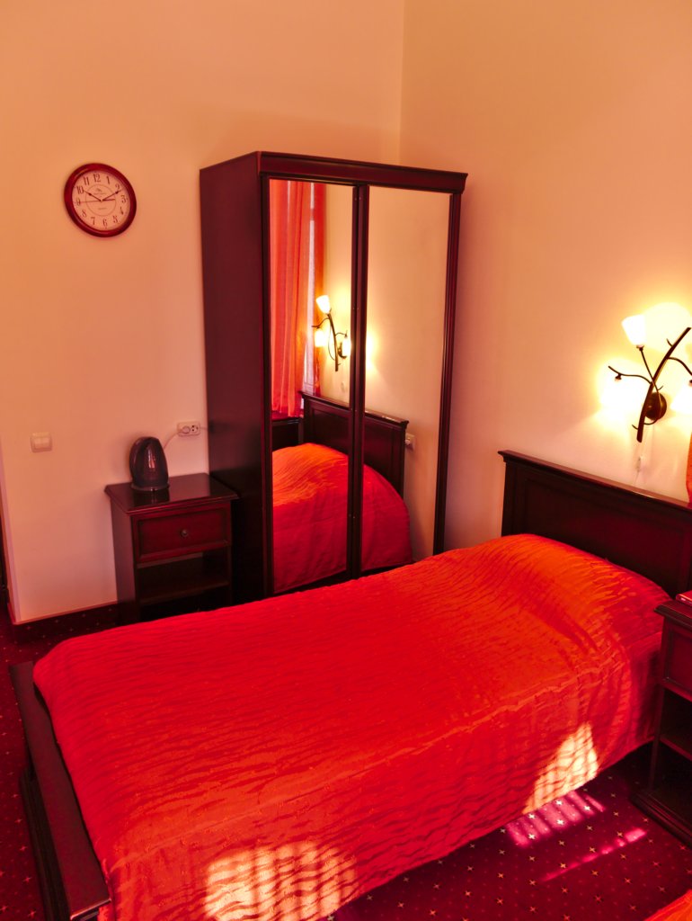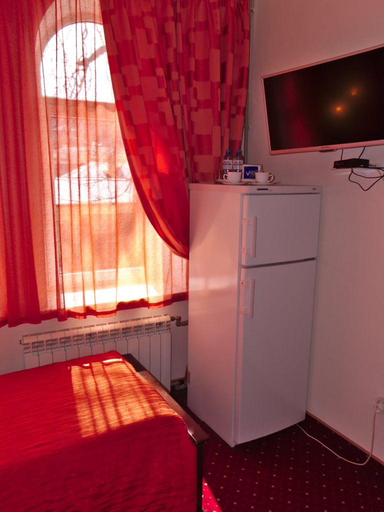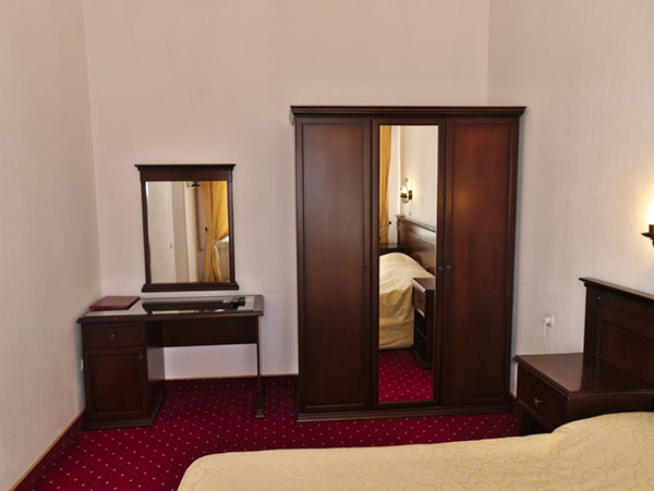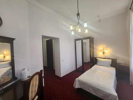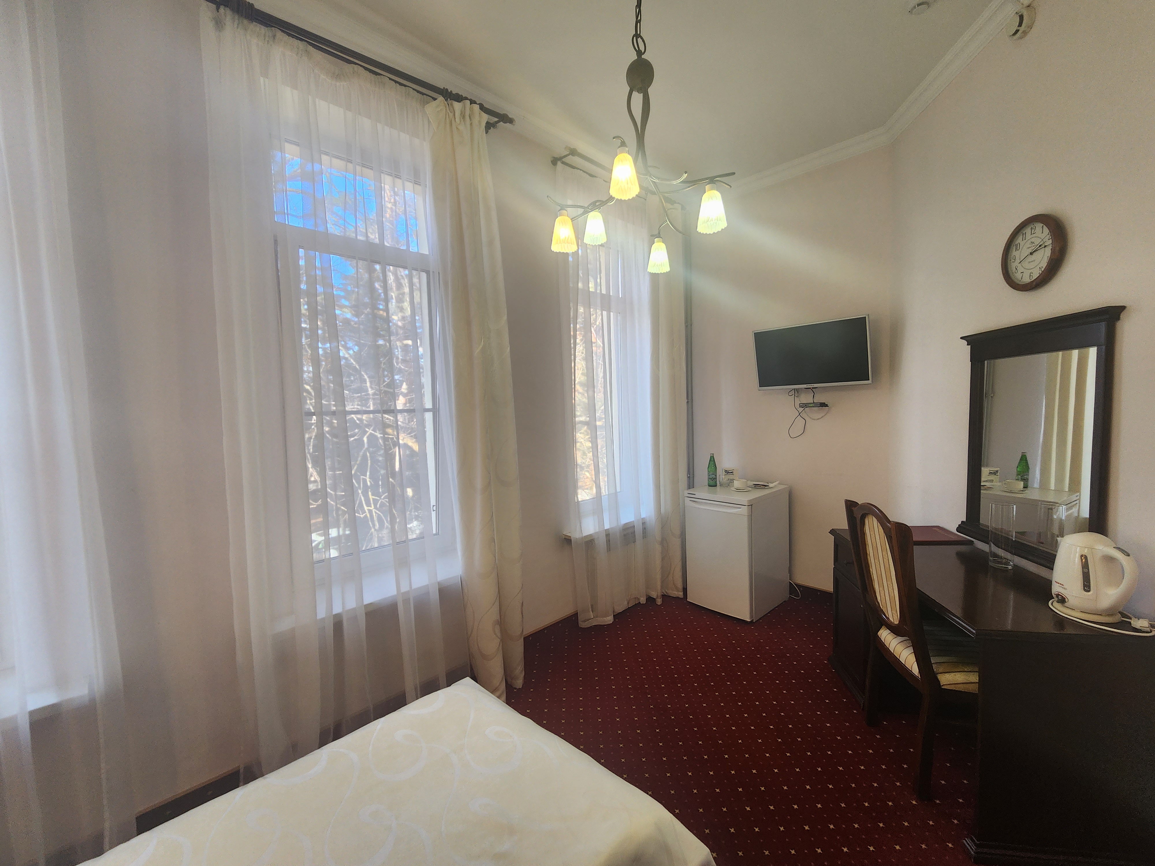 В номере: вешалка, зеркало, кровать односпальная, прикроватная тумбочка, стол, стул, шкаф, сейф, телевизор, телефон, холодильник, чайный набор посуды, электрочайник