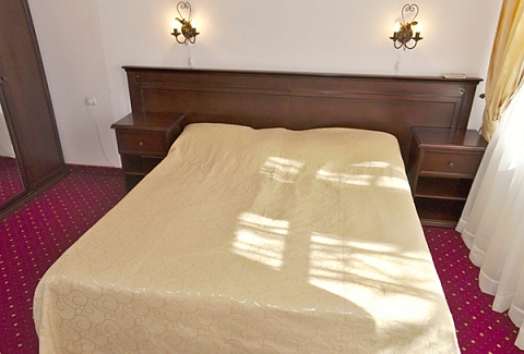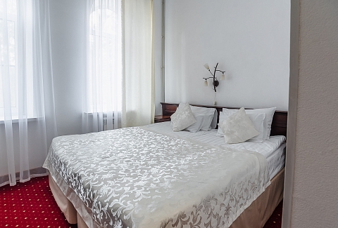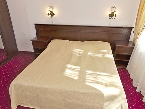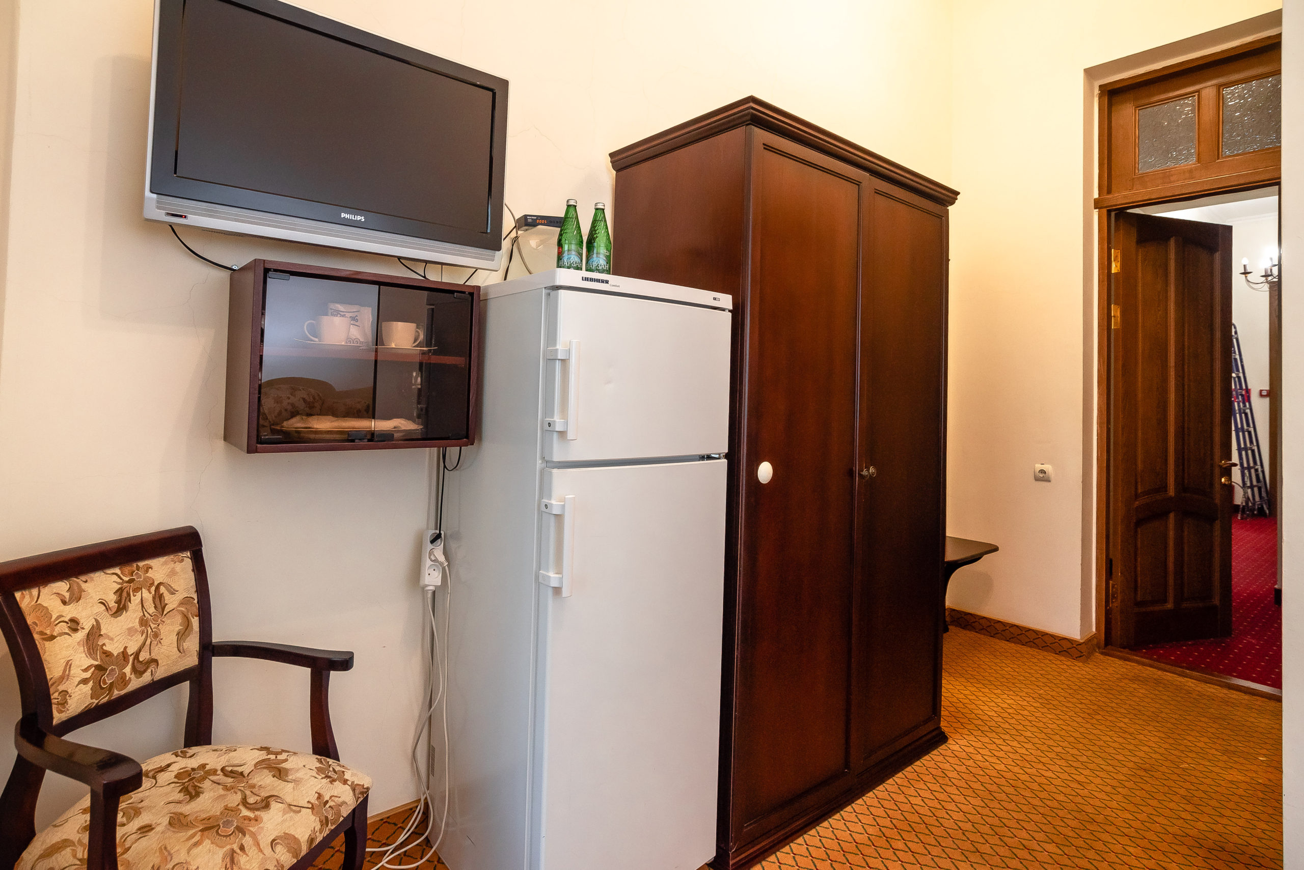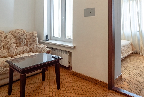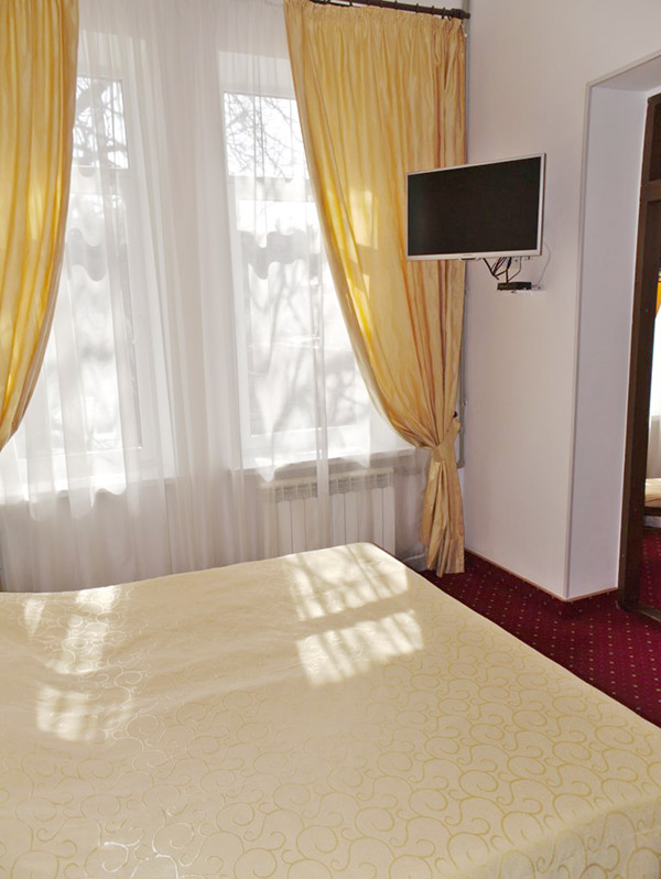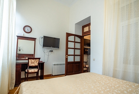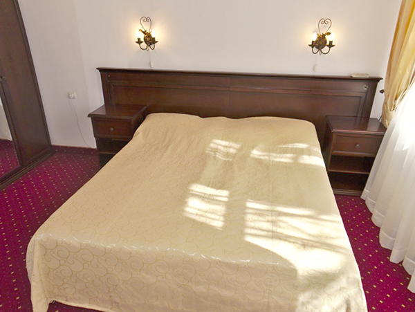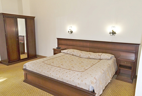 В номере: вешалка, диван, зеркало, кровать двуспальная, прикроватные тумбочки, стол, стулья, шкаф, сейф, телевизор, телефон, холодильник, чайный набор посуды, электрочайник