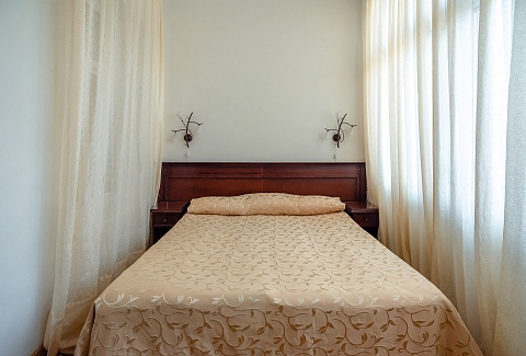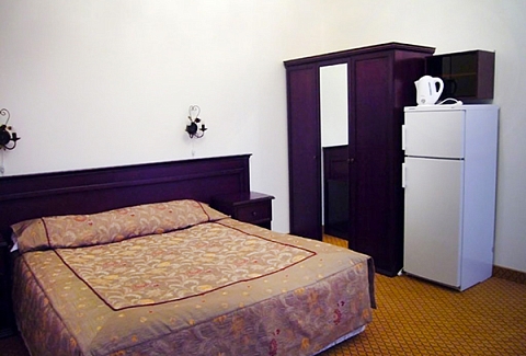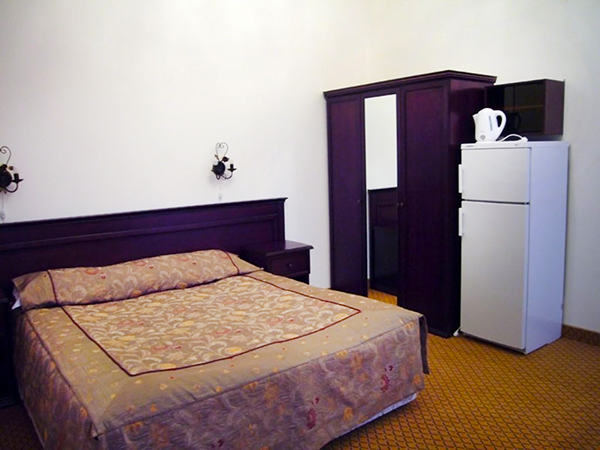 В номере: вешалка, зеркало, кровать двуспальная, прикроватные тумбочки, стол, стулья, шкаф, сейф, телевизор, телефон, холодильник, чайный набор посуды, электрочайник