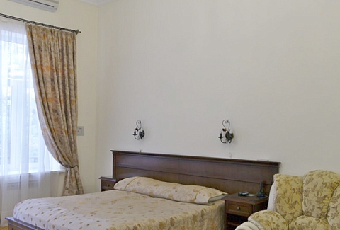 В номере: вешалка, диван, зеркало, кровать двуспальная, прикроватные тумбочки, стол, стулья, шкаф, кондиционер, сейф, телевизор, телефон, холодильник, чайный набор посуды, электрочайник