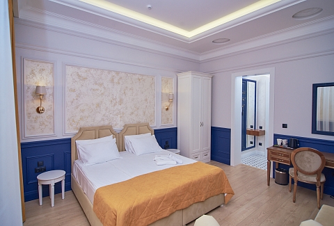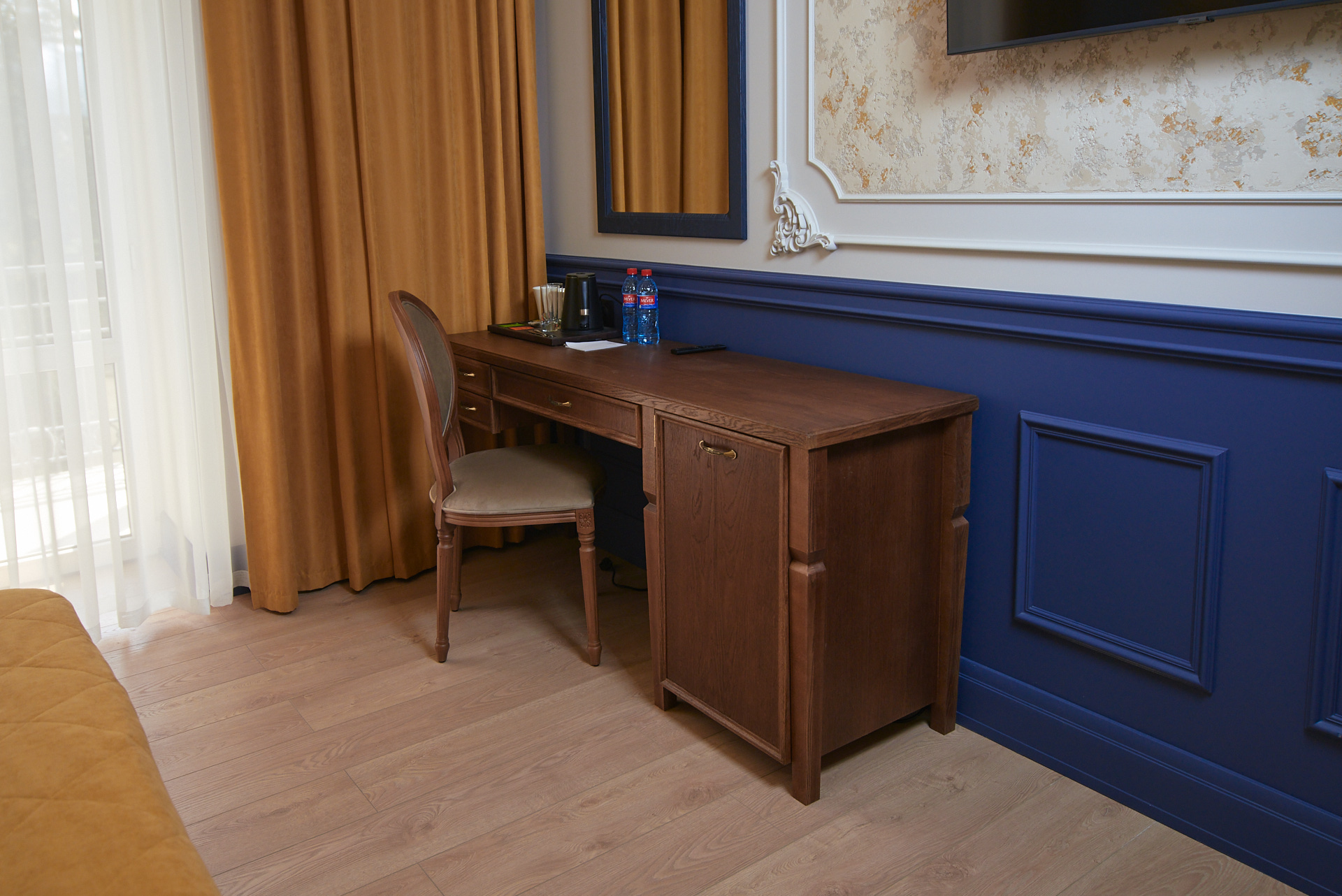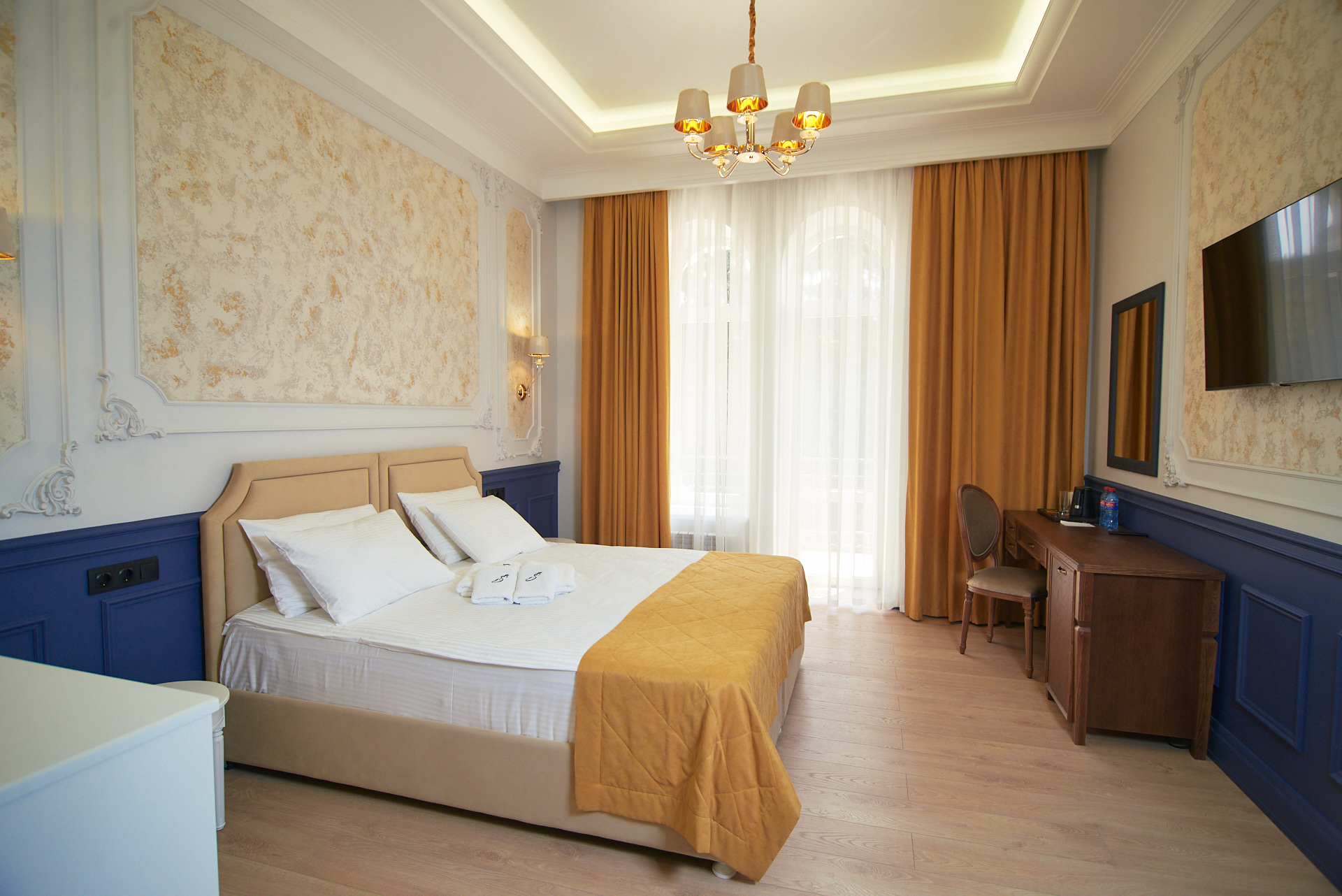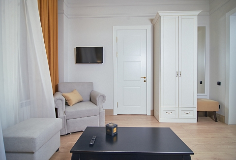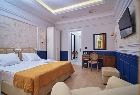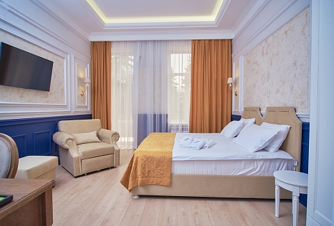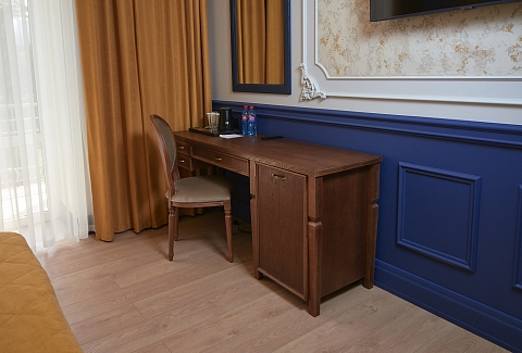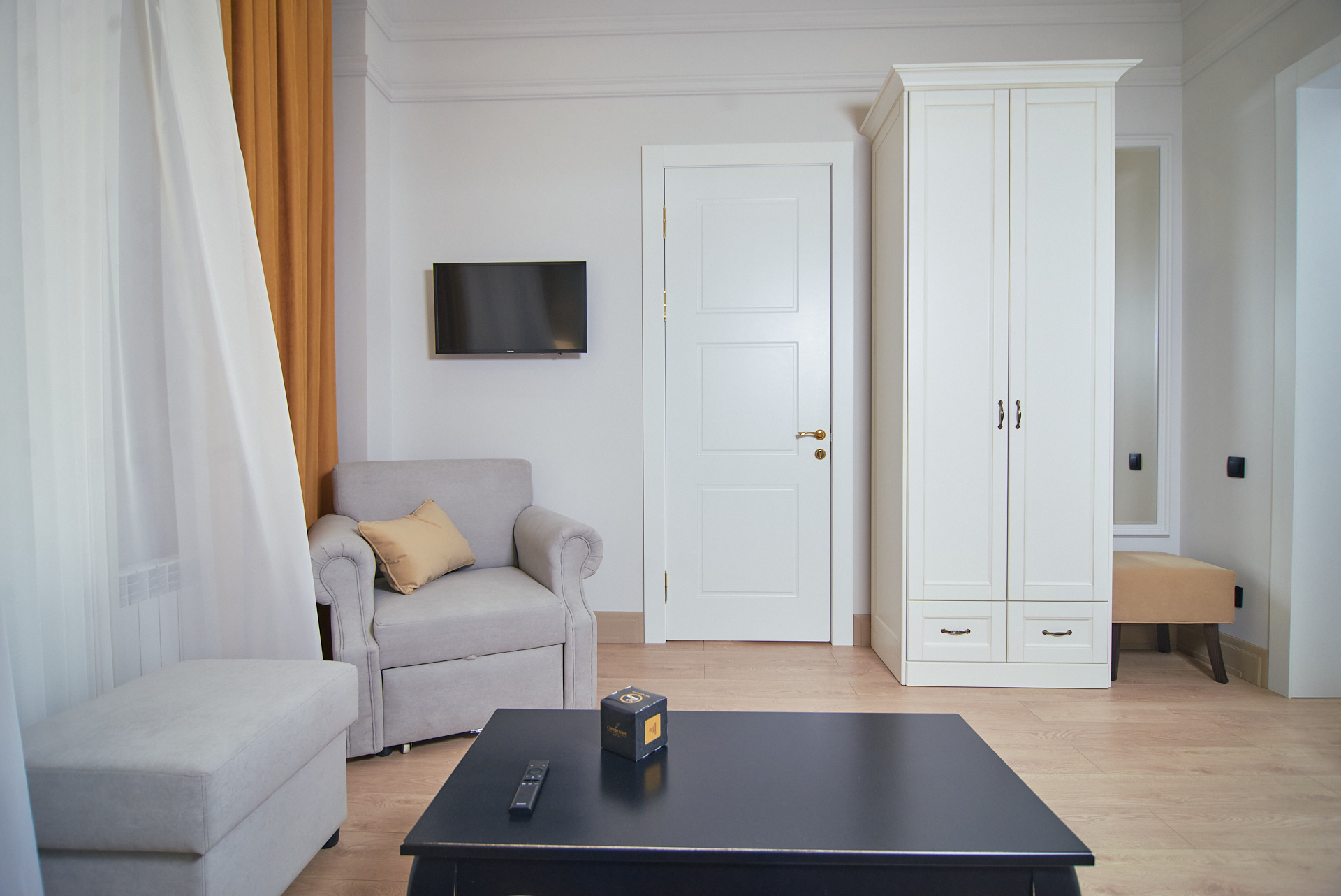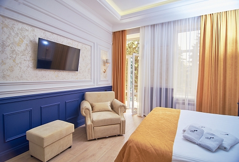 В номере: вешалка, диван, зеркало, кресло, кровать двуспальная, прикроватные столики, стол, стул, шкаф, кондиционер, сейф, телевизор, чайный набор посуды, электрочайник