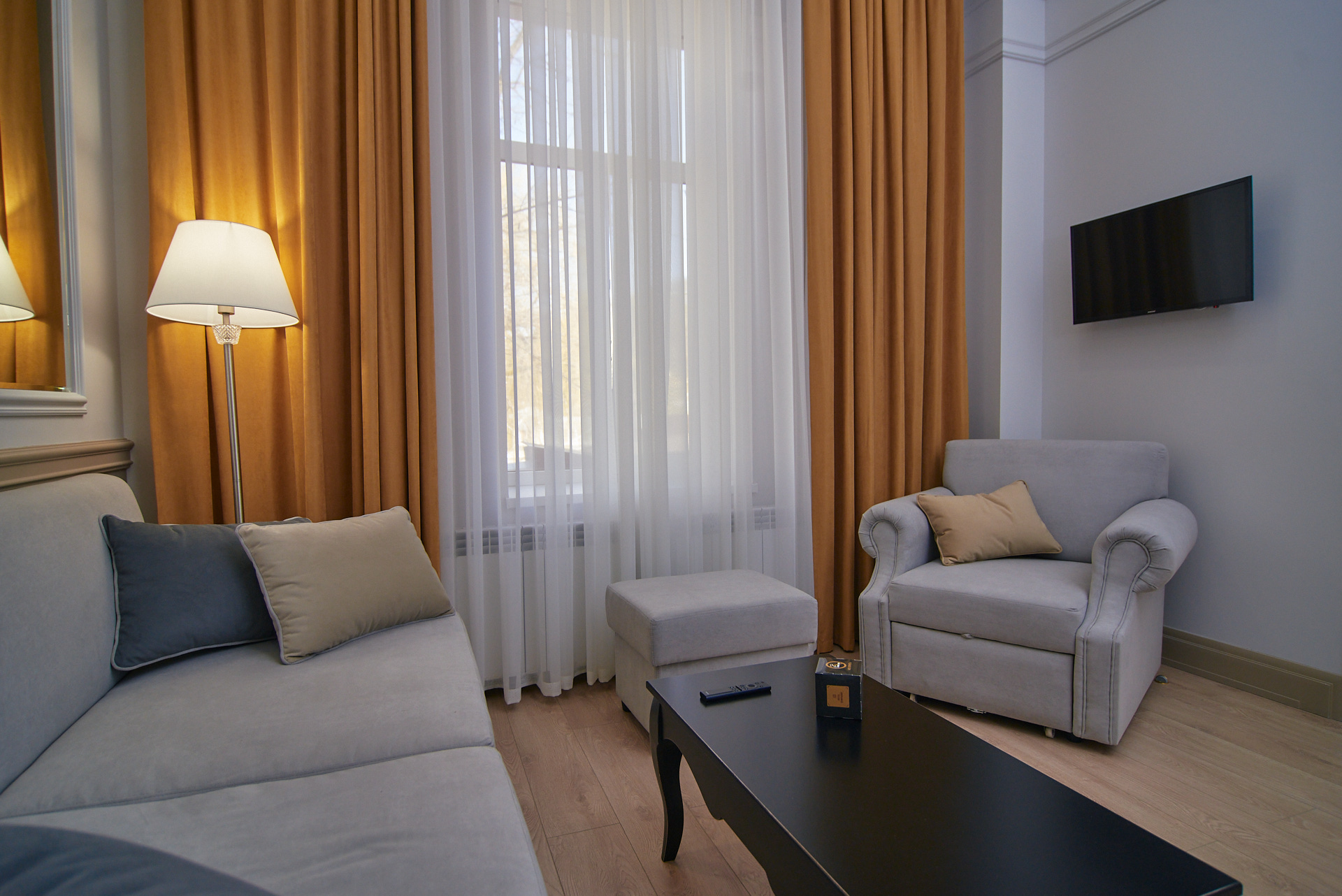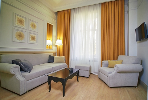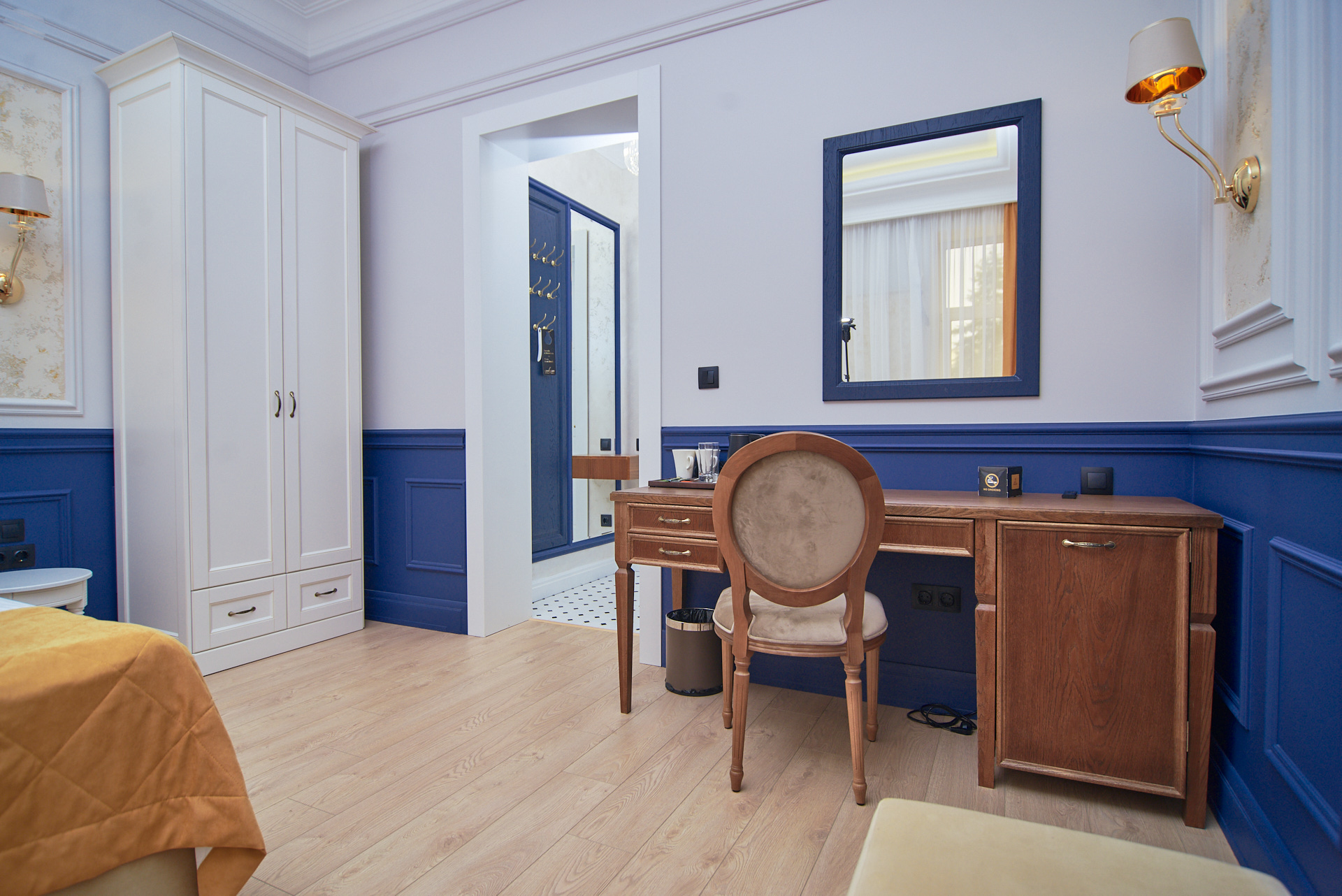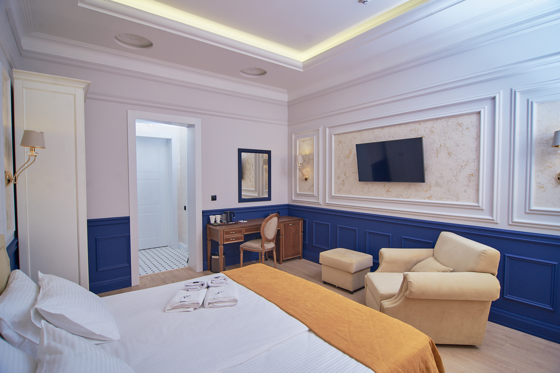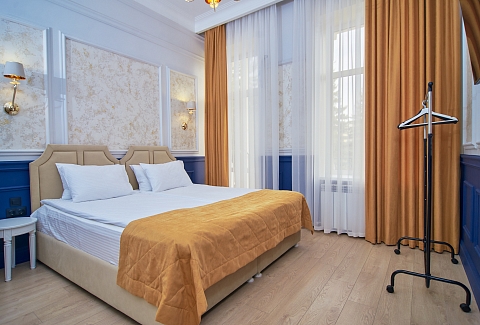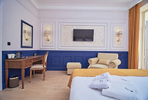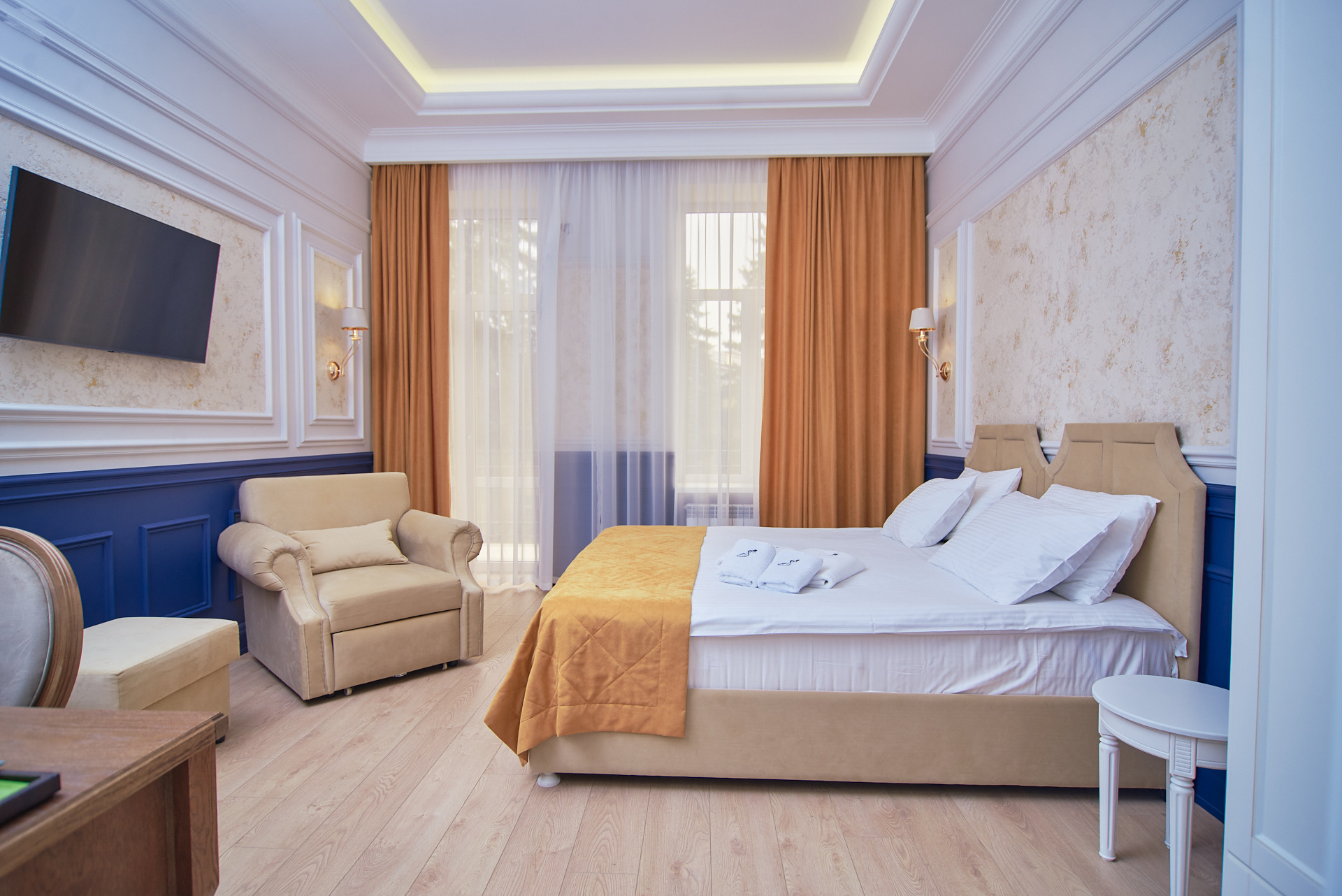 В номере: вешалка, диван, зеркало, кресло, кровать двуспальная, прикроватные столики, стол, стул, шкаф, кондиционер, сейф, телевизор, чайный набор посуды, электрочайник