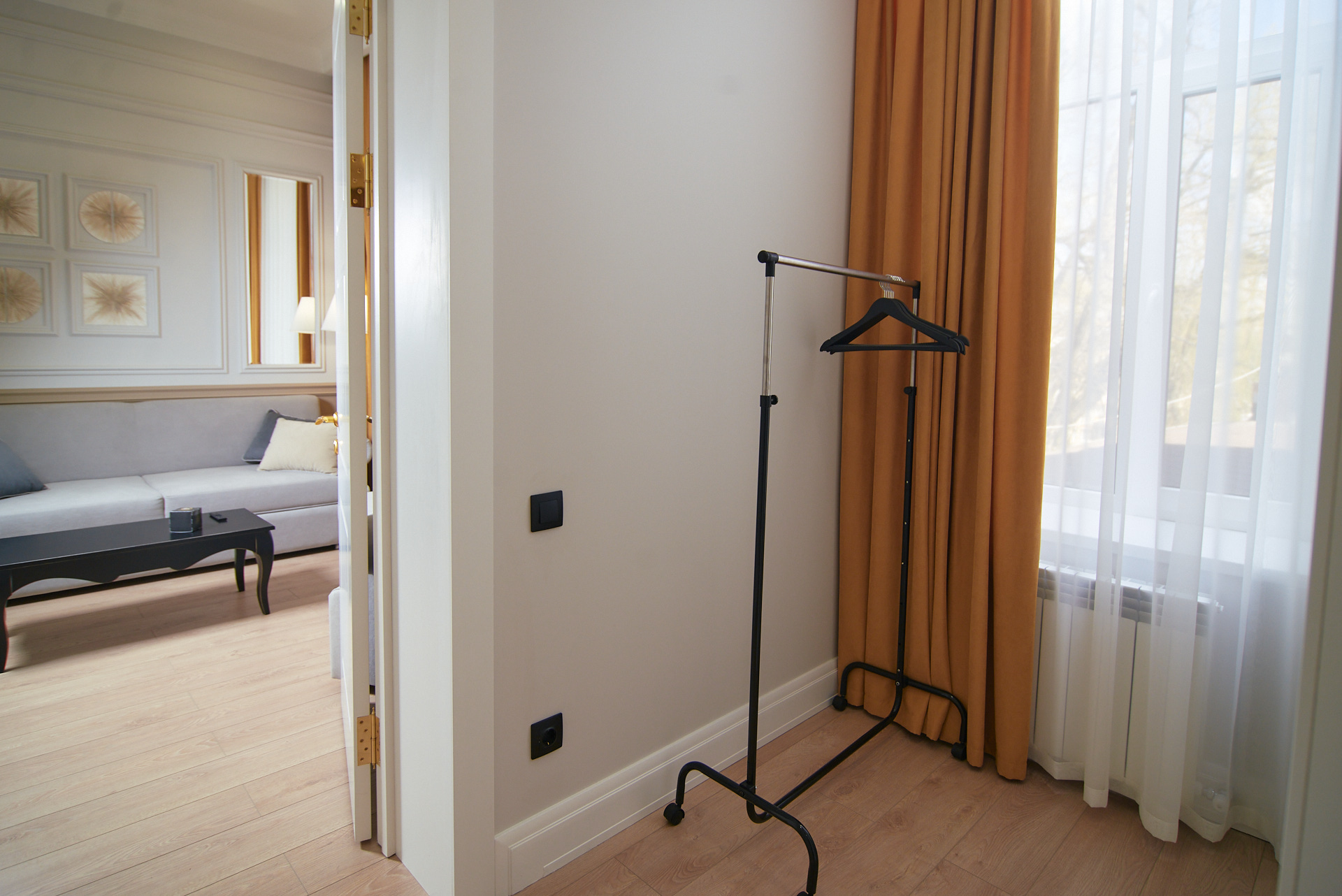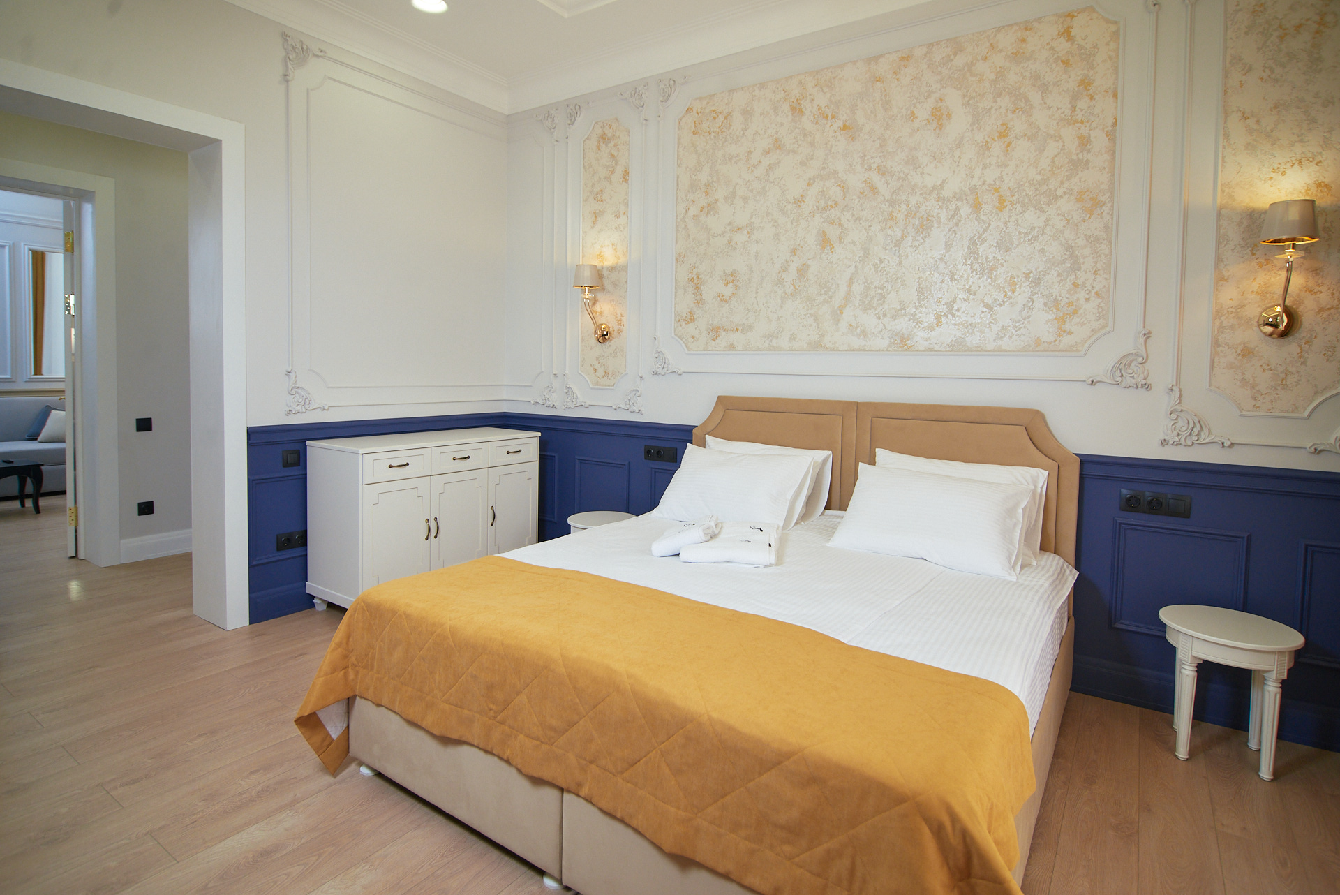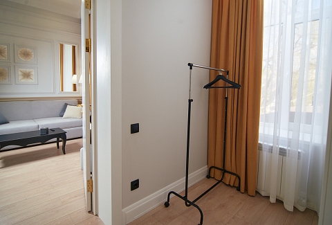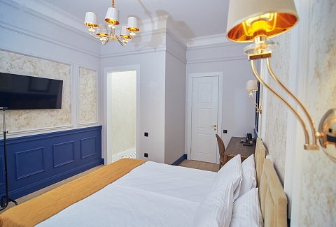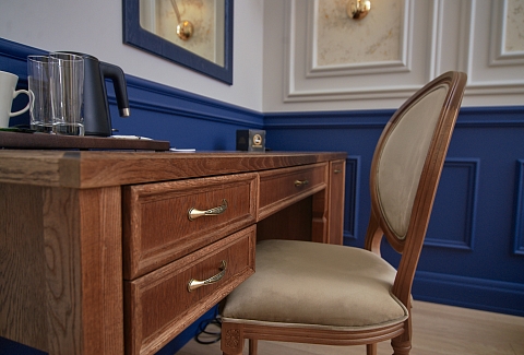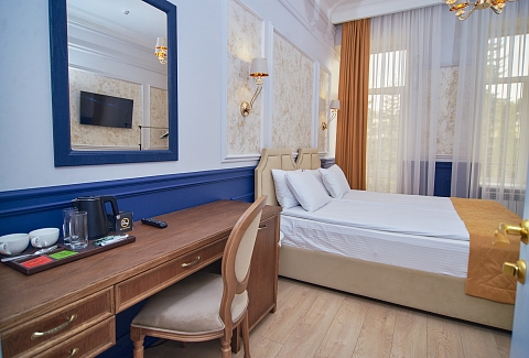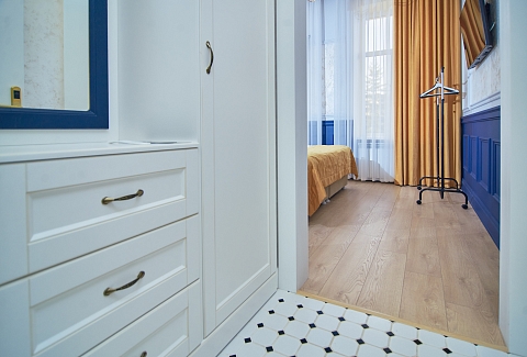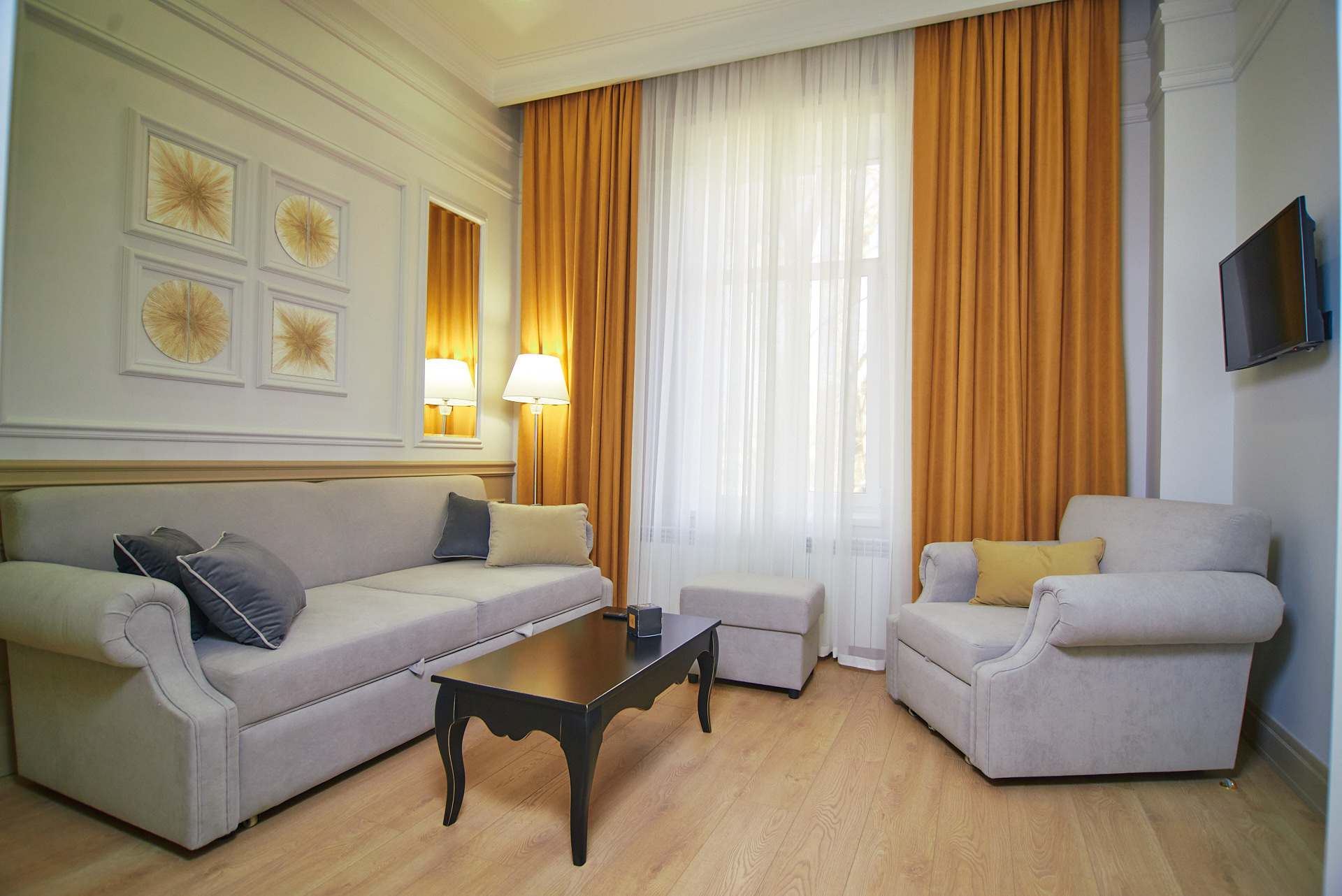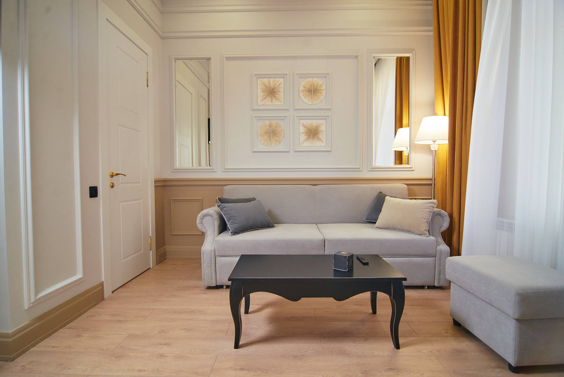 В номере: вешалка, диван, зеркало, кресло, кровать двуспальная, прикроватные столики, стол, стул, шкаф, кондиционер, сейф, телевизор, чайный набор посуды, электрочайник