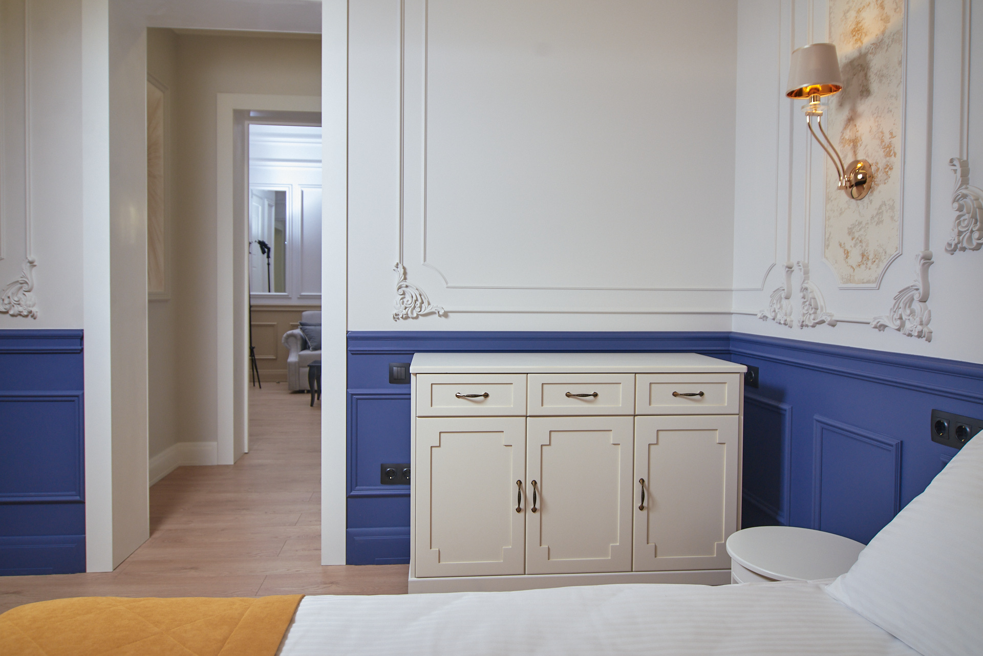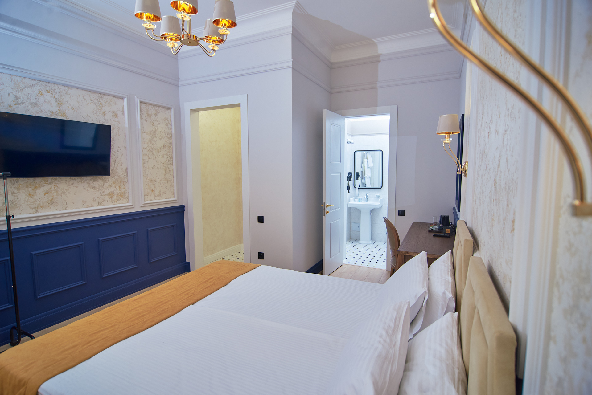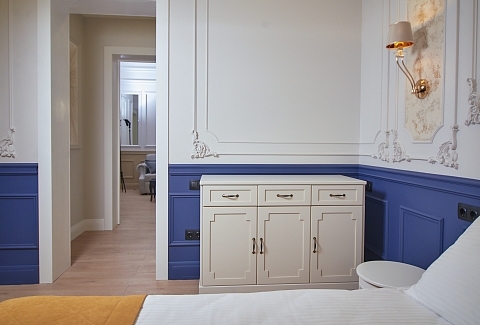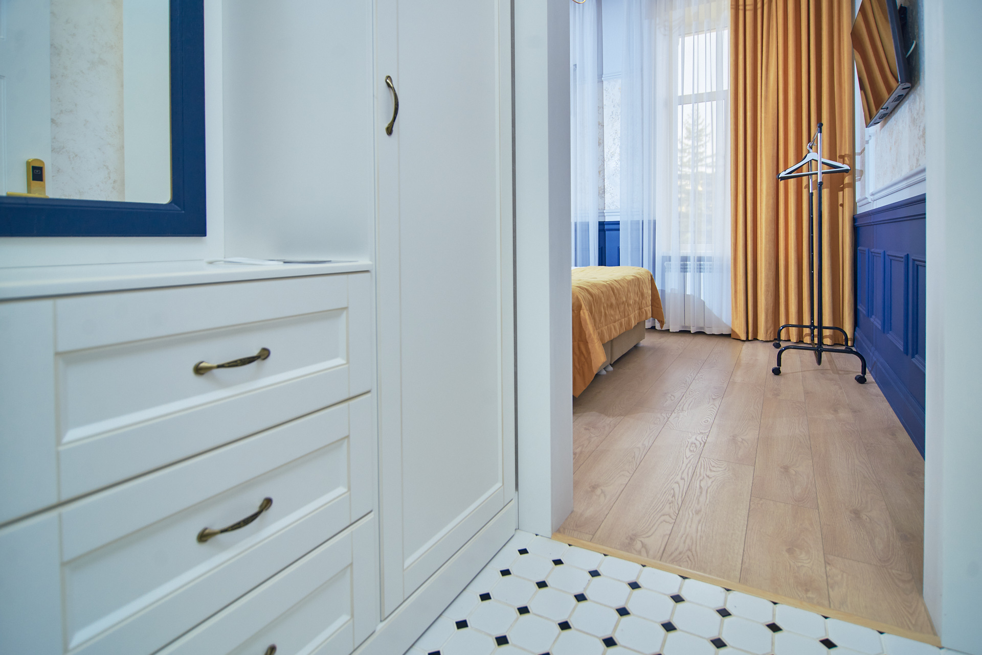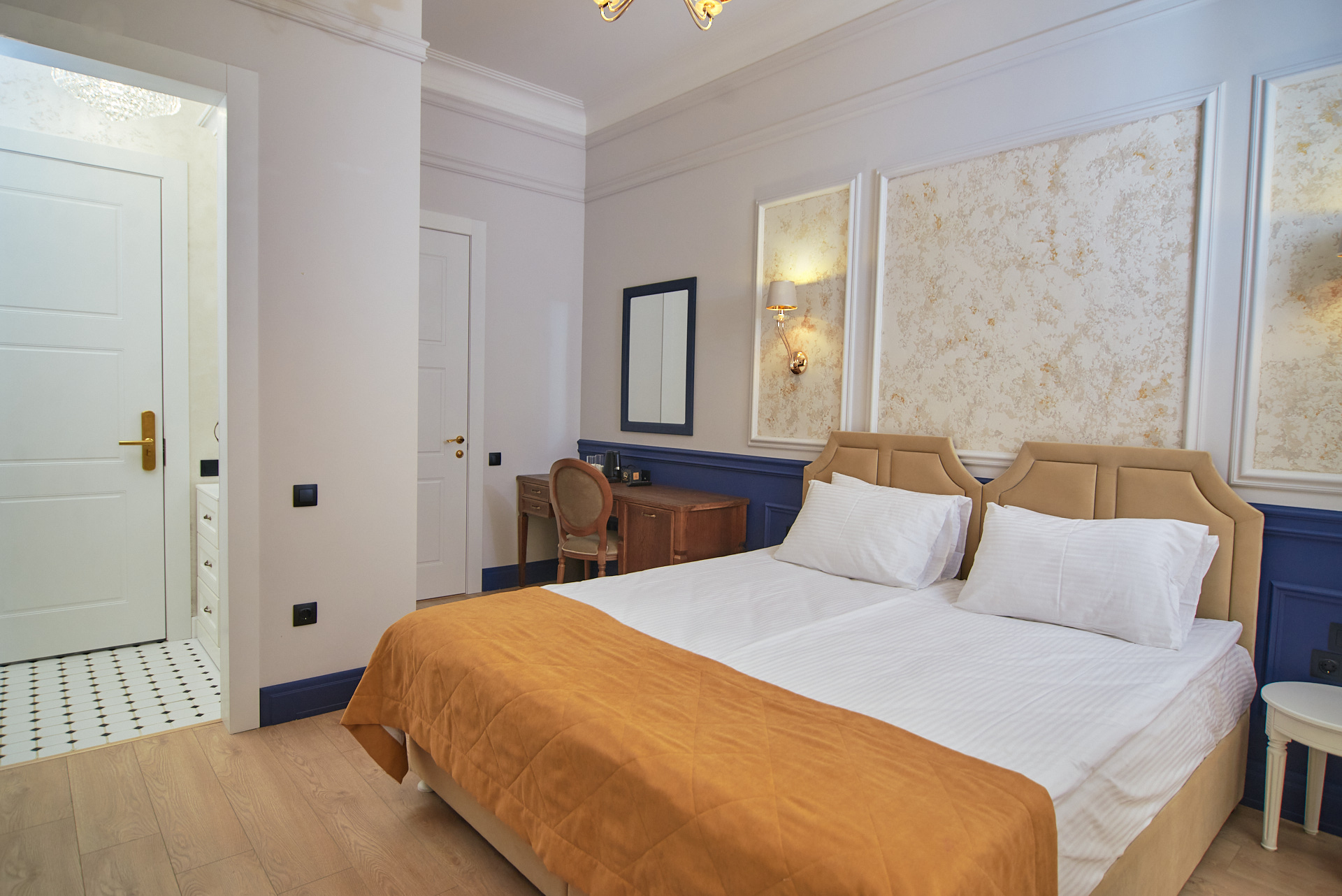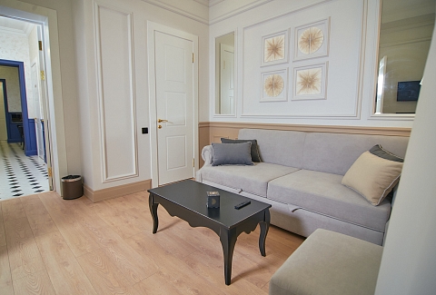 В номере: вешалка, диван, зеркало, кресло, кровать двуспальная, прикроватные столики, стол, стул, шкаф, кондиционер, сейф, телевизор, чайный набор посуды, электрочайник