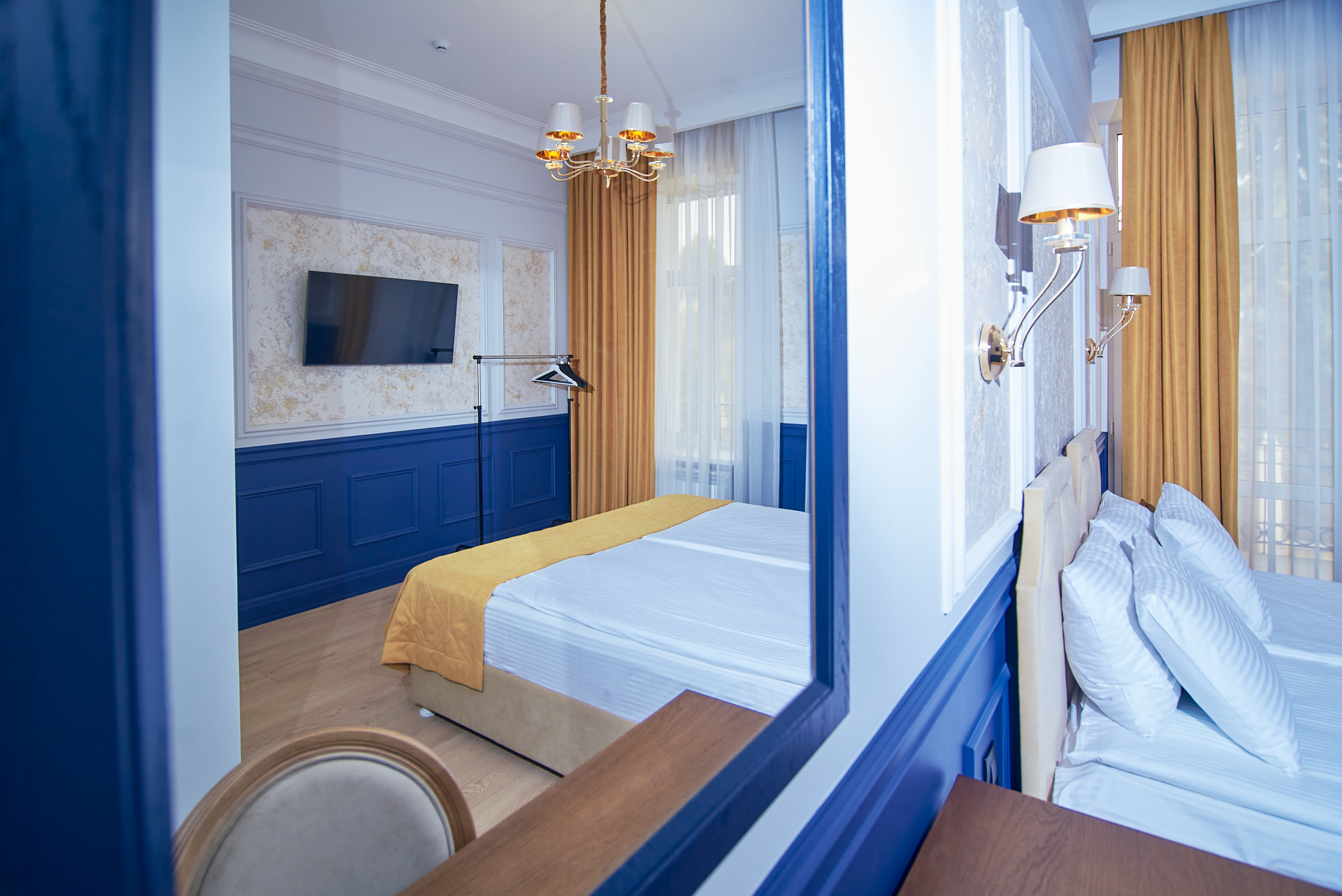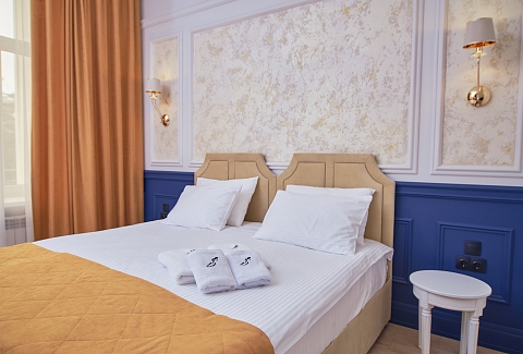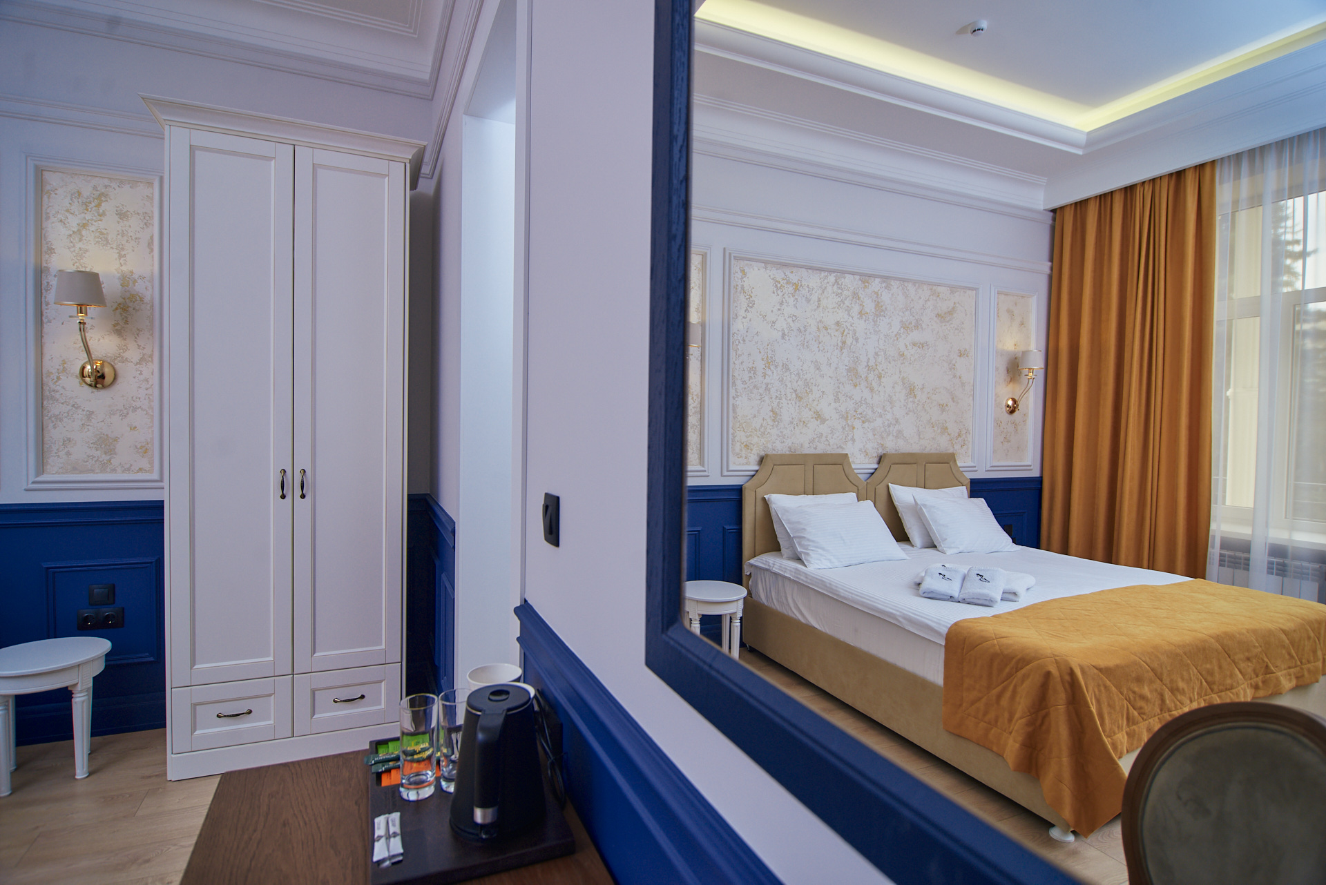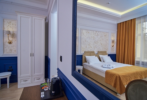 В номере: вешалка, зеркало, кресло-кровать, кровать двуспальная, прикроватные столики, стол, стул, шкаф, кондиционер, сейф, телевизор, чайный набор посуды, электрочайник