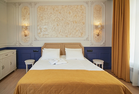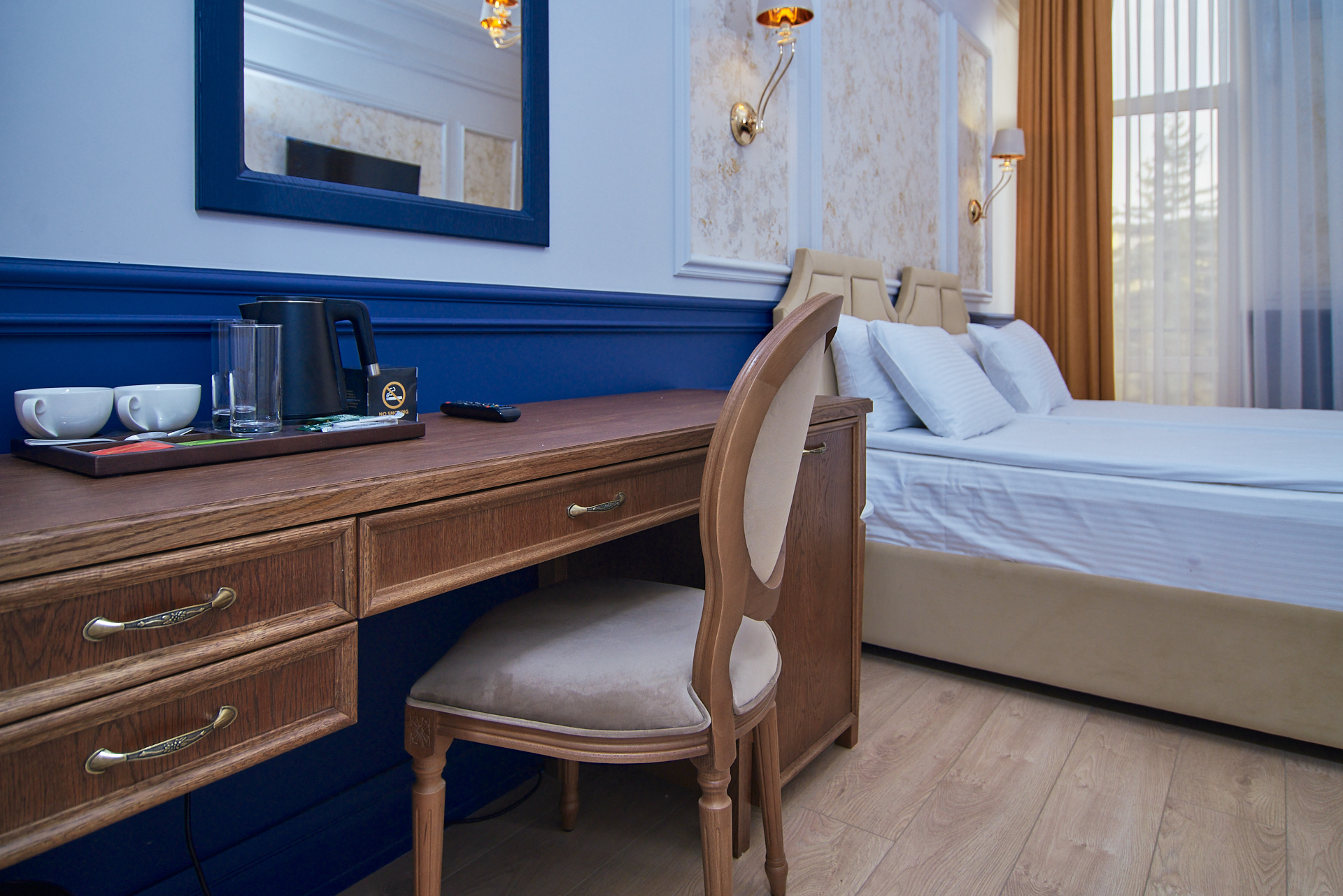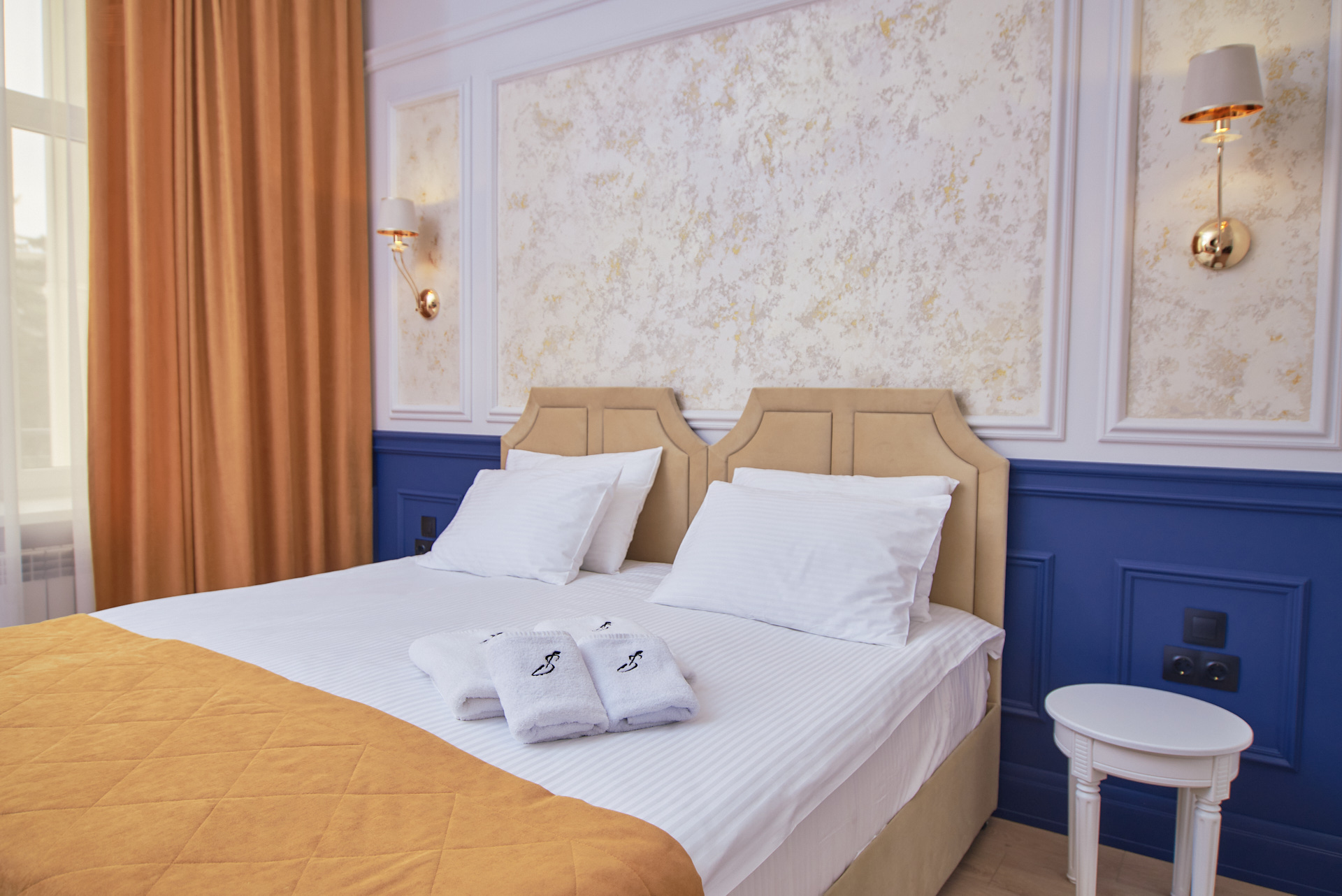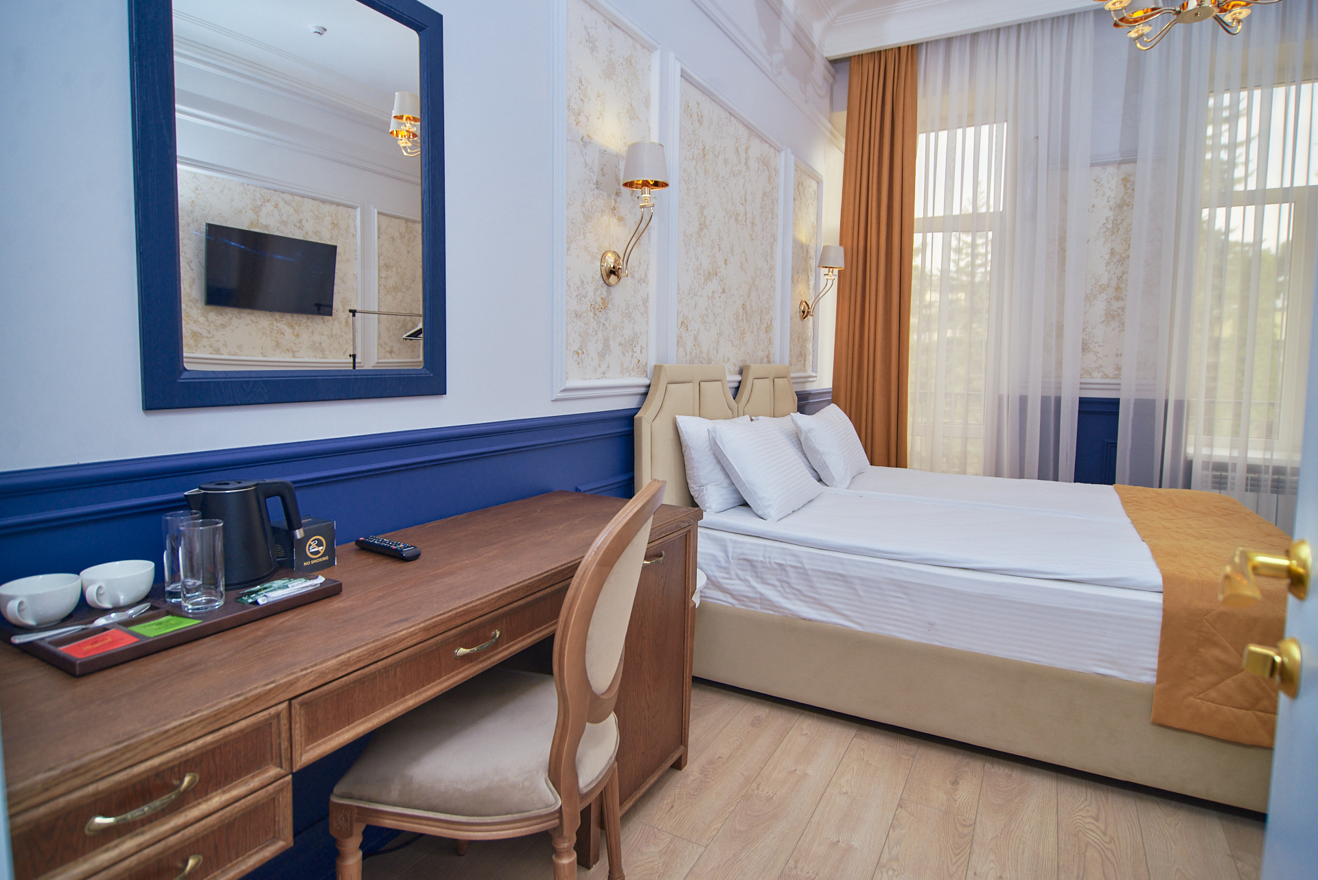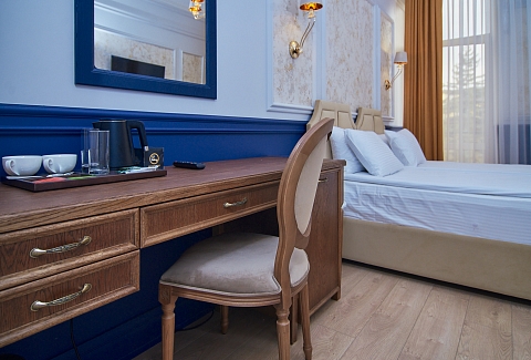 В номере: вешалка, зеркало, кровать двуспальная, прикроватные тумбочки, стол, стул, шкаф, кондиционер, мини-холодильник, сейф, телевизор, чайный набор посуды, электрочайник
