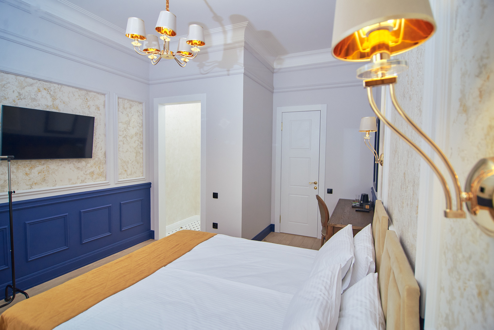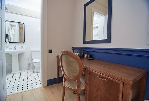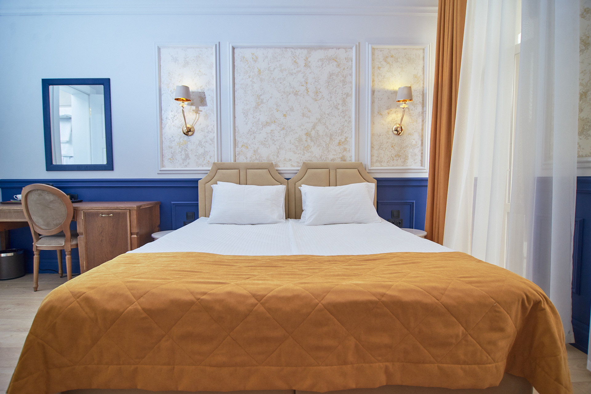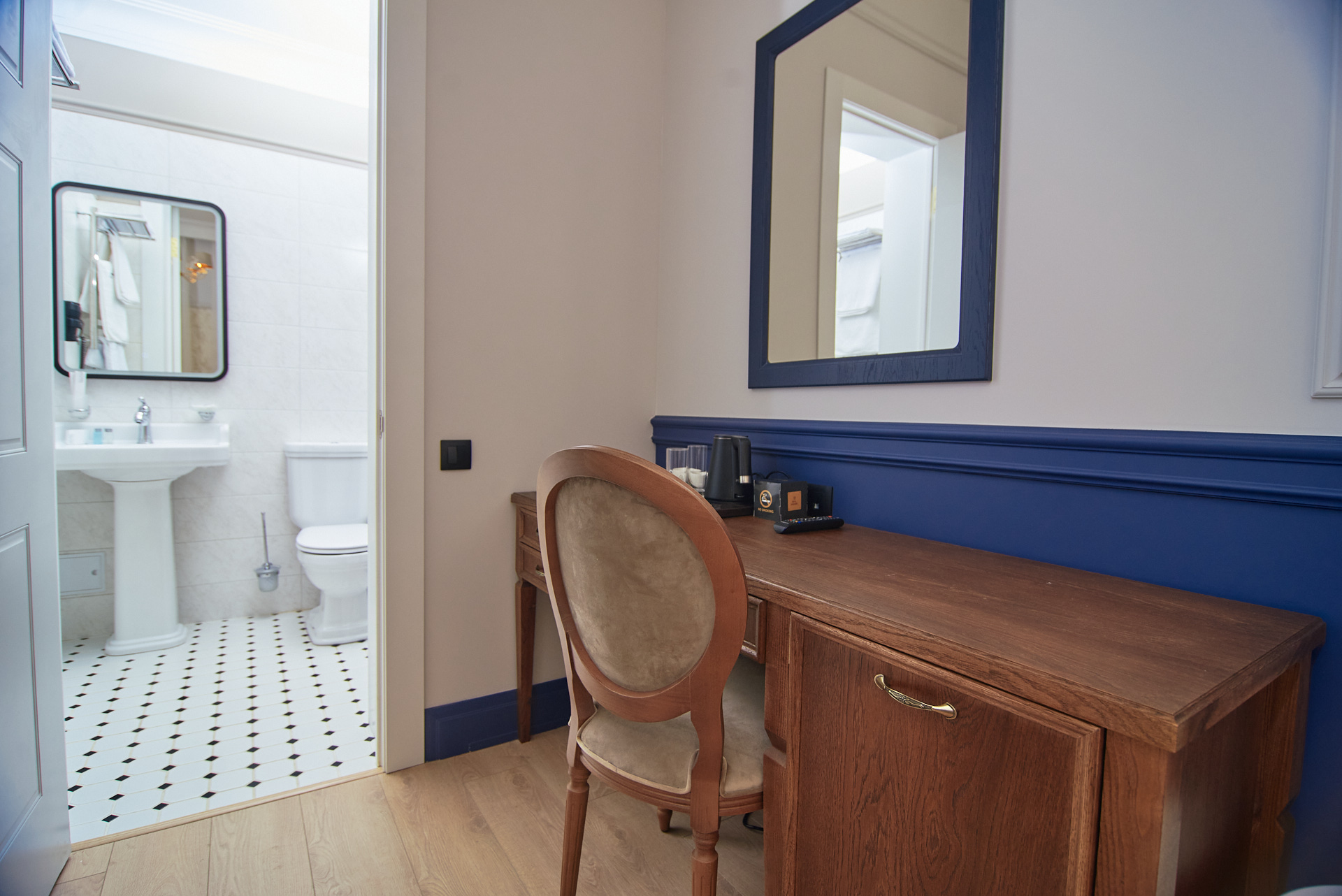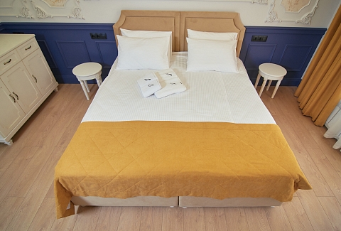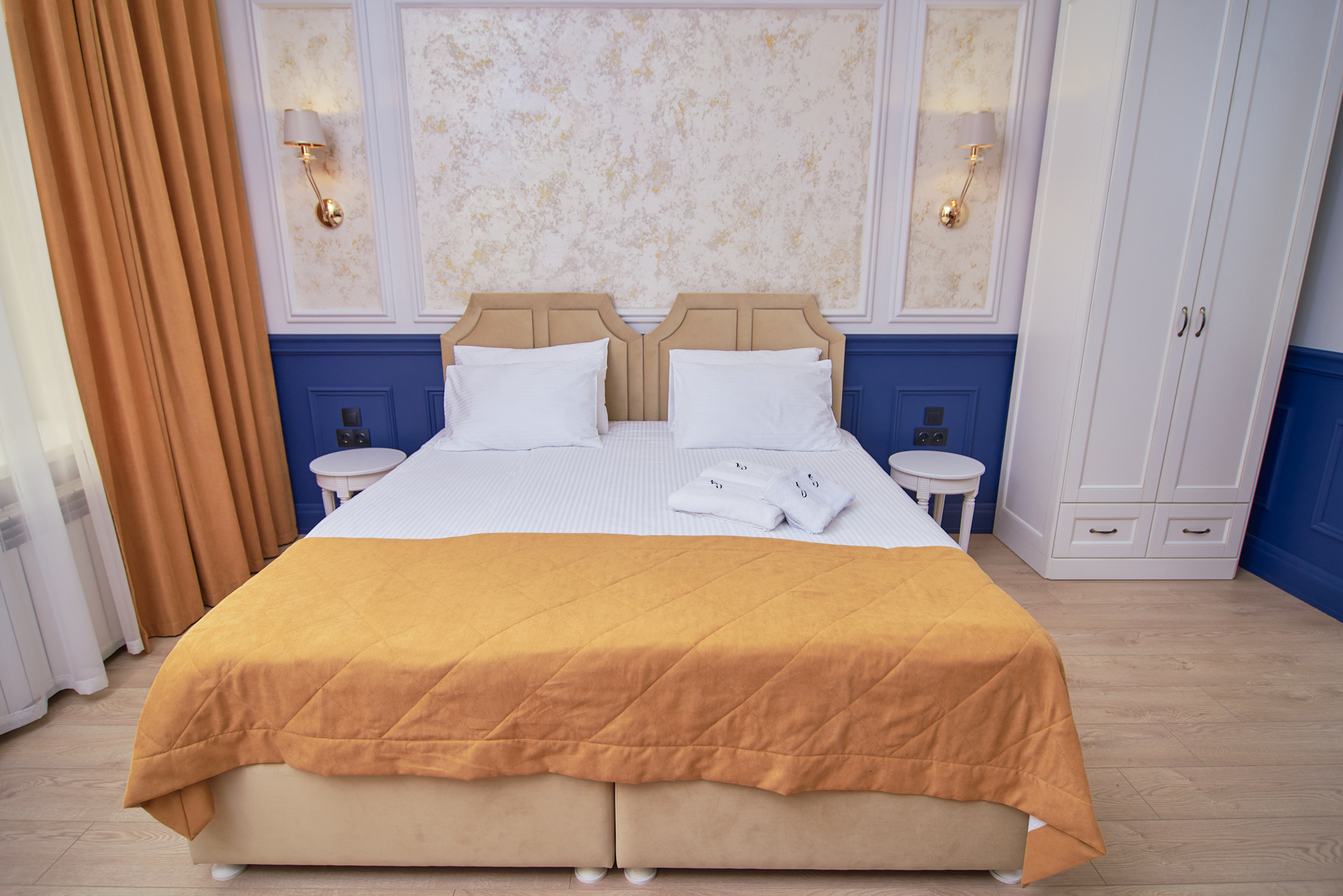 В номере: вешалка, зеркало, кровать двуспальная, прикроватные тумбочки, стол, стул, шкаф, кондиционер, мини-холодильник, сейф, телевизор, чайный набор посуды, электрочайник