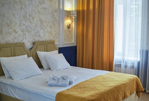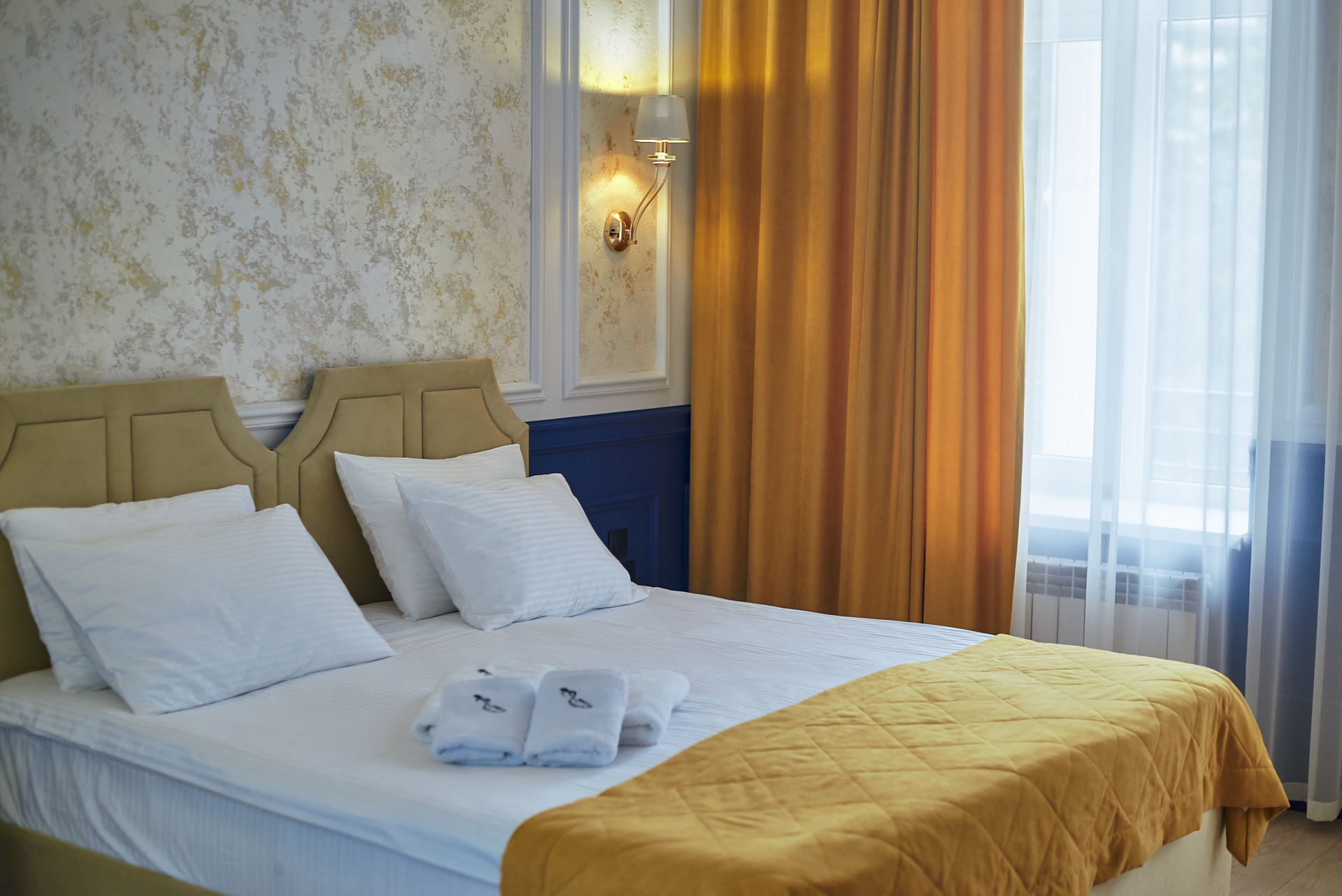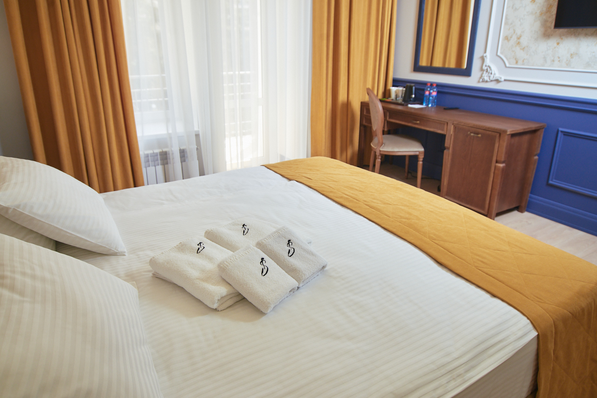 Номерной фонд разного уровня комфорта и вместимости расположился в 3-этажном здании. Каждая комната имеет свой неповторимый интерьер. В них установлена удобна мягкая мебель, шкафы для одежды. Также к услугам гостей кондиционер, телевизор, мини-холодильник, сейф, электрический чайник. Санузел индивидуальный, с душевой кабиной, туалетными принадлежностями, мягкими полотенцами, халатами и тапочками. В каждом номере предусмотрен балкон. Питание организуется в кафе.
