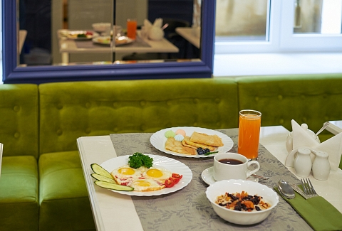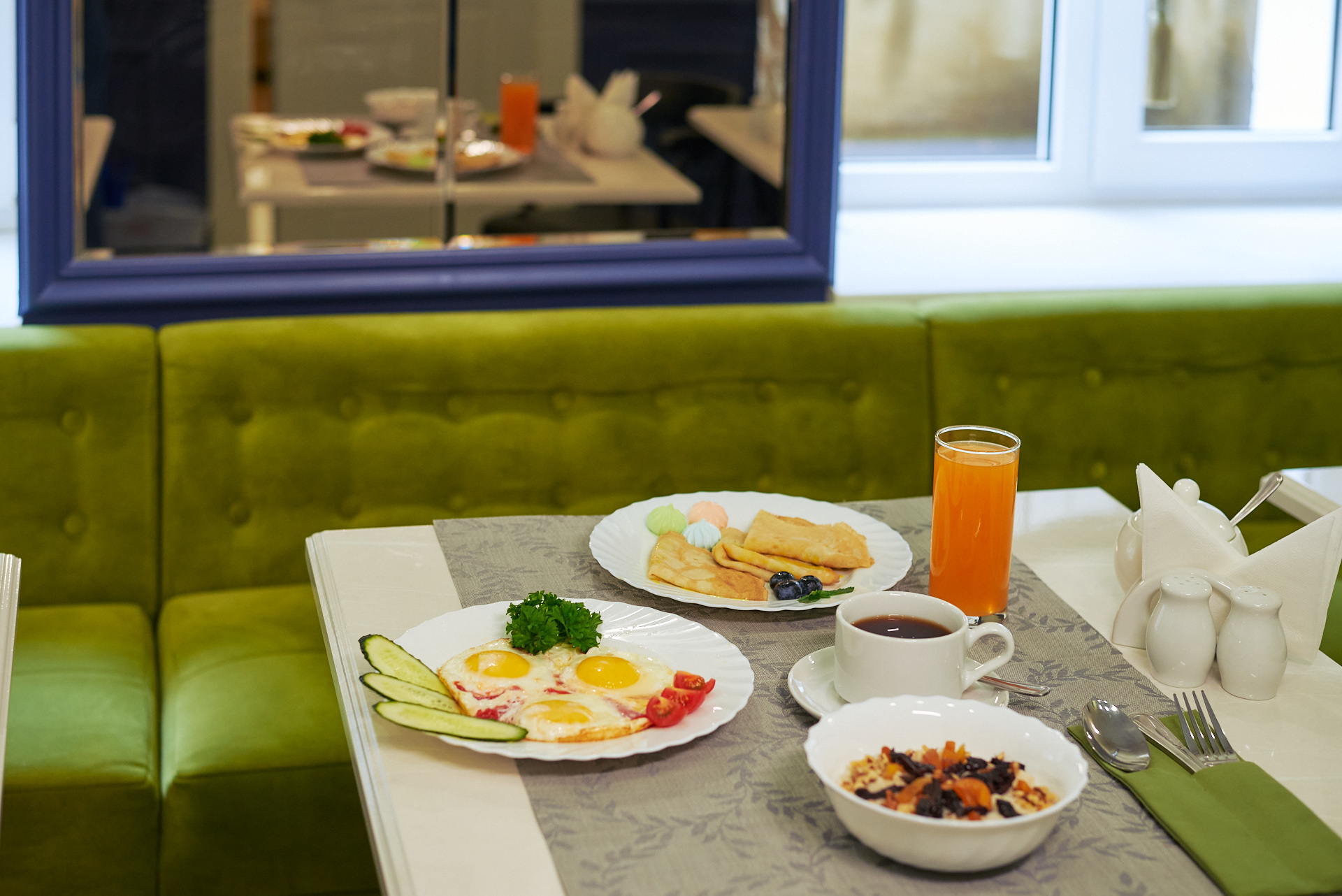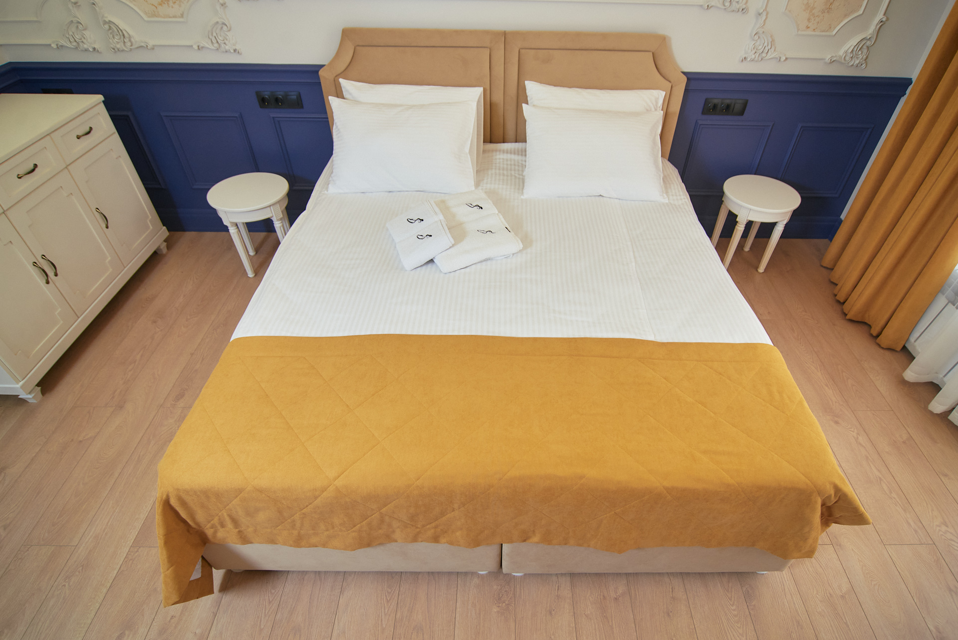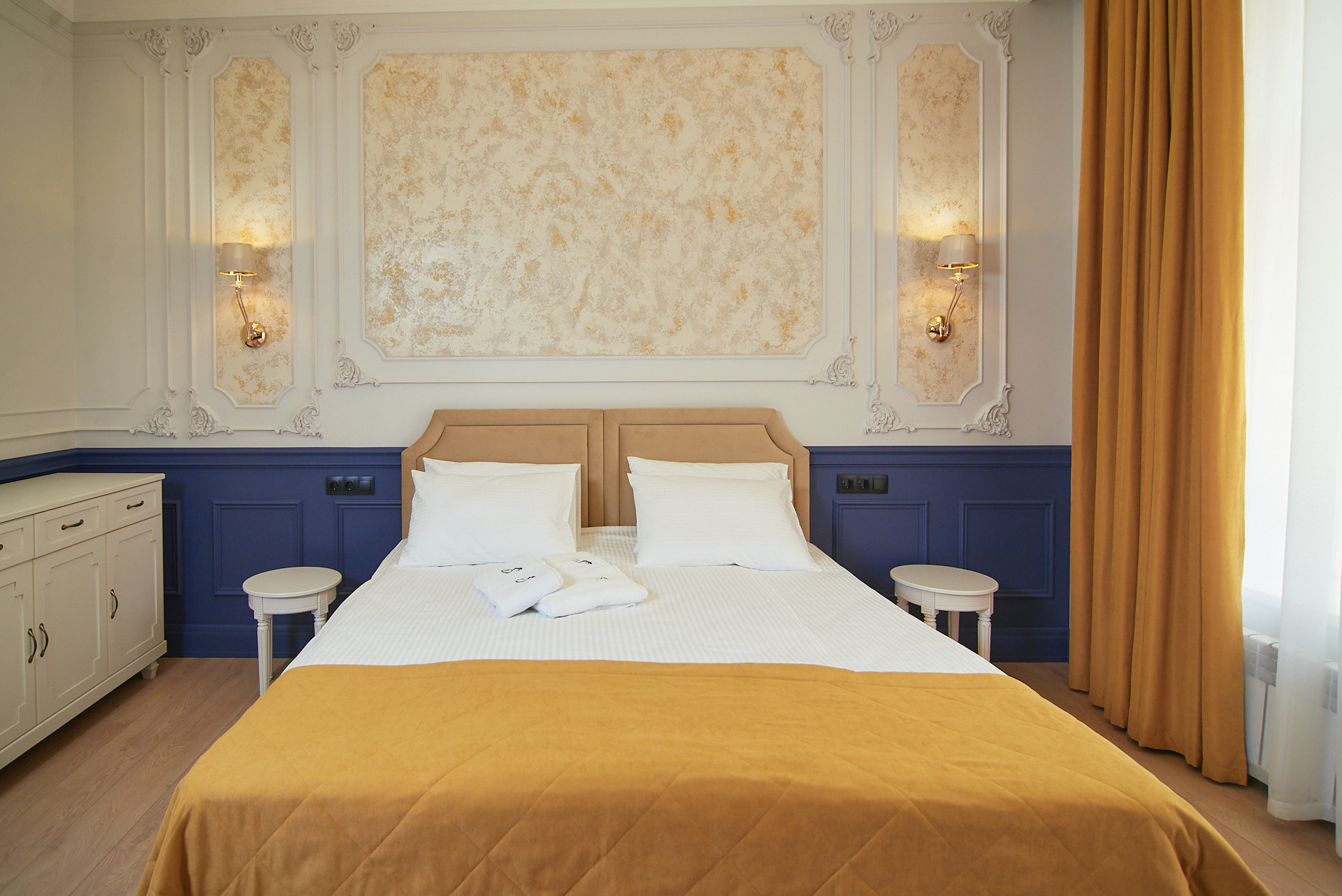Номерной фонд разного уровня комфорта и вместимости расположился в 3-этажном здании. Каждая комната имеет свой неповторимый интерьер. В них установлена удобна мягкая мебель, шкафы для одежды. Также к услугам гостей кондиционер, телевизор, мини-холодильник, сейф, электрический чайник. Санузел индивидуальный, с душевой кабиной, туалетными принадлежностями, мягкими полотенцами, халатами и тапочками. В каждом номере предусмотрен балкон. Питание организуется в кафе.