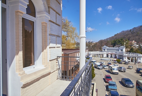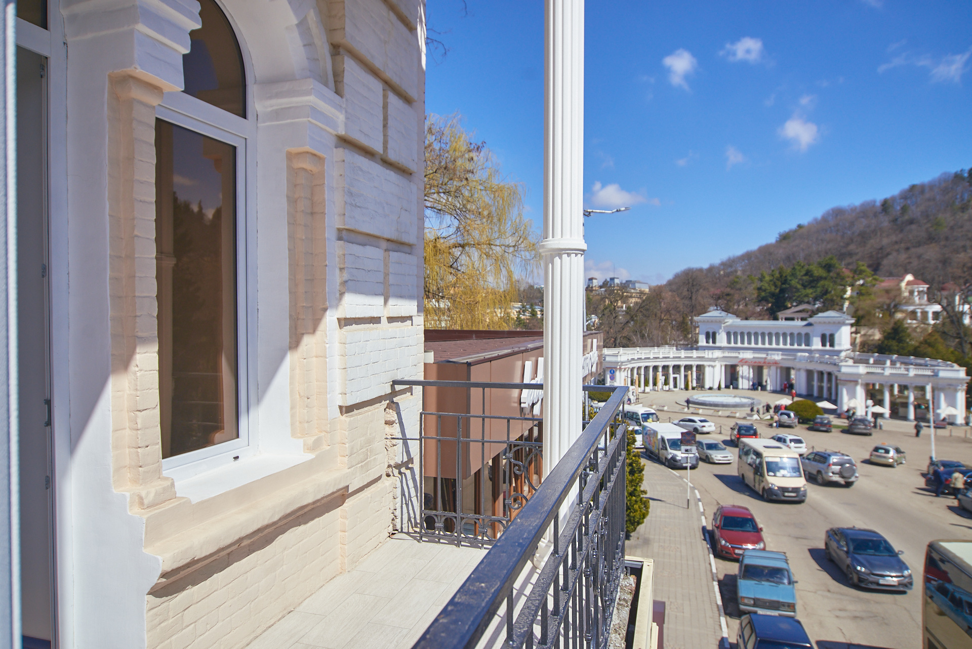 Поездом до ж/д вокзала г. Кисловодск, далее на маршрутке №8 до остановки «Колоннада», далее пройти пешком 197 м до бутик-отеля.