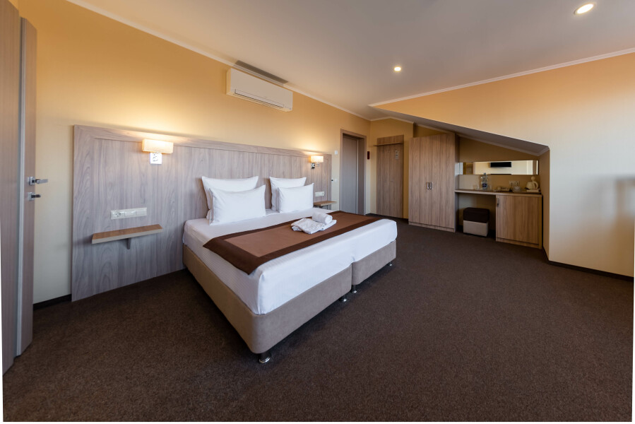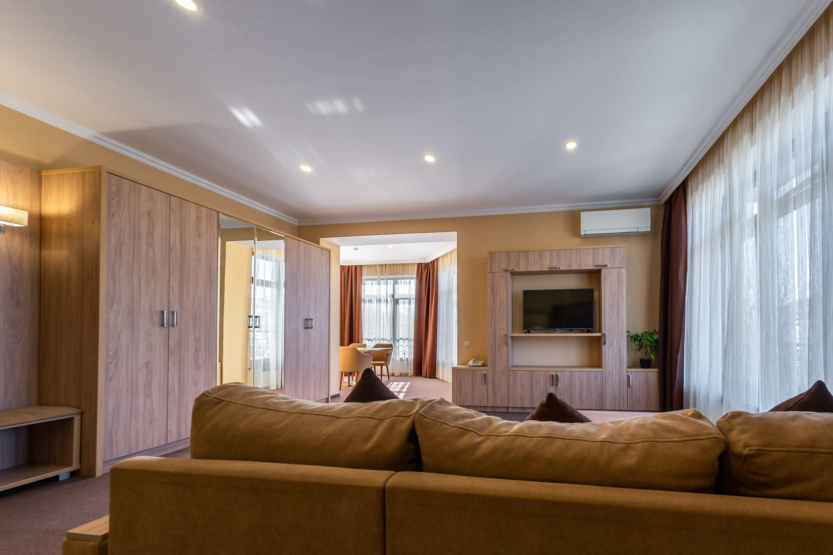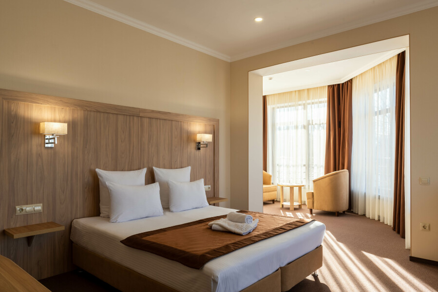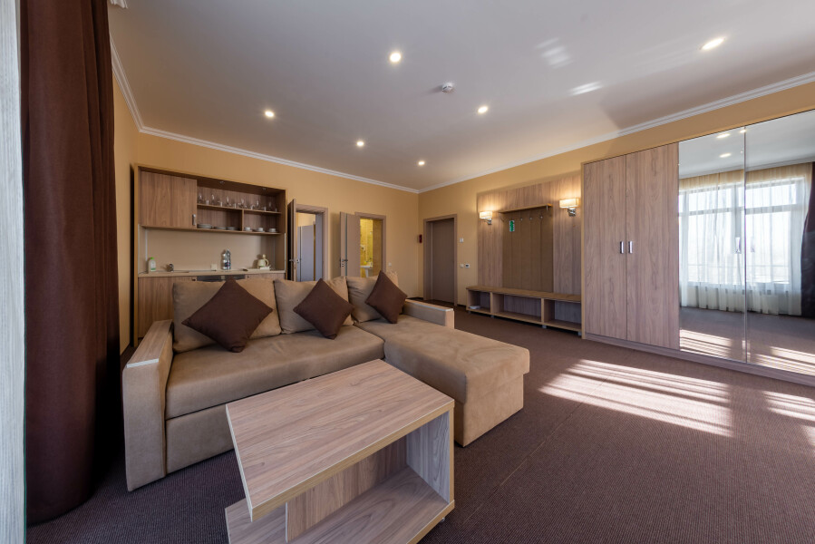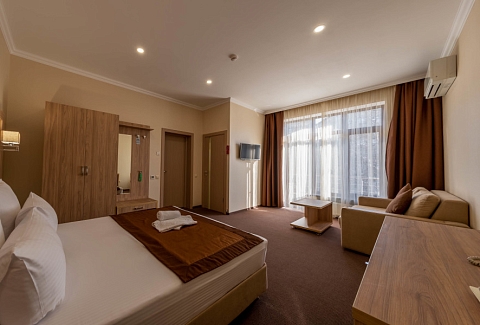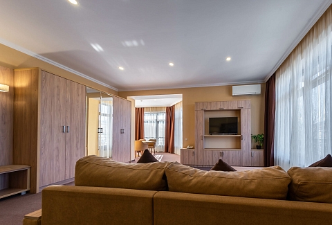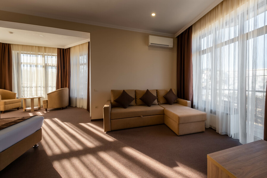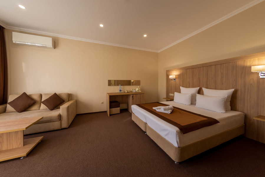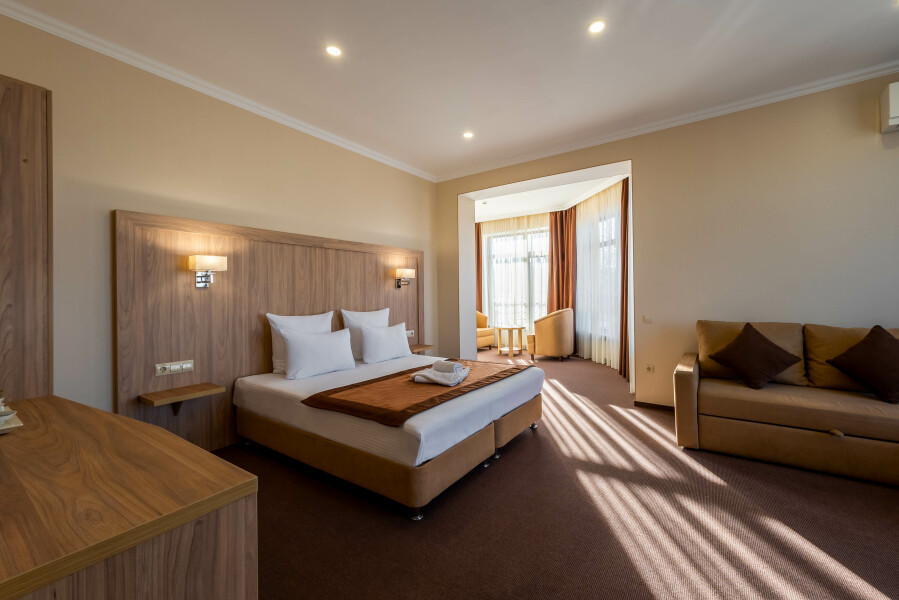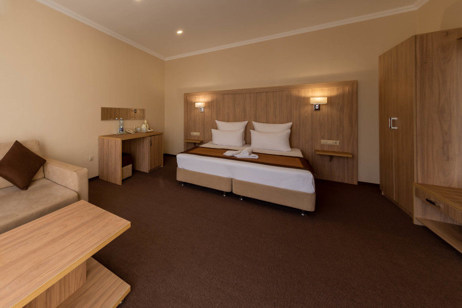 В номере: диван раскладной, кровать двуспальная, прикроватные тумбочки, стол, стулья, шкаф, кондиционер, мини-холодильник, сейф, телевизор, телефон, чайная станция