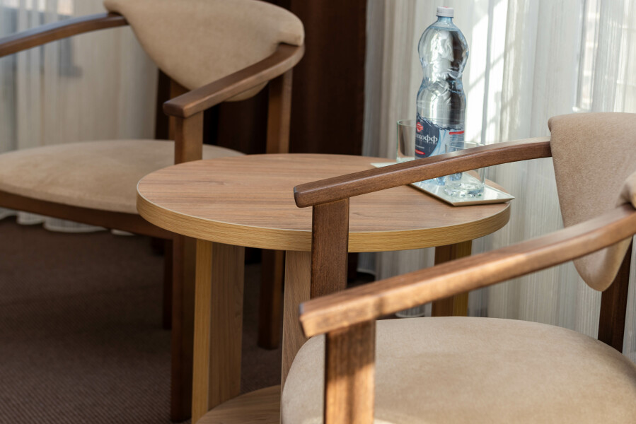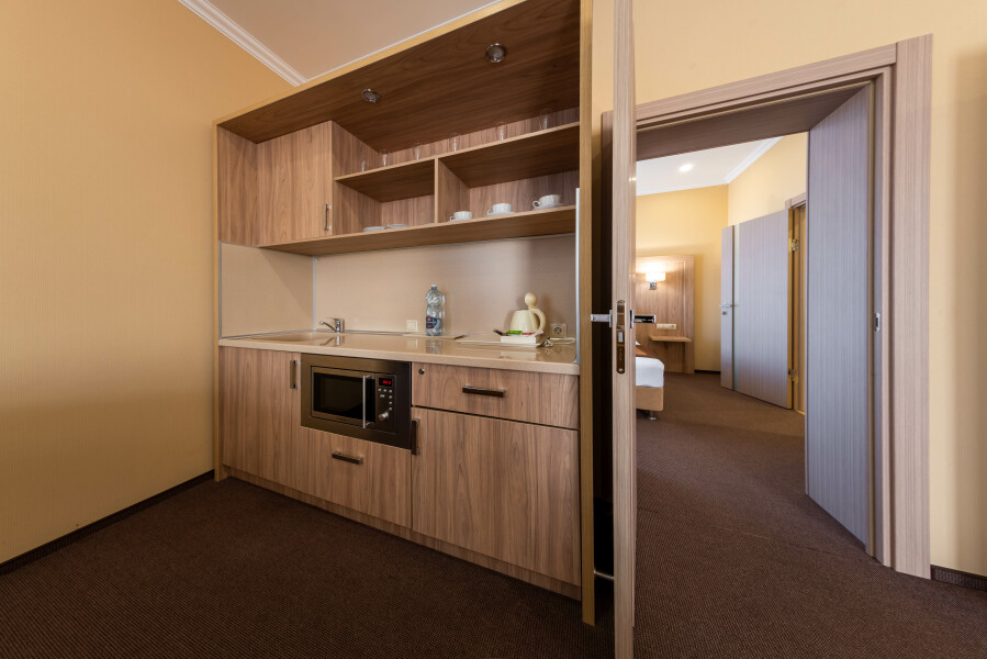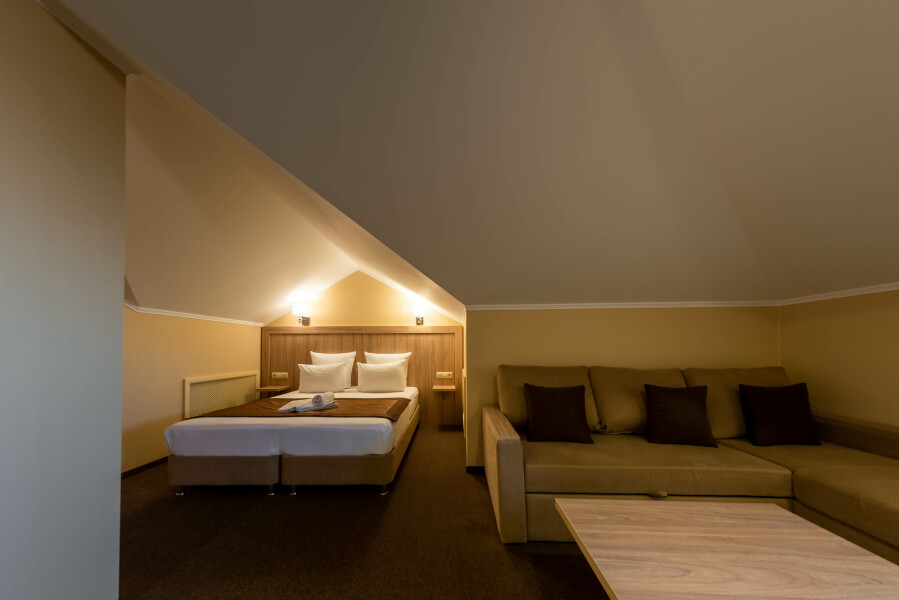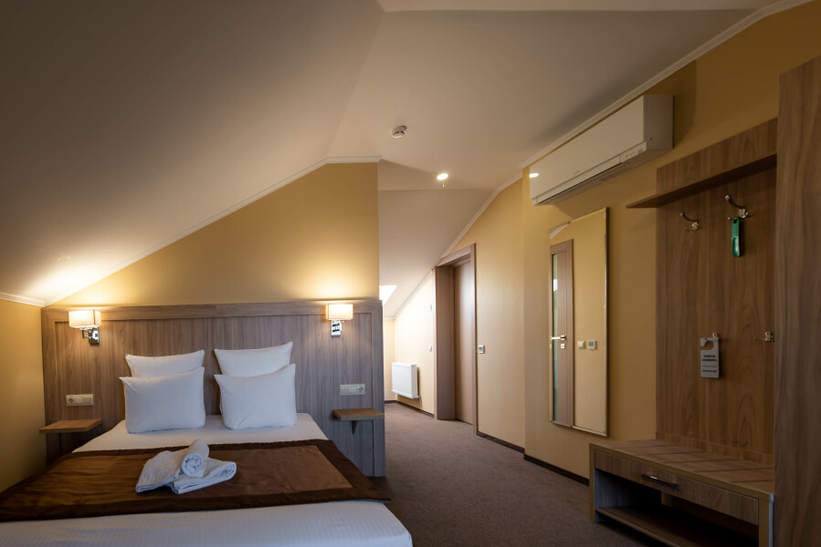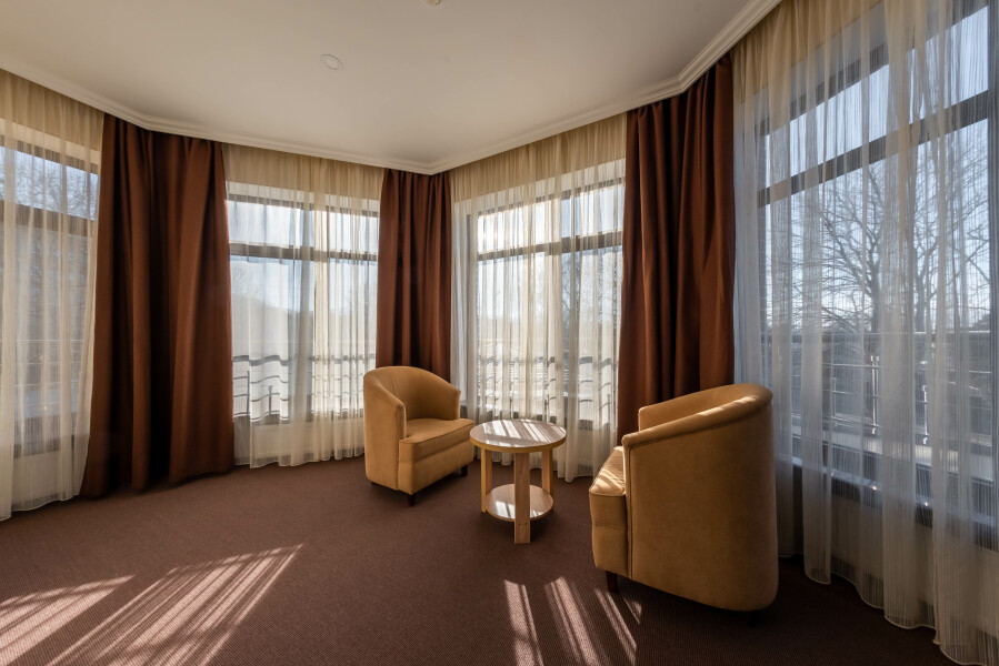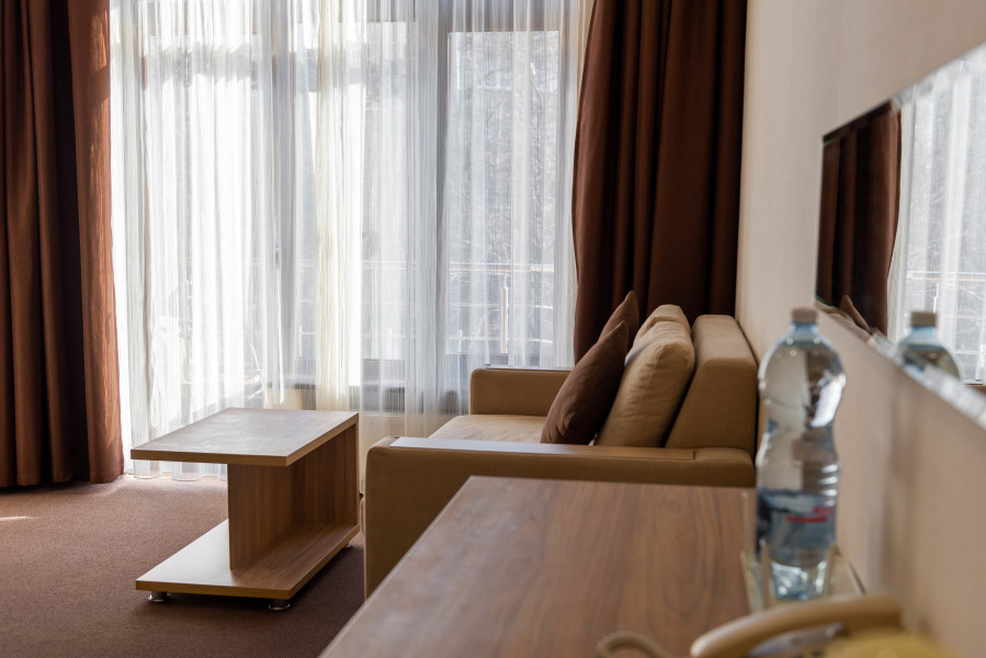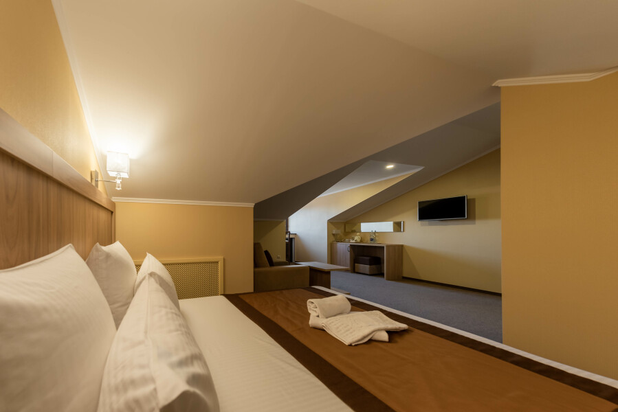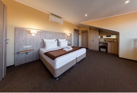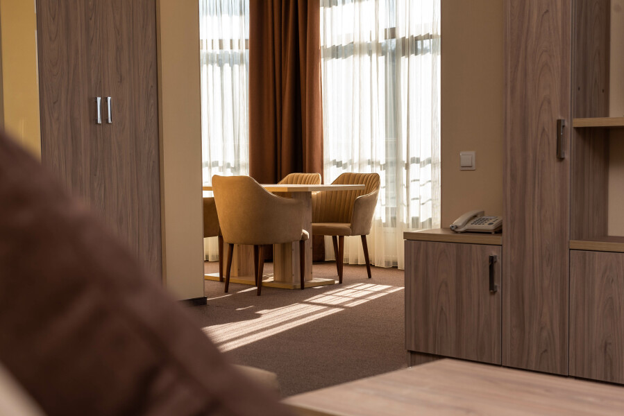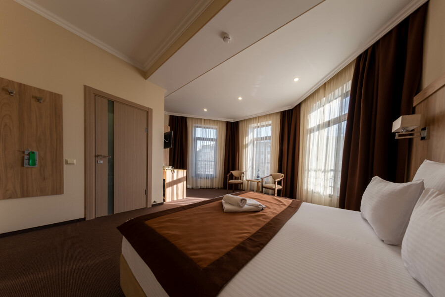 В номере: диван раскладной, кровать двуспальная, прикроватные тумбочки, стол, стулья, шкаф, кондиционер, мини-холодильник, сейф, телевизор, телефон, чайная станция