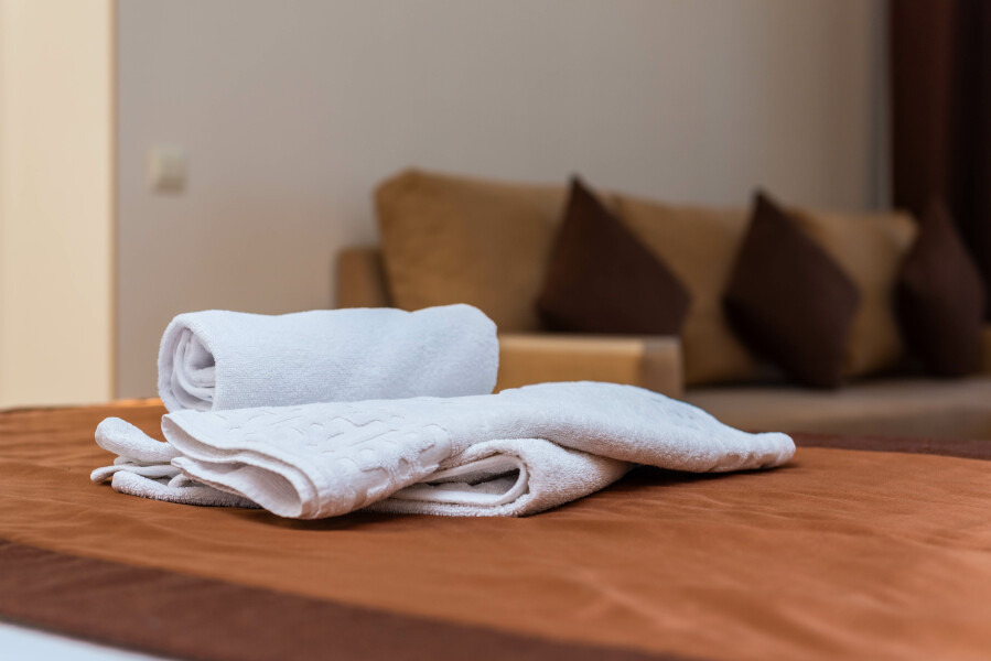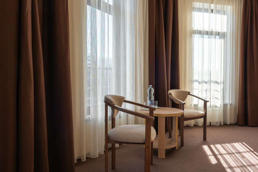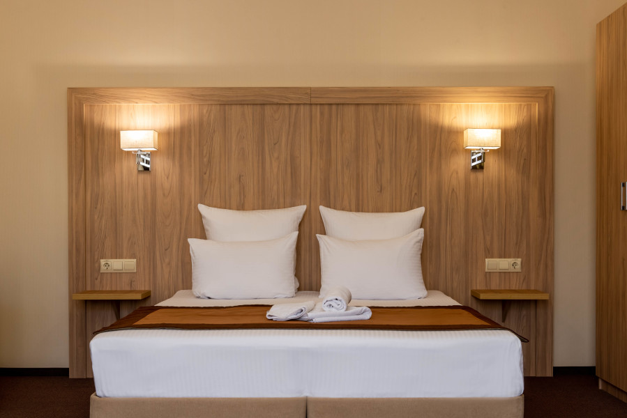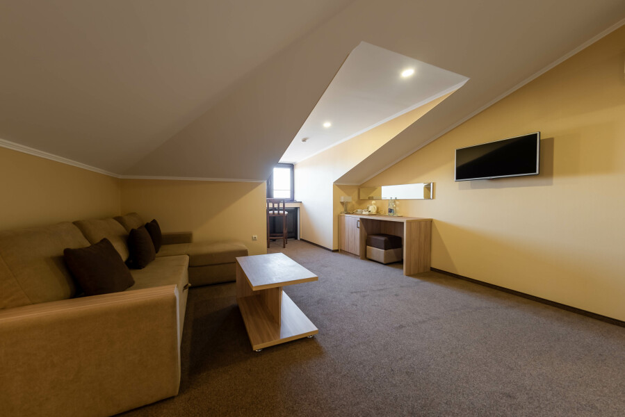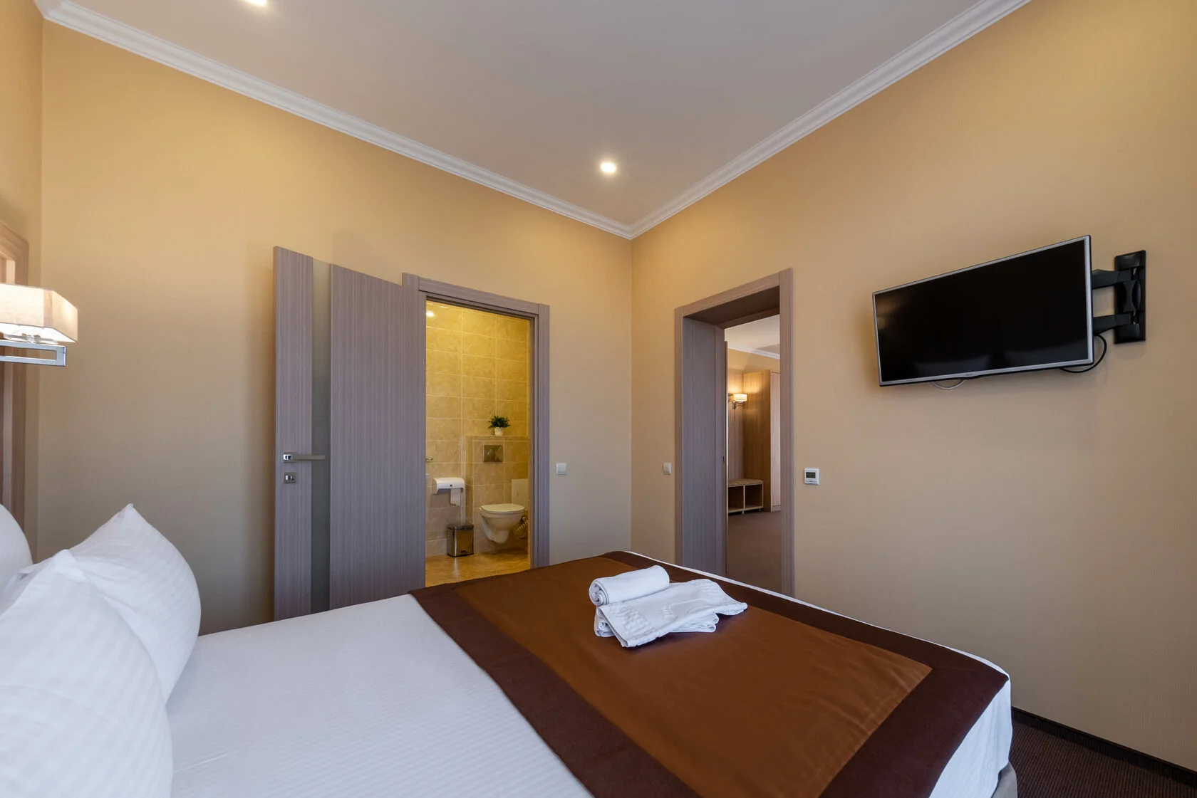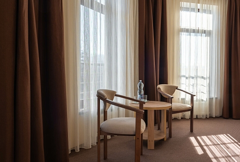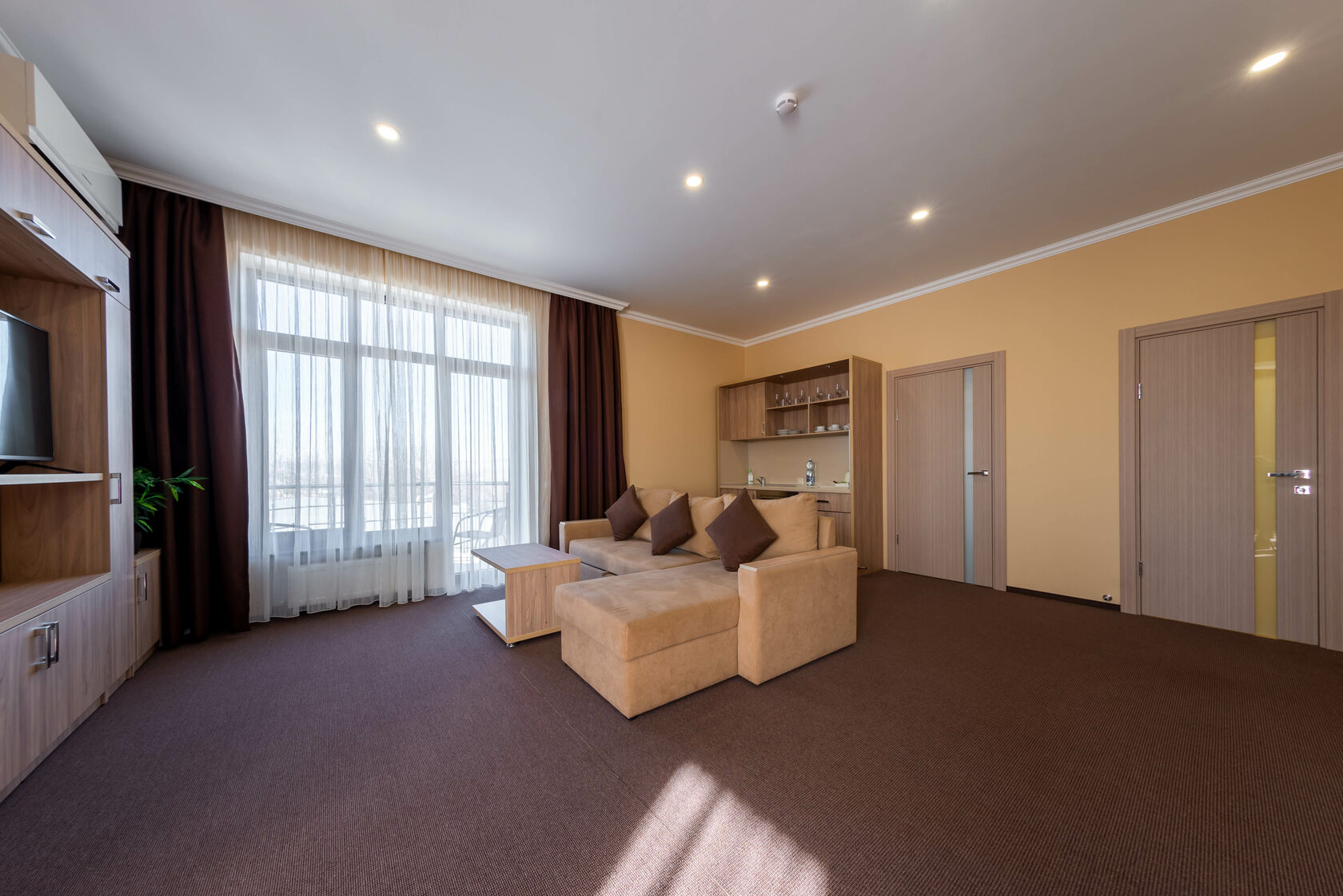 В номере: диван раскладной, кровать двуспальная, прикроватные тумбочки, стол, стулья, шкаф, гладильная доска, кондиционер, мини-холодильник, сейф, телевизор, телефон, утюг, чайник