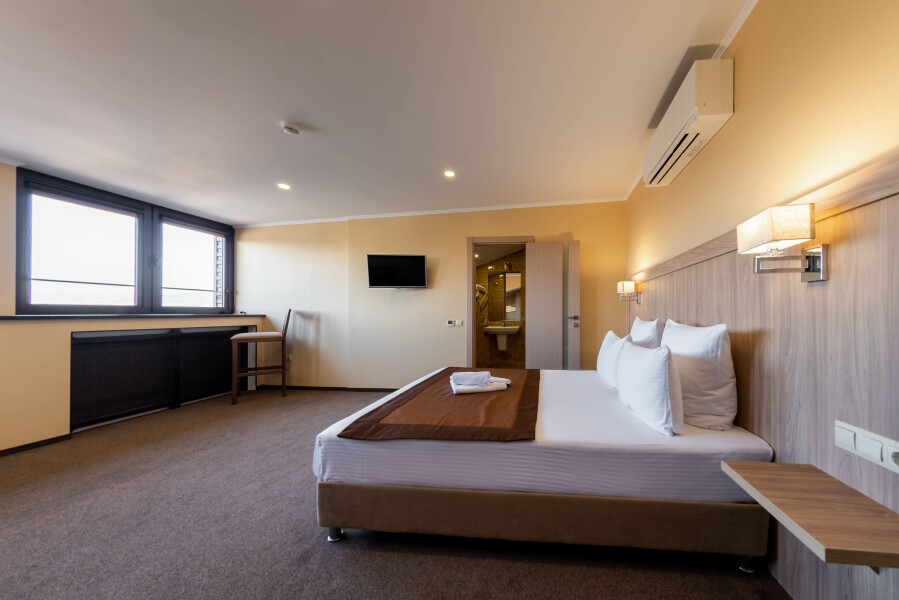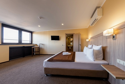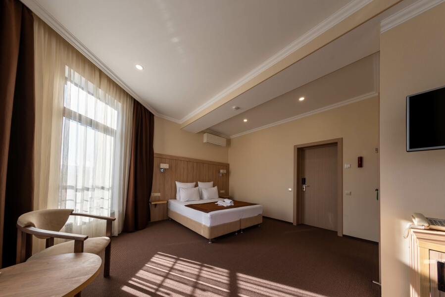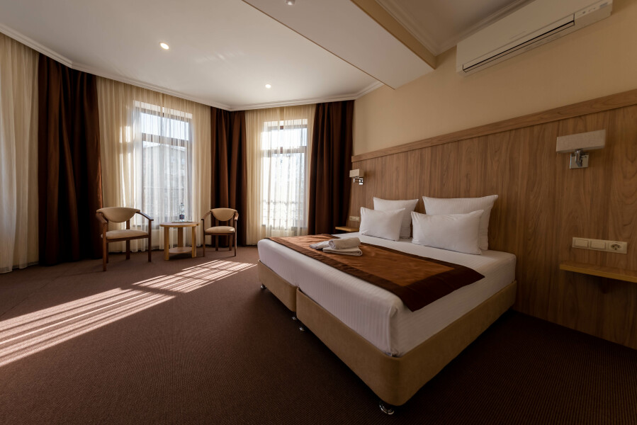 В номере: кровать двуспальная, прикроватные тумбочки, стол, стулья, шкаф, кондиционер, мини-холодильник, сейф, телевизор, телефон, чайная станция