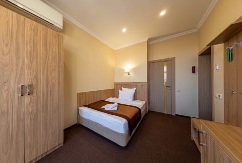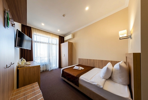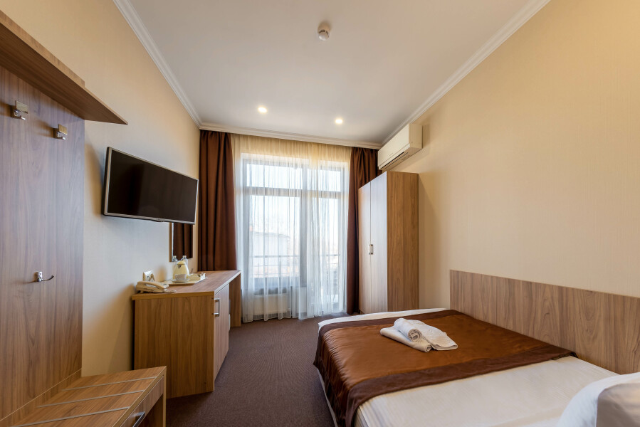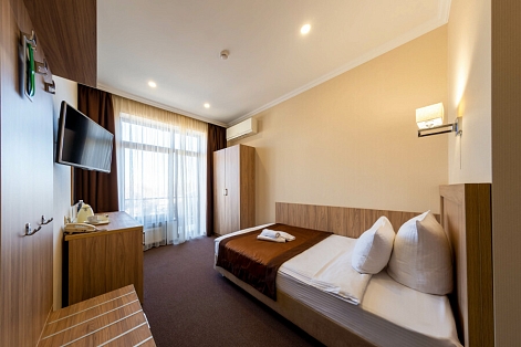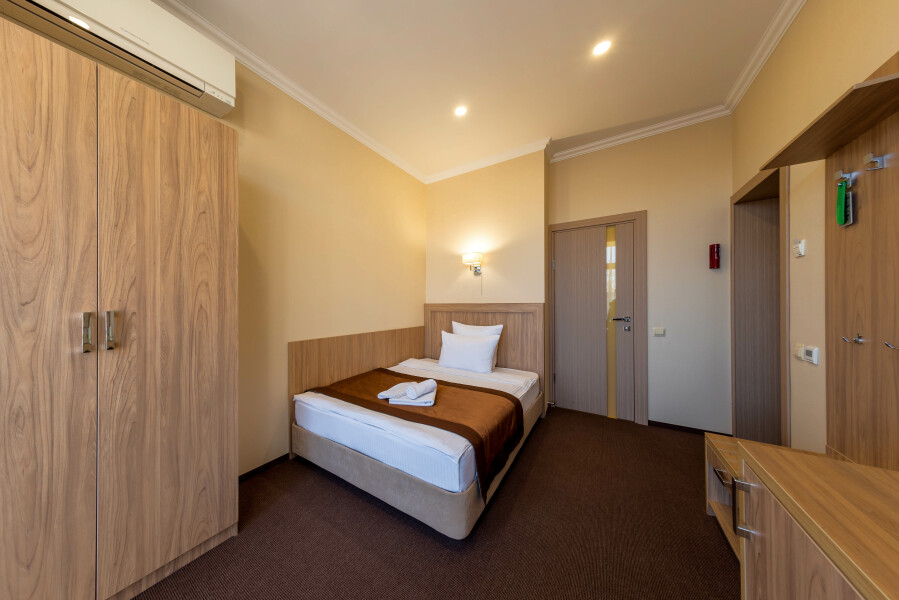 В номере: кровать односпальная, прикроватная тумбочка, стол, стул, шкаф, кондиционер, мини-холодильник, сейф, телевизор, чайная станция