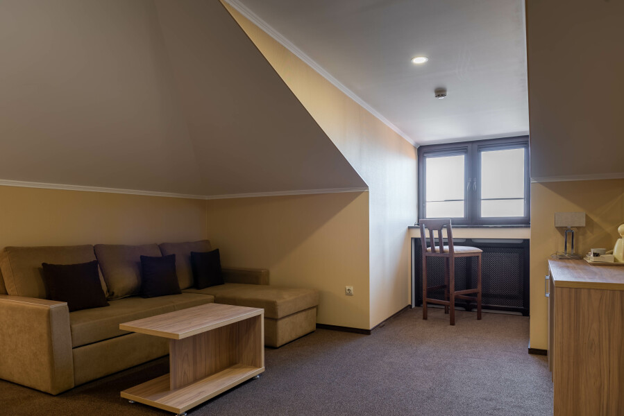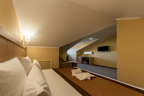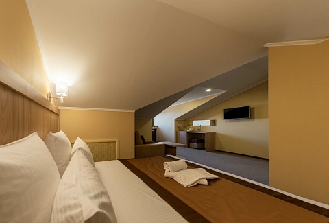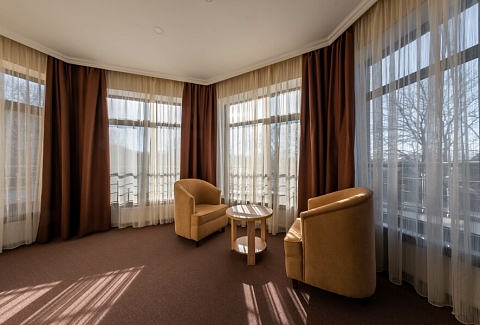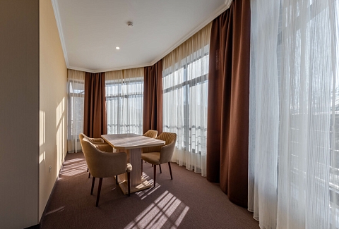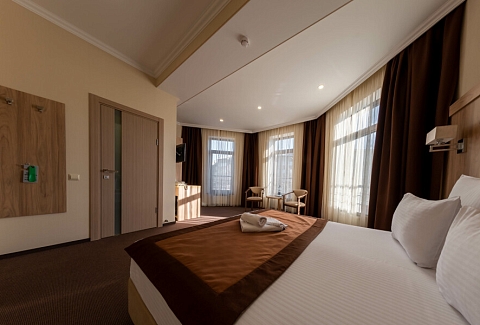 В номере: диван раскладной, кровати односпальные /одна двуспальная кровать, стол, стулья, шкаф, кондиционер, мини-холодильник, сейф, телевизор, телефон, чайная станция