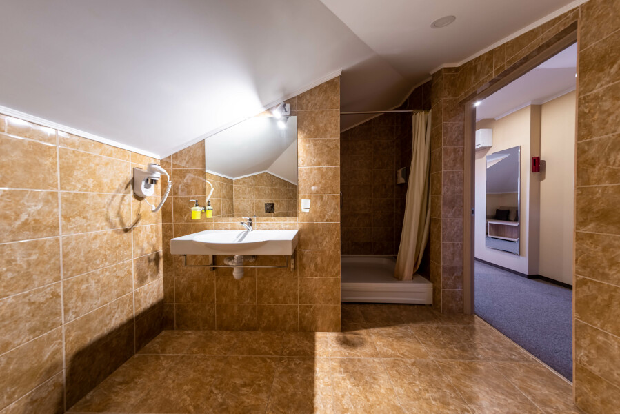 Санузел: с душевой кабиной, тапочки, туалетные принадлежности, фен