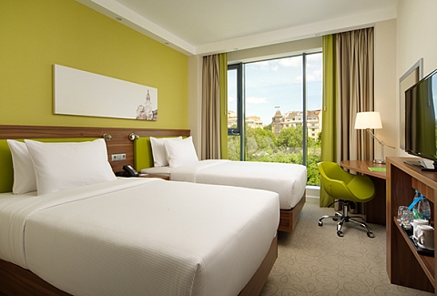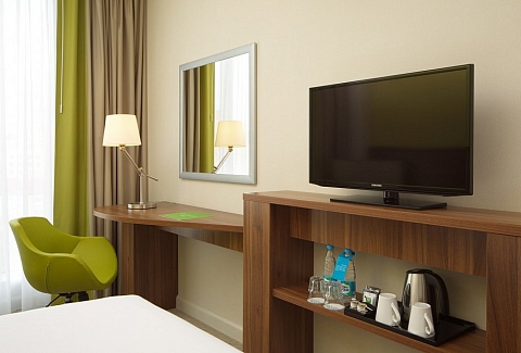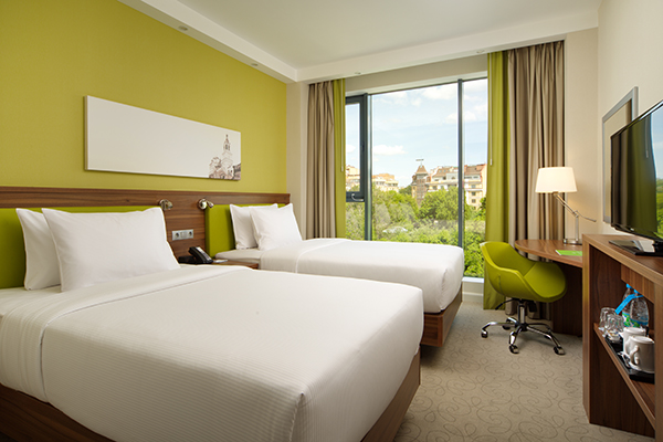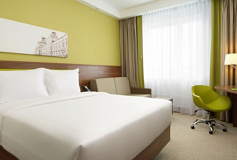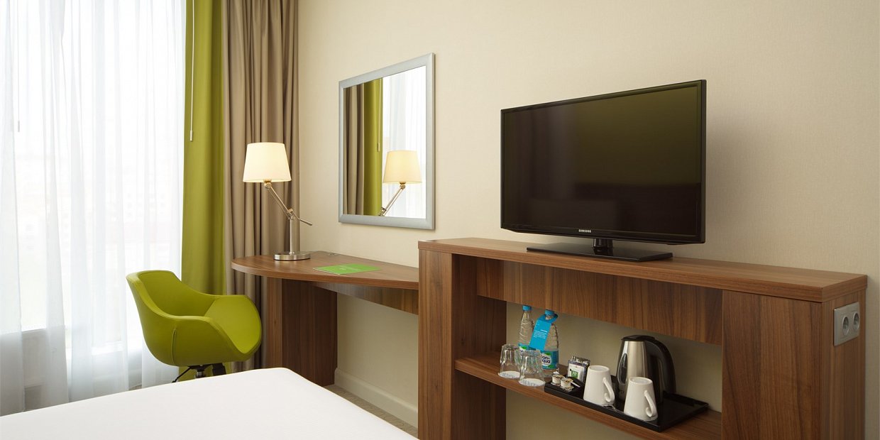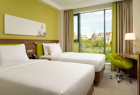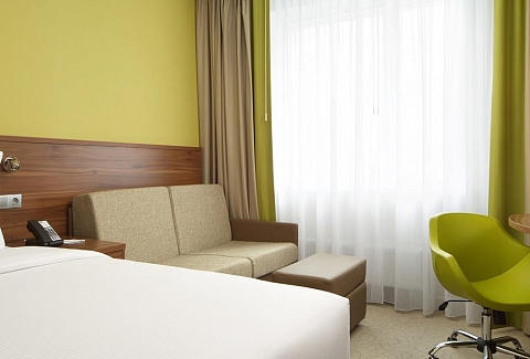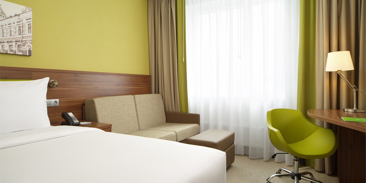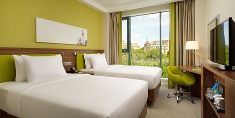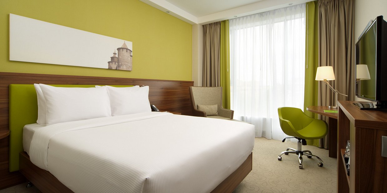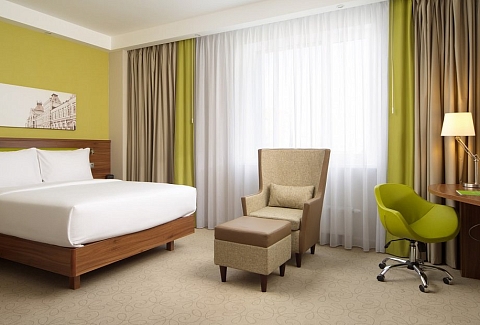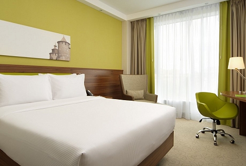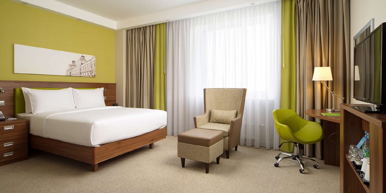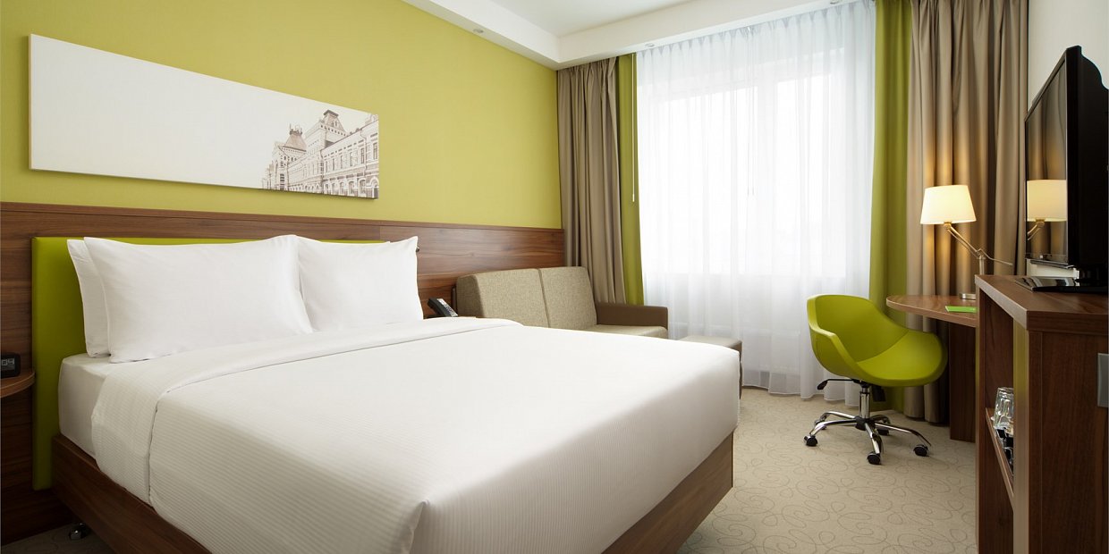 К услугам гостей 184 номера. Во всех номерах - удобные кровати с гипоаллергенным постельным бельем, гладильная доска с утюгом, подставка для багажа, принадлежности для приготовления чая и кофе, тапочки, сейф, фен, косметика для душа, система климат-контроля, высокоскоростной беспроводной интернет. В отеле Hampton by Hilton Nizhny Novgorod» к услугам гостей ресторан, круглосуточно работает лобби-бар.