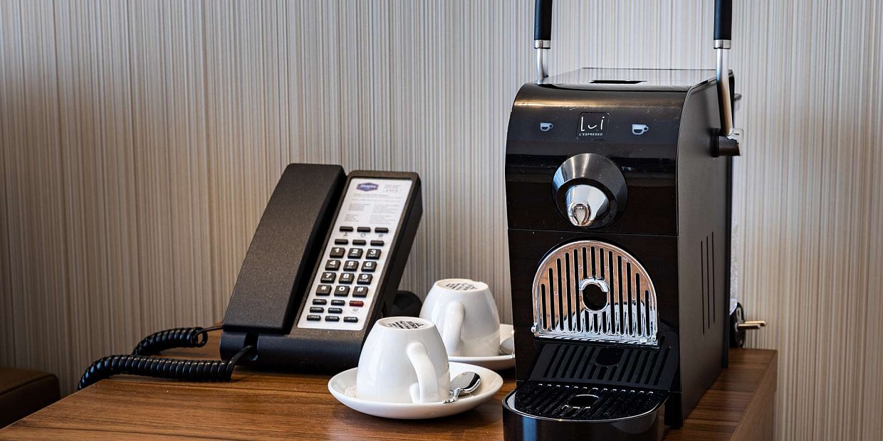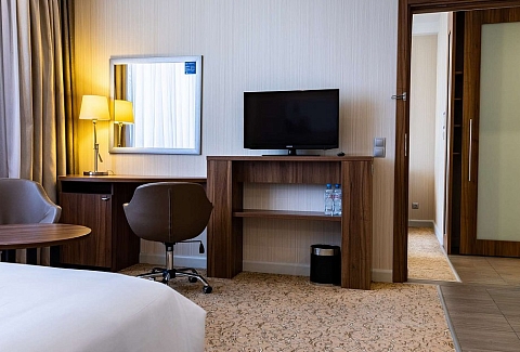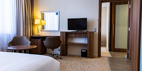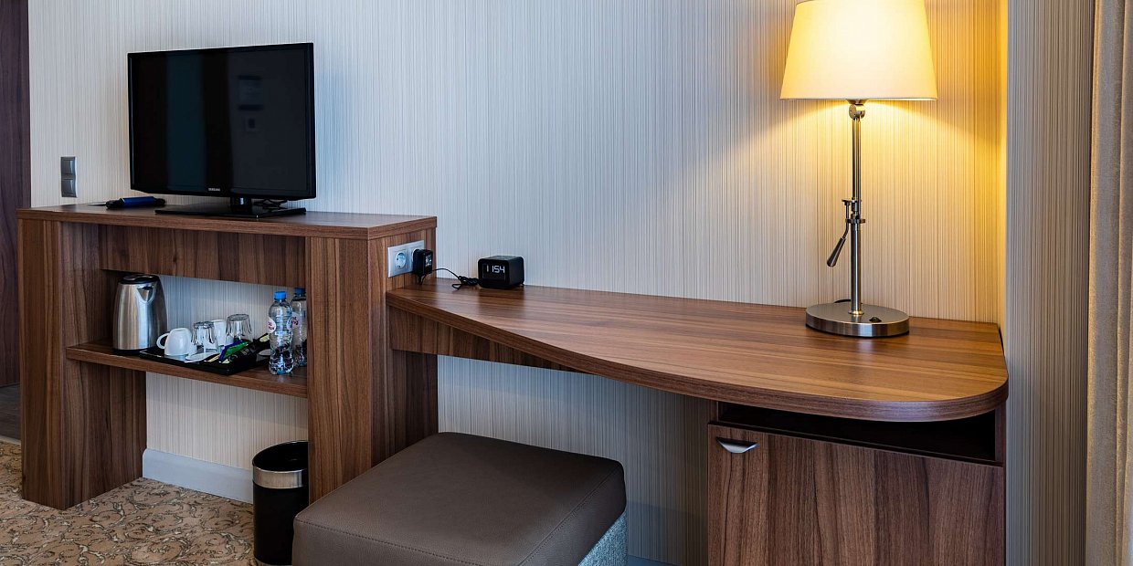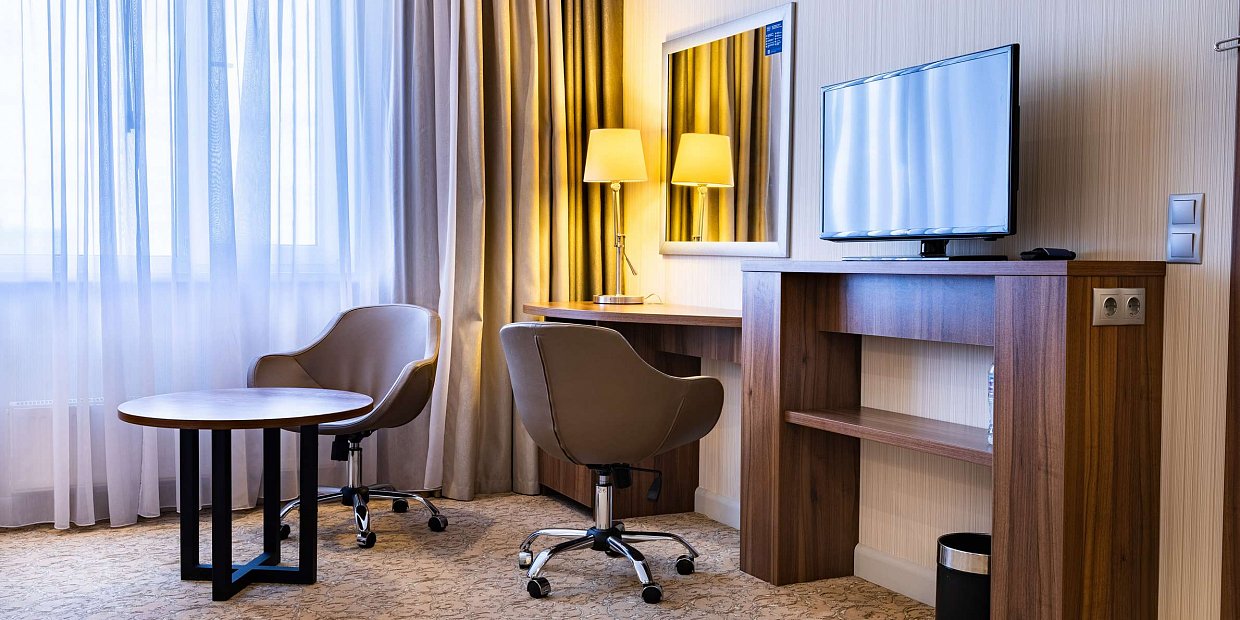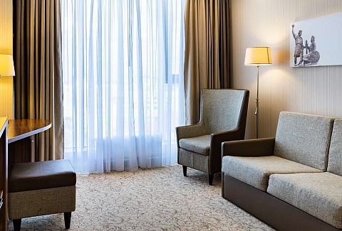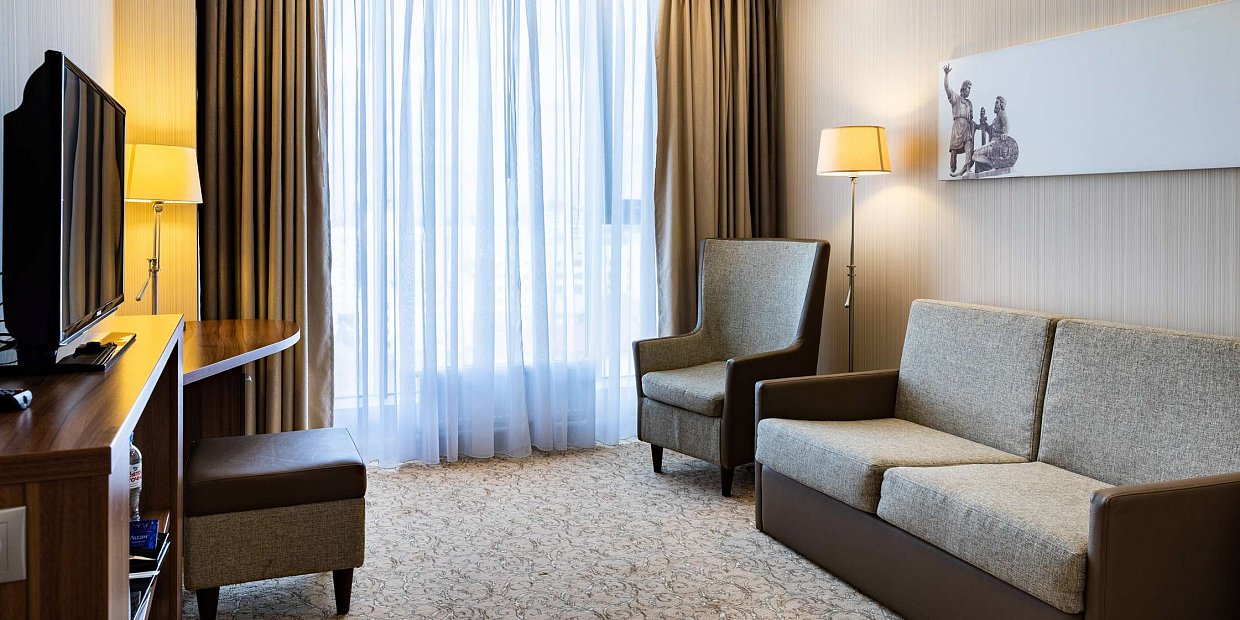В номере: вешалка, диван раскладной, зеркало, кресло, кровать двуспальная, прикроватные тумбочки, стол, стул, шкаф, кофемашина, сейф, телевизор, утюг, чайник