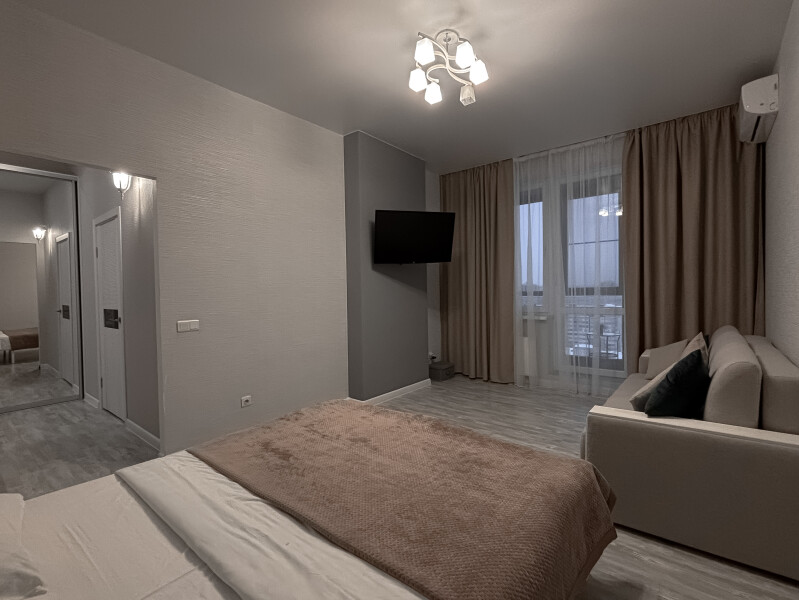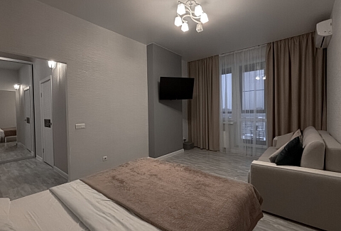 В номере: диван раскладной, кровать двуспальная, прикроватные тумбочки, стол, стулья, шкаф, гладильная доска, кондиционер, микроволновая печь, набор посуды, плита электрическая, стиральная машина, телевизор, утюг, холодильник, чайник