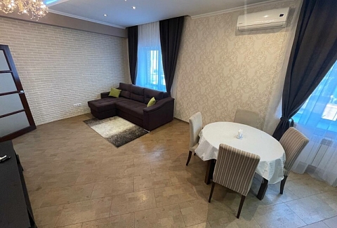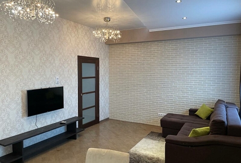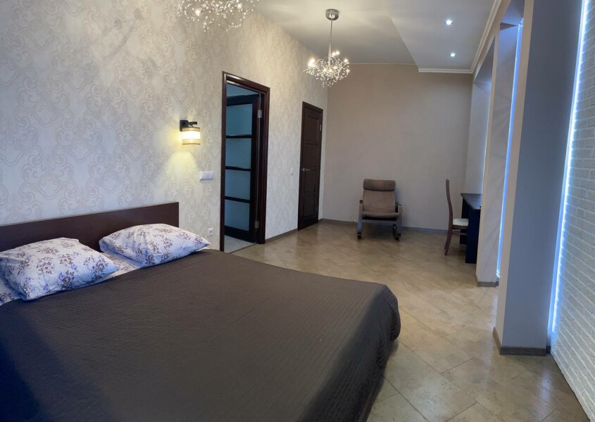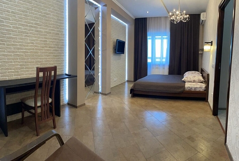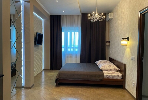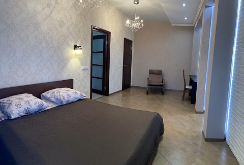 В номере: диван раскладной, кровать двуспальная, прикроватные тумбочки, стол, стулья, шкаф, гладильная доска, микроволновая печь, набор посуды, плита электрическая, стиральная машина, телевизор, утюг, холодильник, чайник