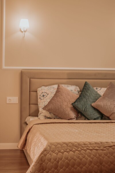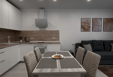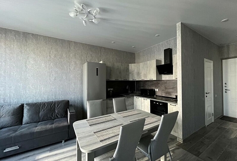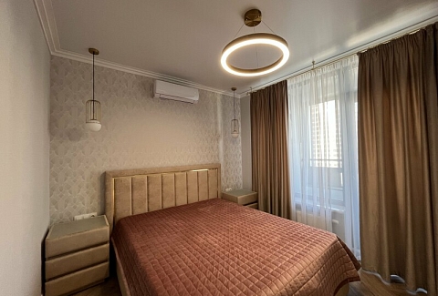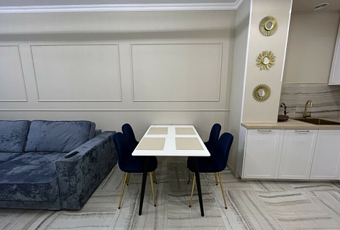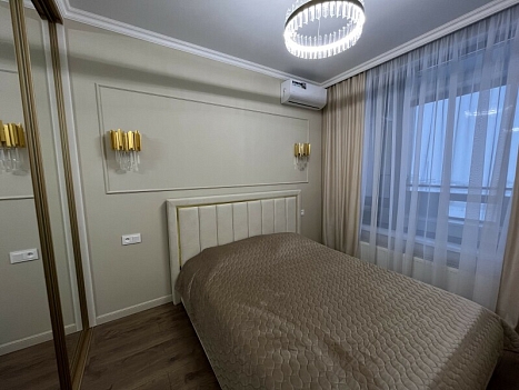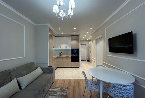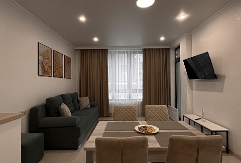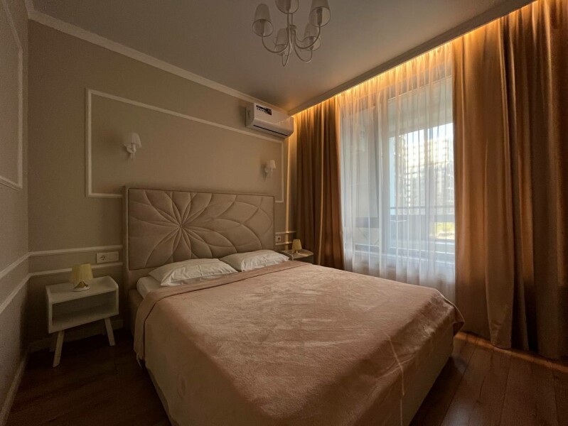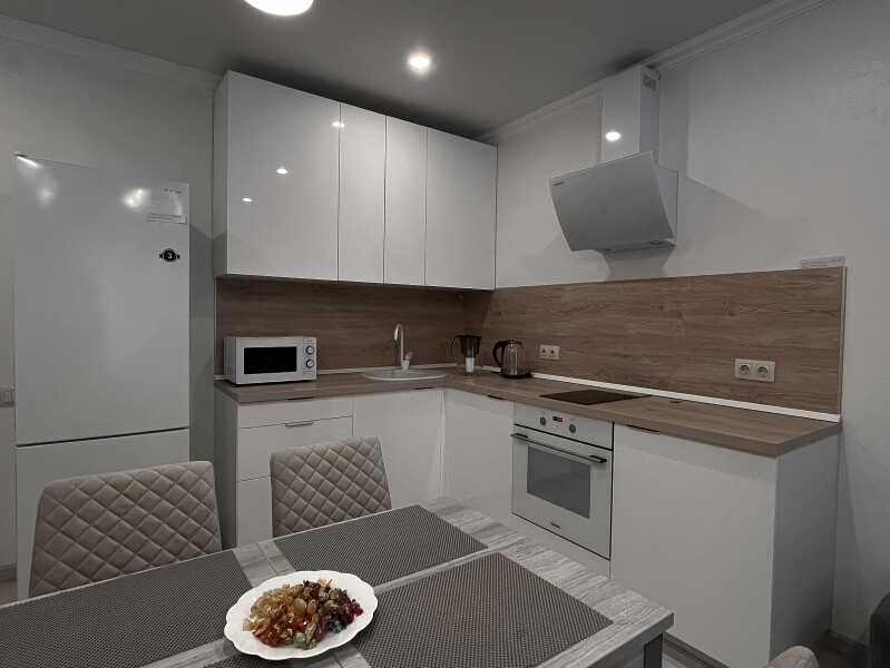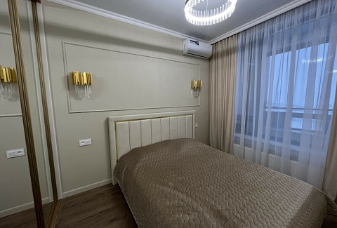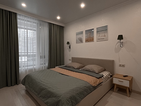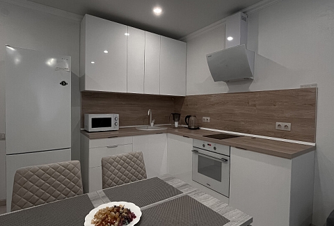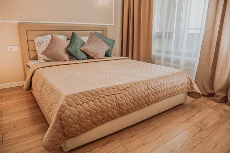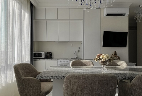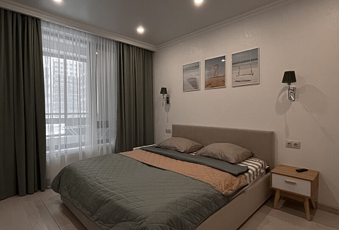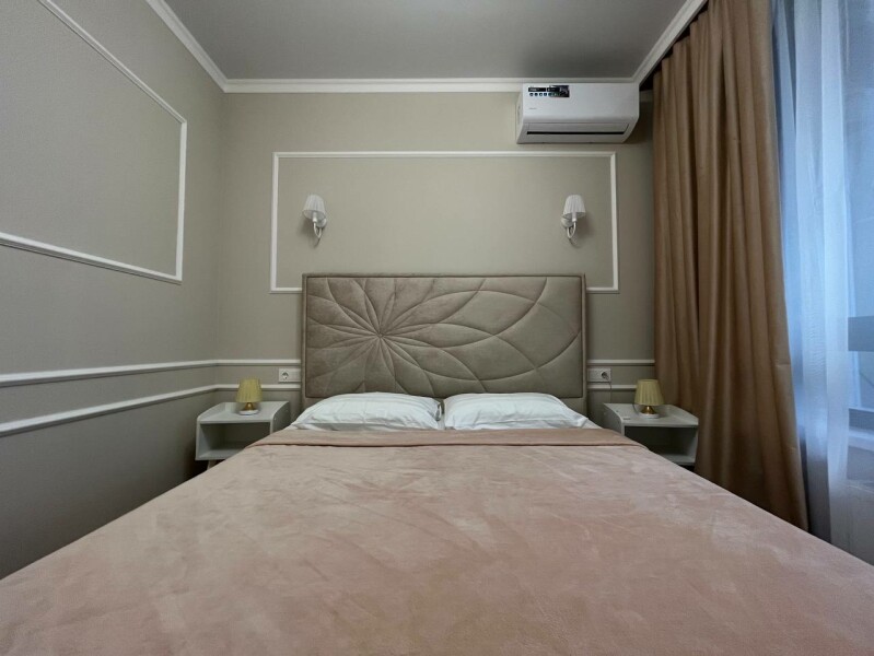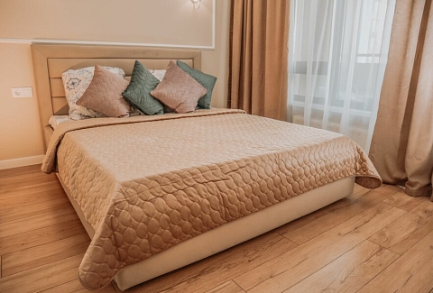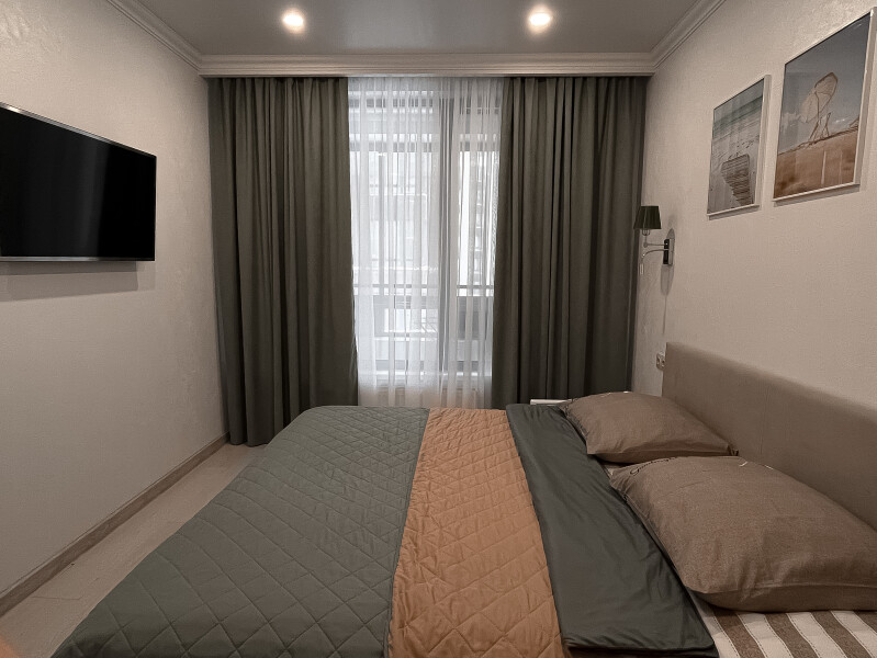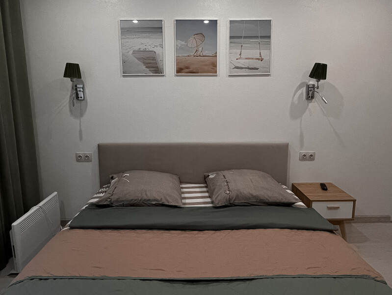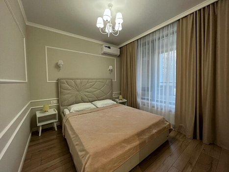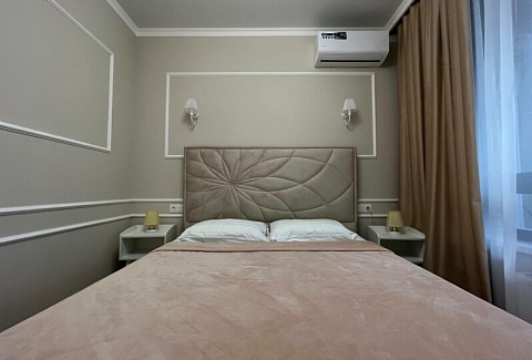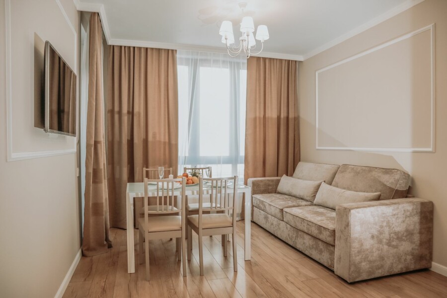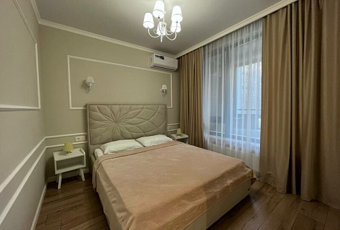 В номере: диван раскладной, кровать двуспальная, прикроватные тумбочки, стол, стулья, шкаф, гладильная доска, кондиционер, микроволновая печь, набор посуды, плита электрическая, стиральная машина, телевизор, утюг, холодильник, чайник
