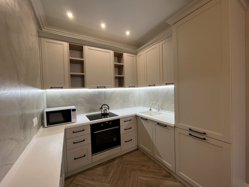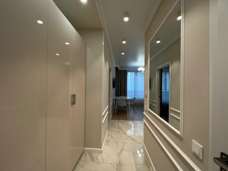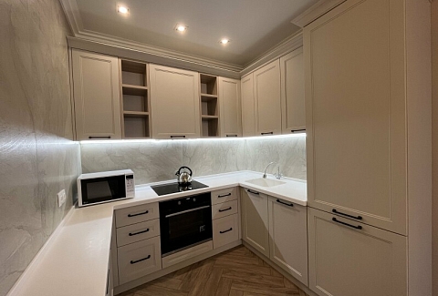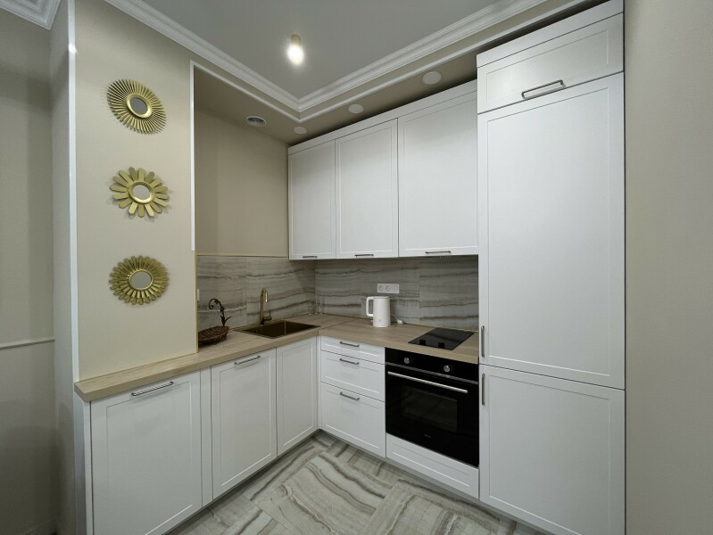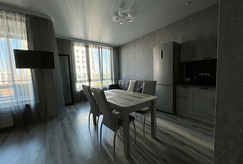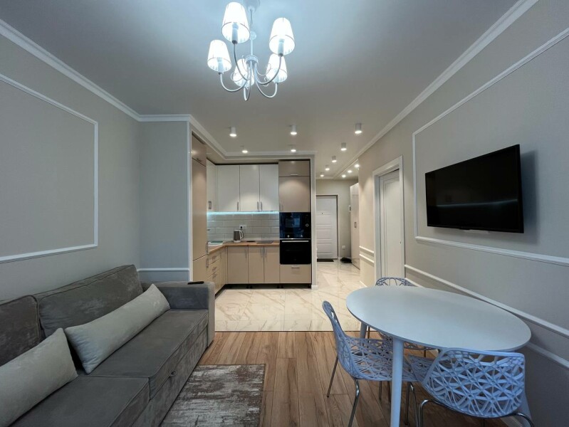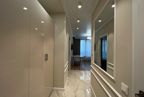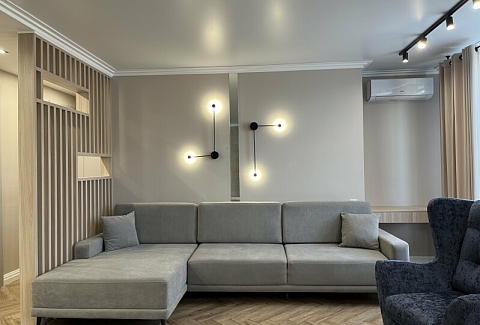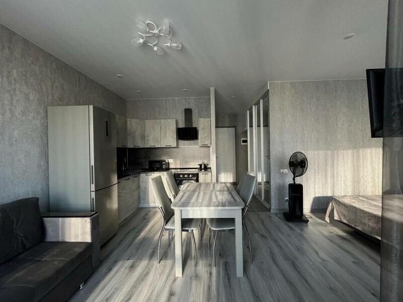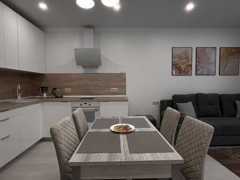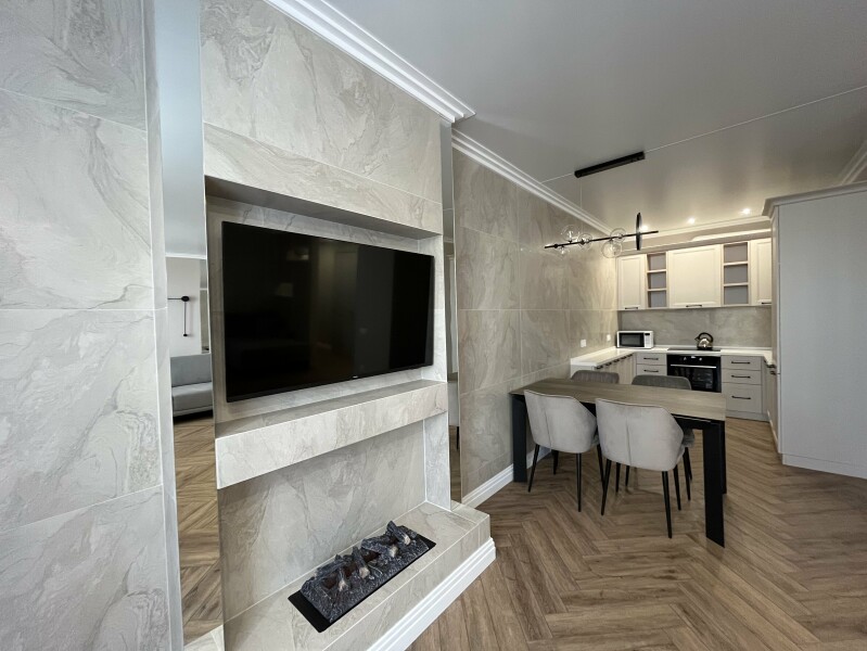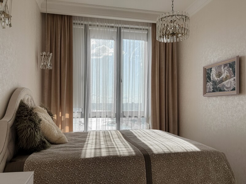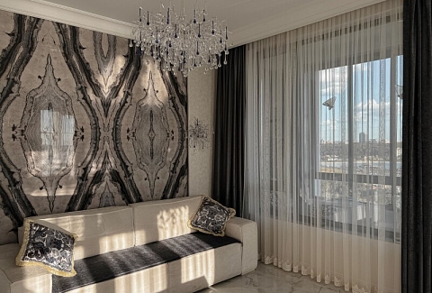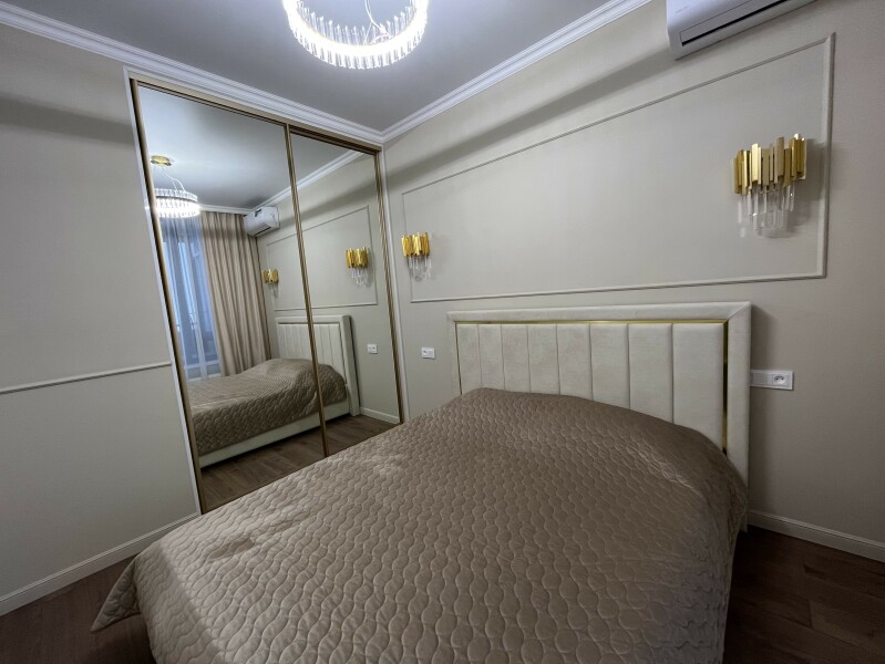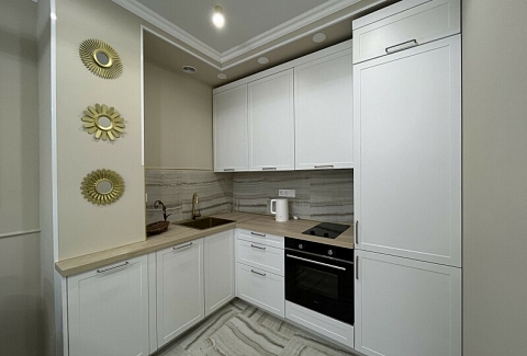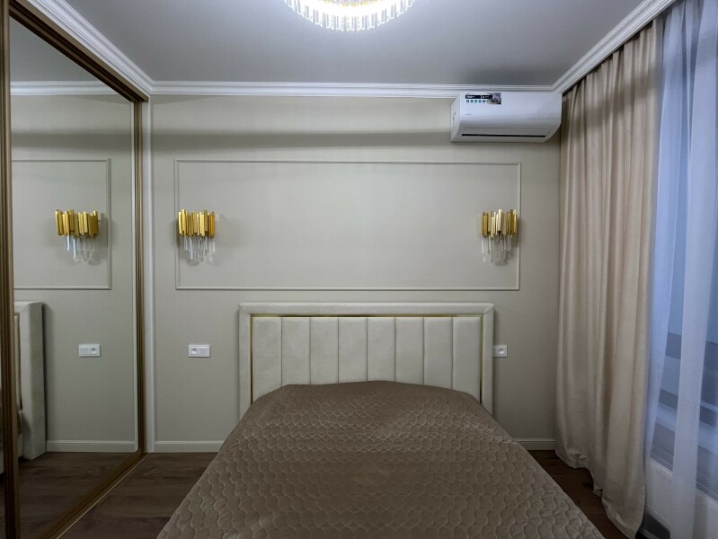 В номере: диван раскладной, кровать двуспальная, прикроватные тумбочки, стол, стулья, шкаф, гладильная доска, кондиционер, микроволновая печь, набор посуды, плита электрическая, стиральная машина, телевизор, утюг, холодильник, чайник