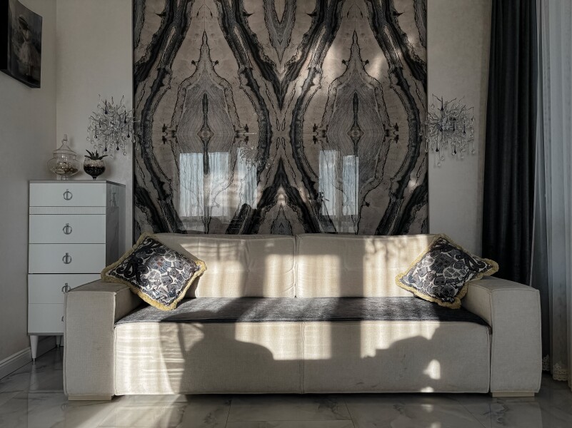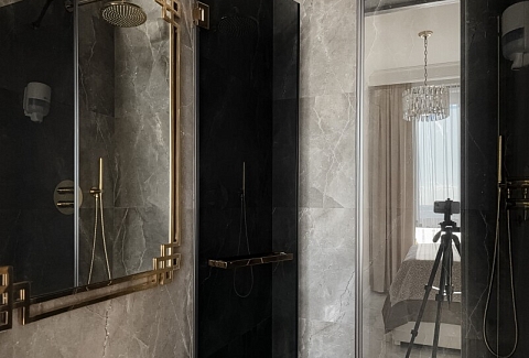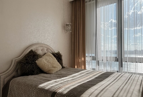 В номере: диван раскладной, кровать двуспальная, прикроватные тумбочки, стол, стулья, шкаф, гладильная доска, духовой шкаф, кондиционер, микроволновая печь, набор посуды, плита электрическая, стиральная машина, телевизор, утюг, холодильник, чайник