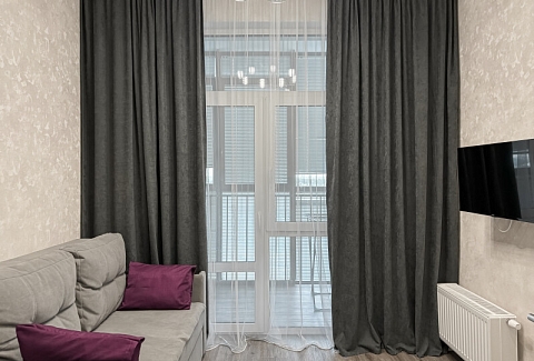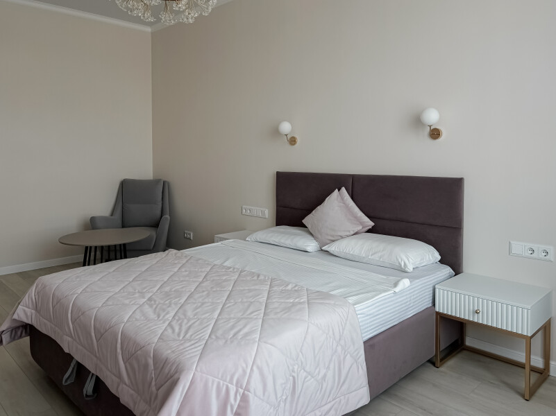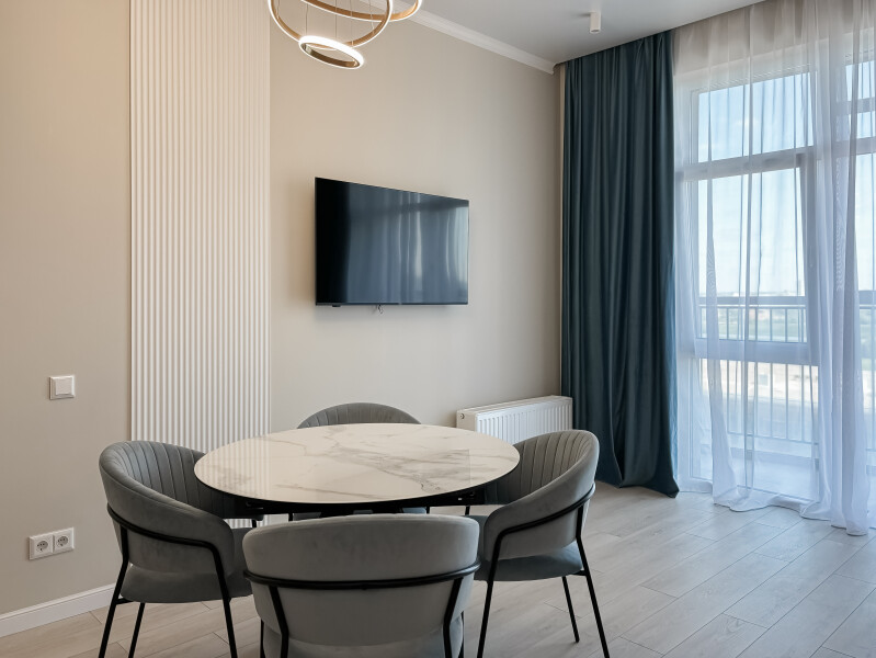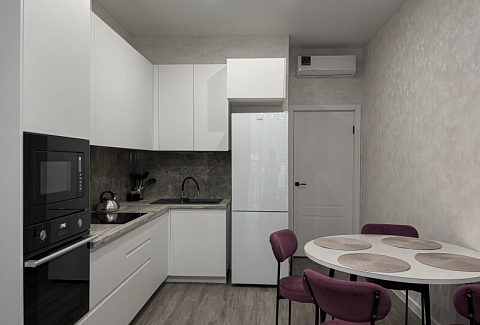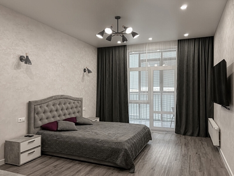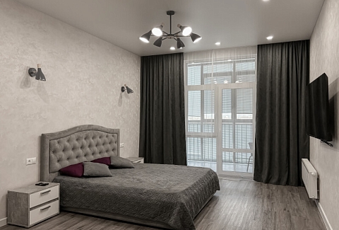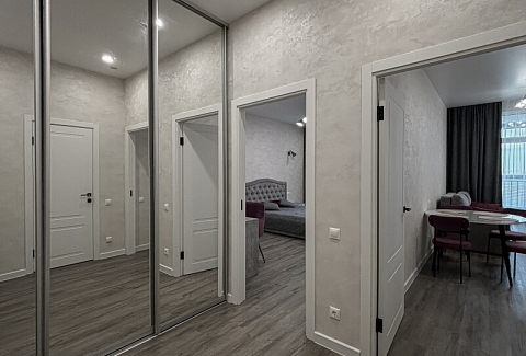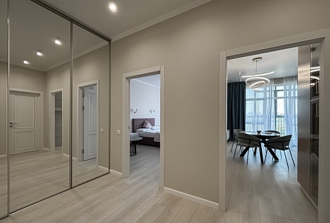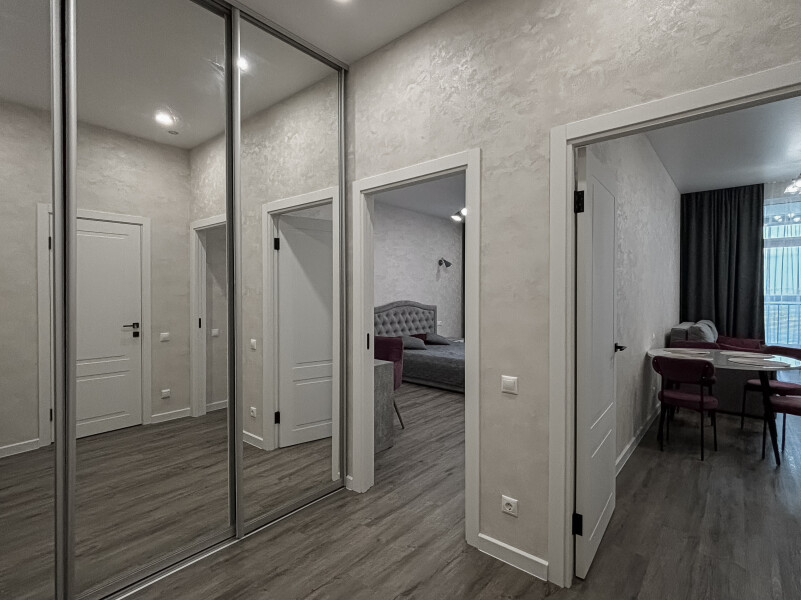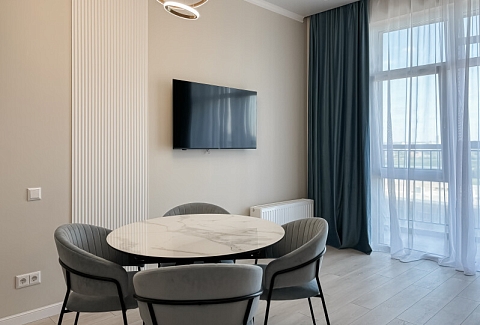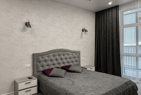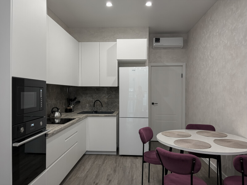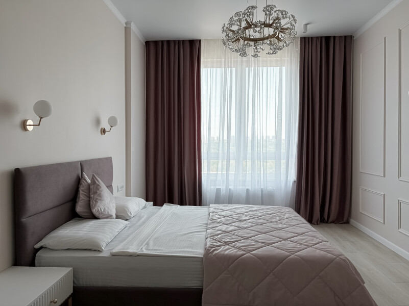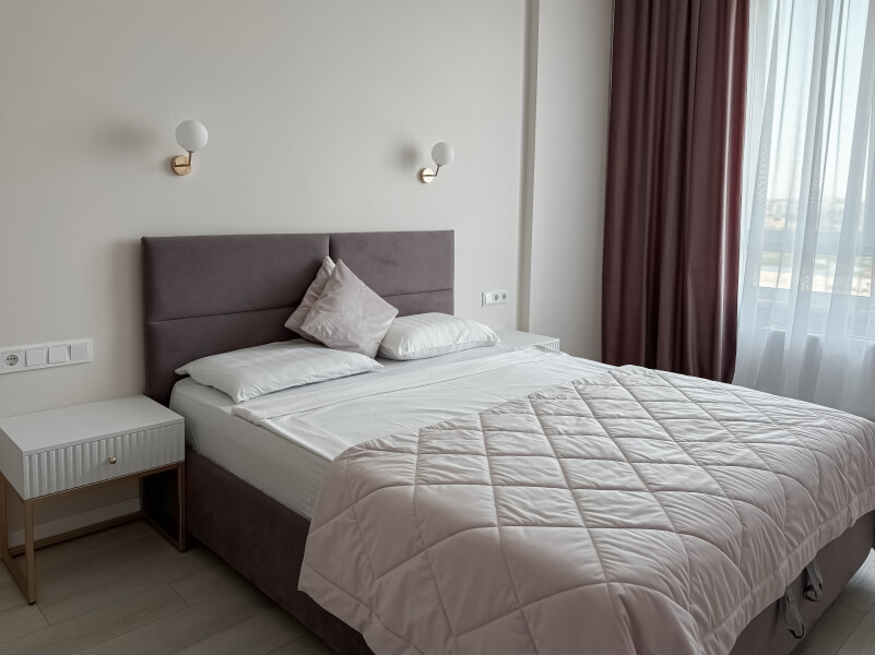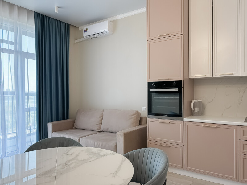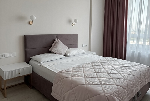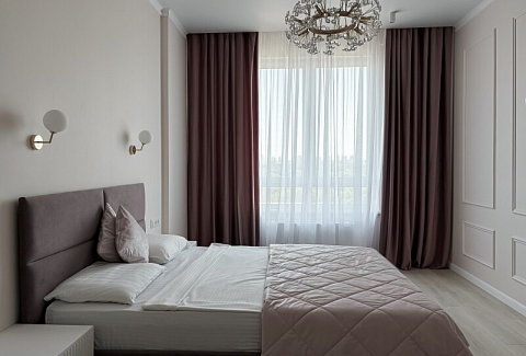 Сеть включает 2 варианта проживания со схожими планировкой и обустройством. В каждом оборудована уютная отдельная спальня с большой удобной кроватью и телевизором. Обе кухни включают рабочее пространство со всем необходимым для самостоятельной готовки, столовую группу с круглым столом и мягкими креслами, компактный диван. В прихожих встроен вместительный шкаф-купе с зеркалами. Санузлы объединенные, каждый дополнен стиральной машиной. В апартаментах работает беспроводной интернет.