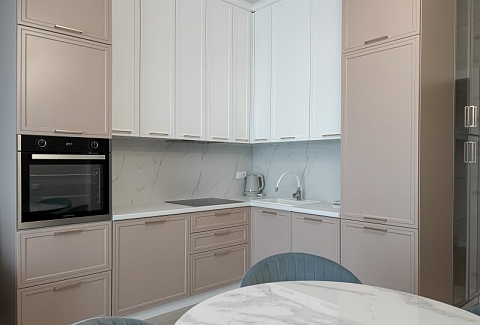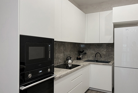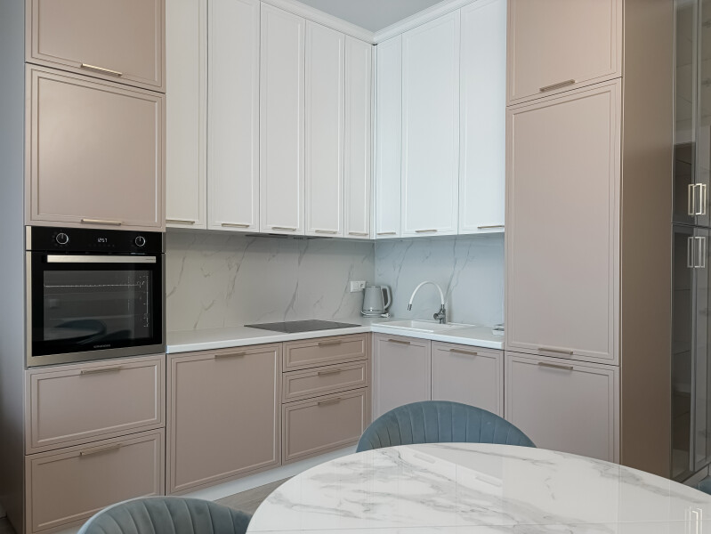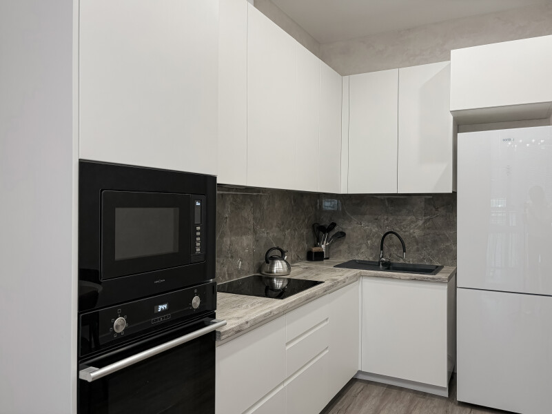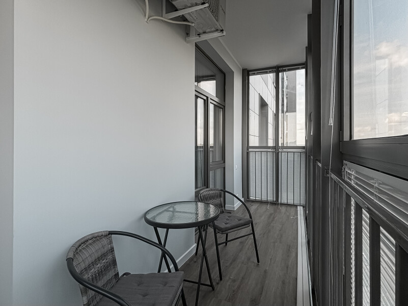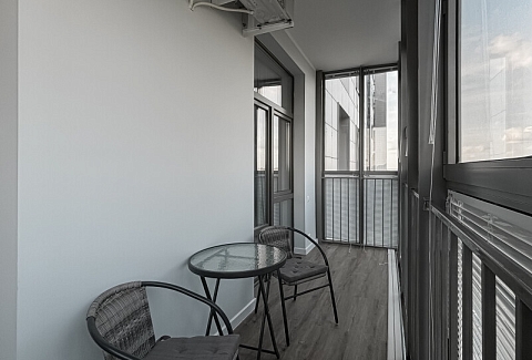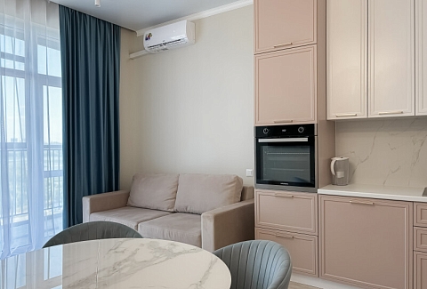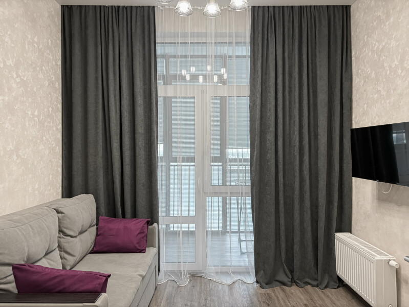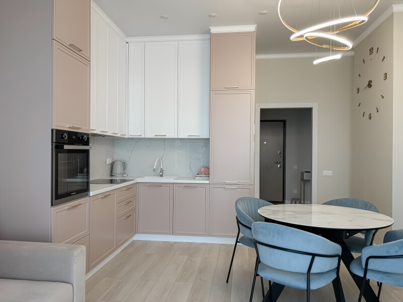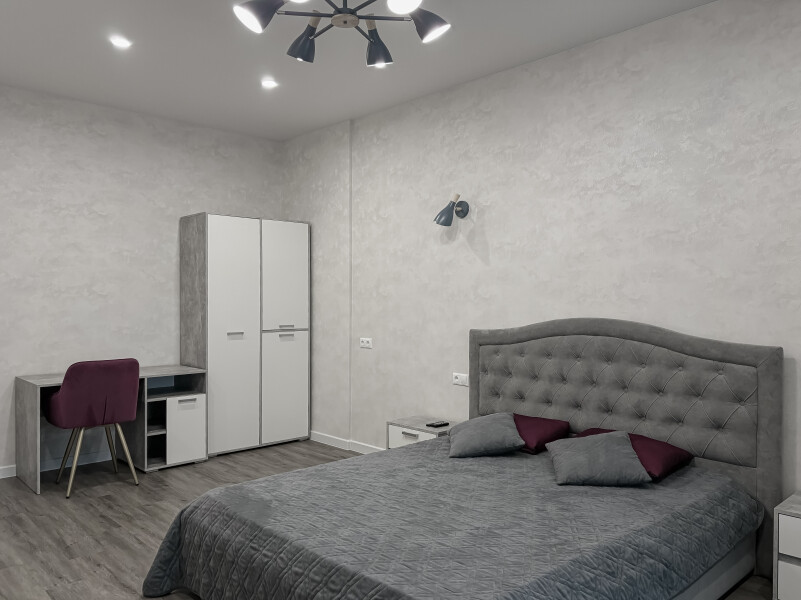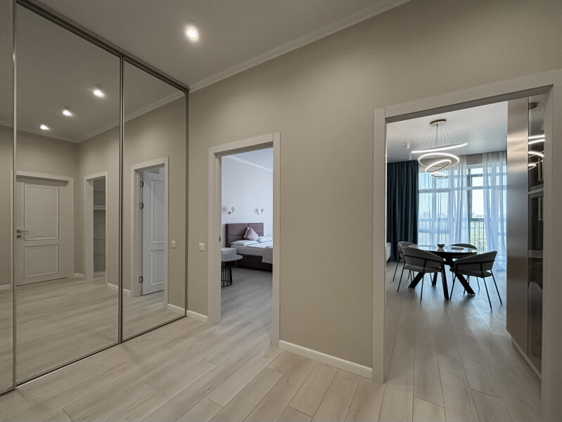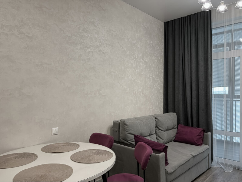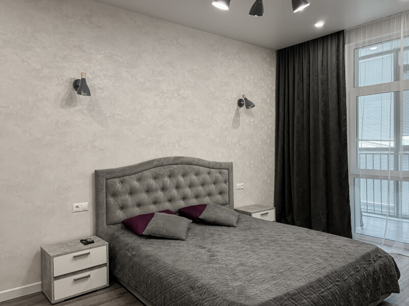 Сеть включает 2 варианта проживания со схожими планировкой и обустройством. В каждом оборудована уютная отдельная спальня с большой удобной кроватью и телевизором. Обе кухни включают рабочее пространство со всем необходимым для самостоятельной готовки, столовую группу с круглым столом и мягкими креслами, компактный диван. В прихожих встроен вместительный шкаф-купе с зеркалами. Санузлы объединенные, каждый дополнен стиральной машиной. В апартаментах работает беспроводной интернет.